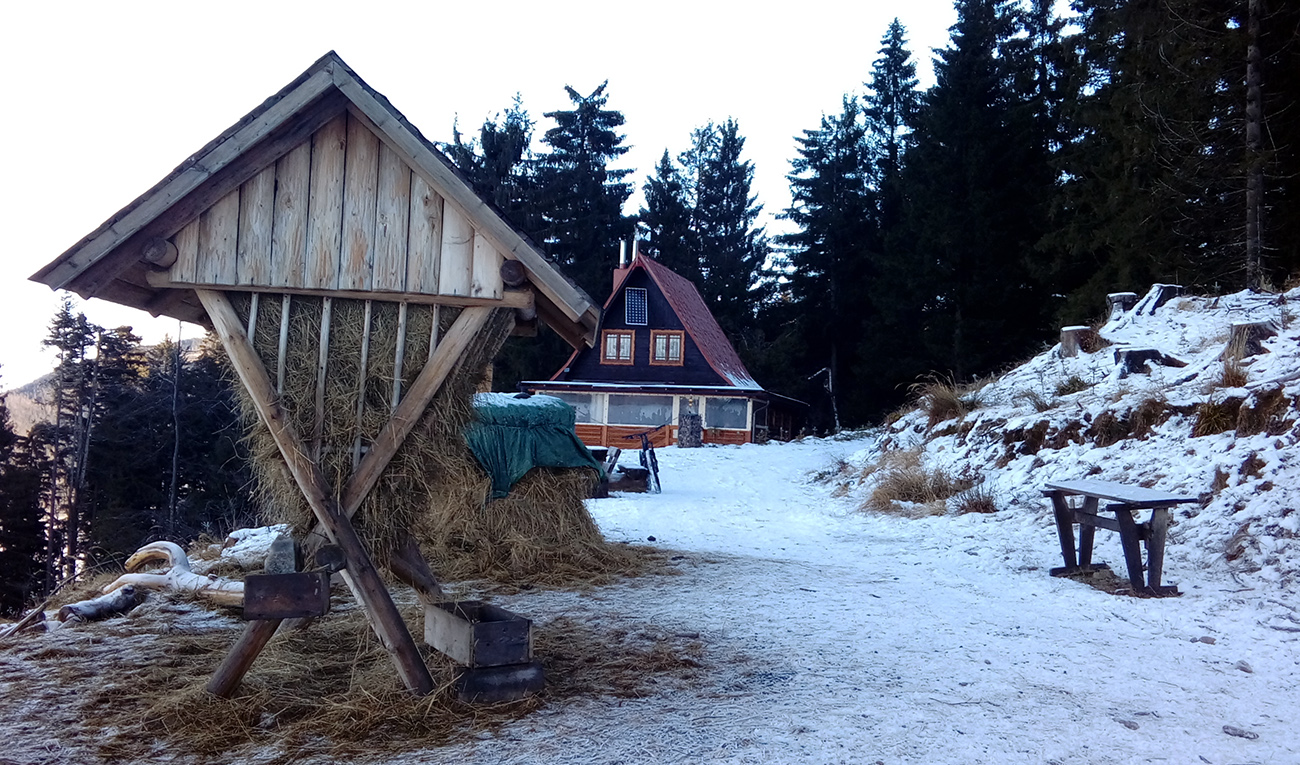 Takže sedlo Kobylie, celé v lese. Ďalej po zelenej smerom do Turia sa mi už nechce, ani času niet. Pre návrat je tu ale jedna alternatíva – traverzový chodník ku poľovníckej chate Sačné. Neznačený síce, ale zo sedla sa odpája zreteľne. Príjemný, sem tam s výhľadmi cez rúbanisko. Podobne aj pri chate, ktorá je poriadne vypipľaná, ako dáke rekreačné stredisko. A dá sa pri nej fajná voda nabrať z prameňa.
