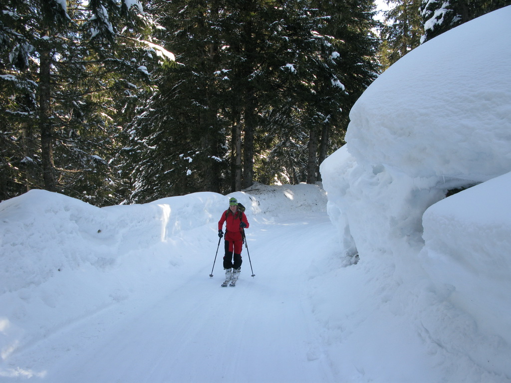 Boli sme tu omrknúť terén už minulý rok, vtedy bolo ale málo snehu, tak sme využili možnosť a nechali sme sa vyviezť na chatu Kolm Saigurn vo výške 1586m. Dnes prechádzame s lyžami v ruke ráno po ôsmej okolo rampy. Na chatára a jeho terénne auto tu čaká už početná skupinka skialpinistov. Je krásny deň a je sobota. Tí, ktorí to nestihli včera na chatu, sa na ňu nechávajú vyviezť ráno a od nej vyrážajú na vrchol.