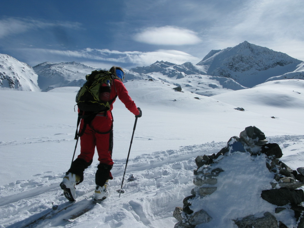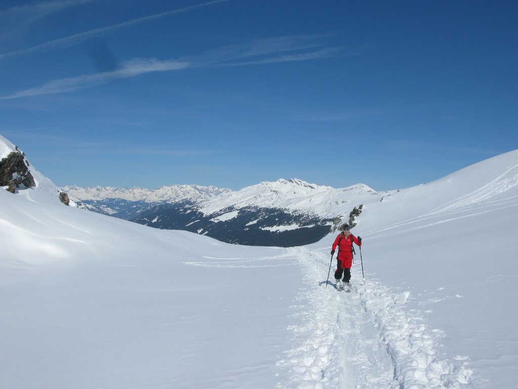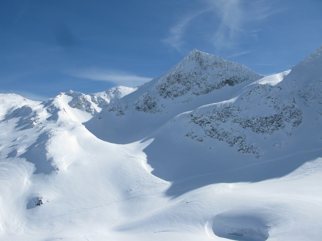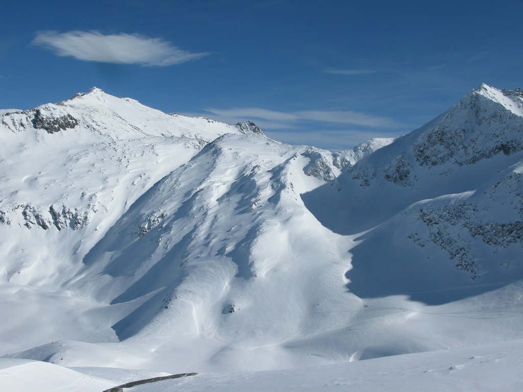 Zastavujeme na vyvýšenine v strede doliny. Všade naokolo je na čo pozerať. Spoza hrebeňa vykukuje trojtisícovka Schareck aj so svojim lyžiarskym strediskom. Prístup k nemu je z juhu. Na vrchol by sa však dalo vystúpiť po prekonaní hrebeňa aj odtiaľto - a máme ďalší projekt do budúcnosti :)