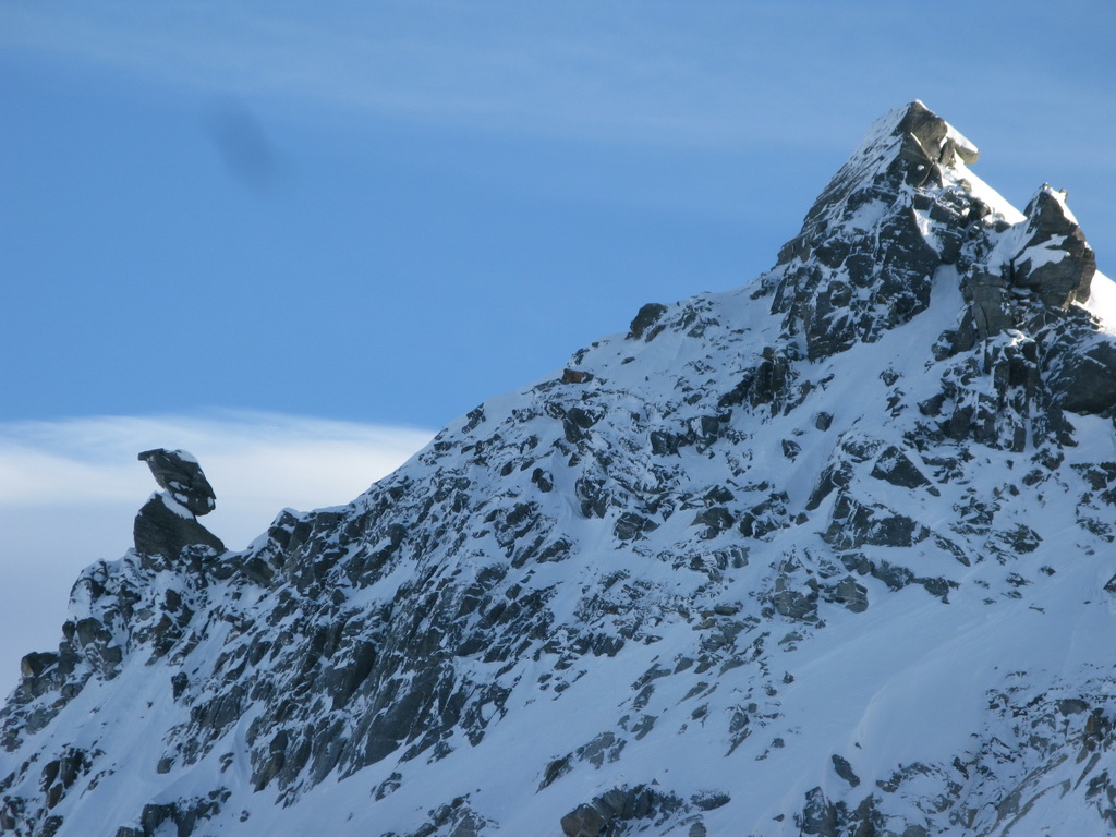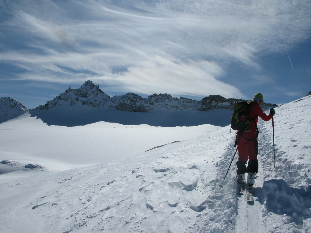 Počas celého nášho výstupu sme stretávali skialpinistov, lyžujúcich dole. Tesne pod vrcholom stretávame ešte jednu skupinku, púšťajúcu sa práve do zjazdu.