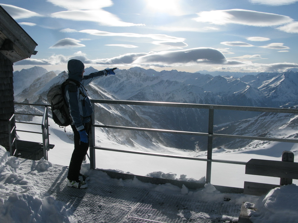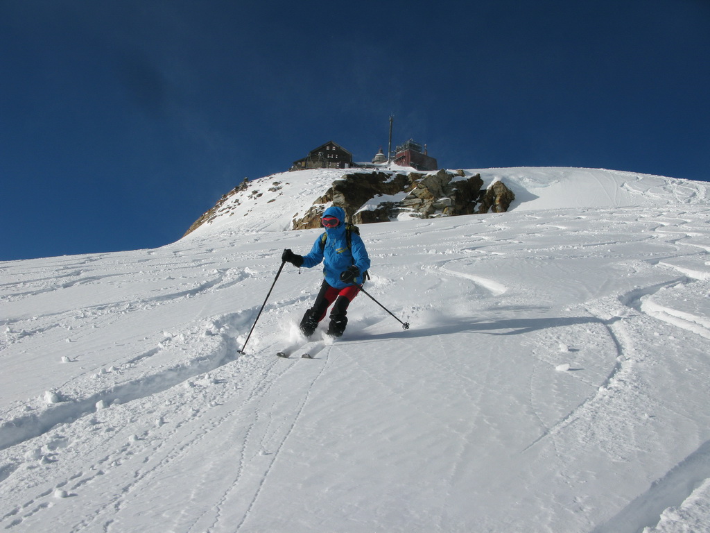 Počasie je krásne a vyzerá byť aj stabilné. Na vrchole je chata a observatórium. Vedie sem zásobovacia nákladná lanovka. Na chate je len jedna dvojka, chystajúca sa práve lyžovať dole. Hovoria nejakým balkánskym jazykom :))