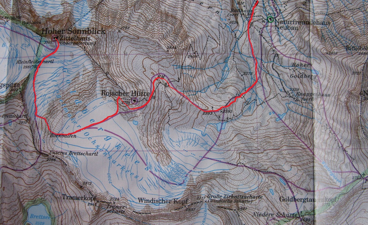 Občerstvíme sa, odľahčujeme batohy a vydávame sa po stope, smerom na vrchol Hoher Sonnblick. Prichádzame ku križovatke stôp. Odbočujeme vpravo, nastúpame asi sto výškových metrov, keď sa nám otvorí výhľad na strmý, exponovaný traverz.