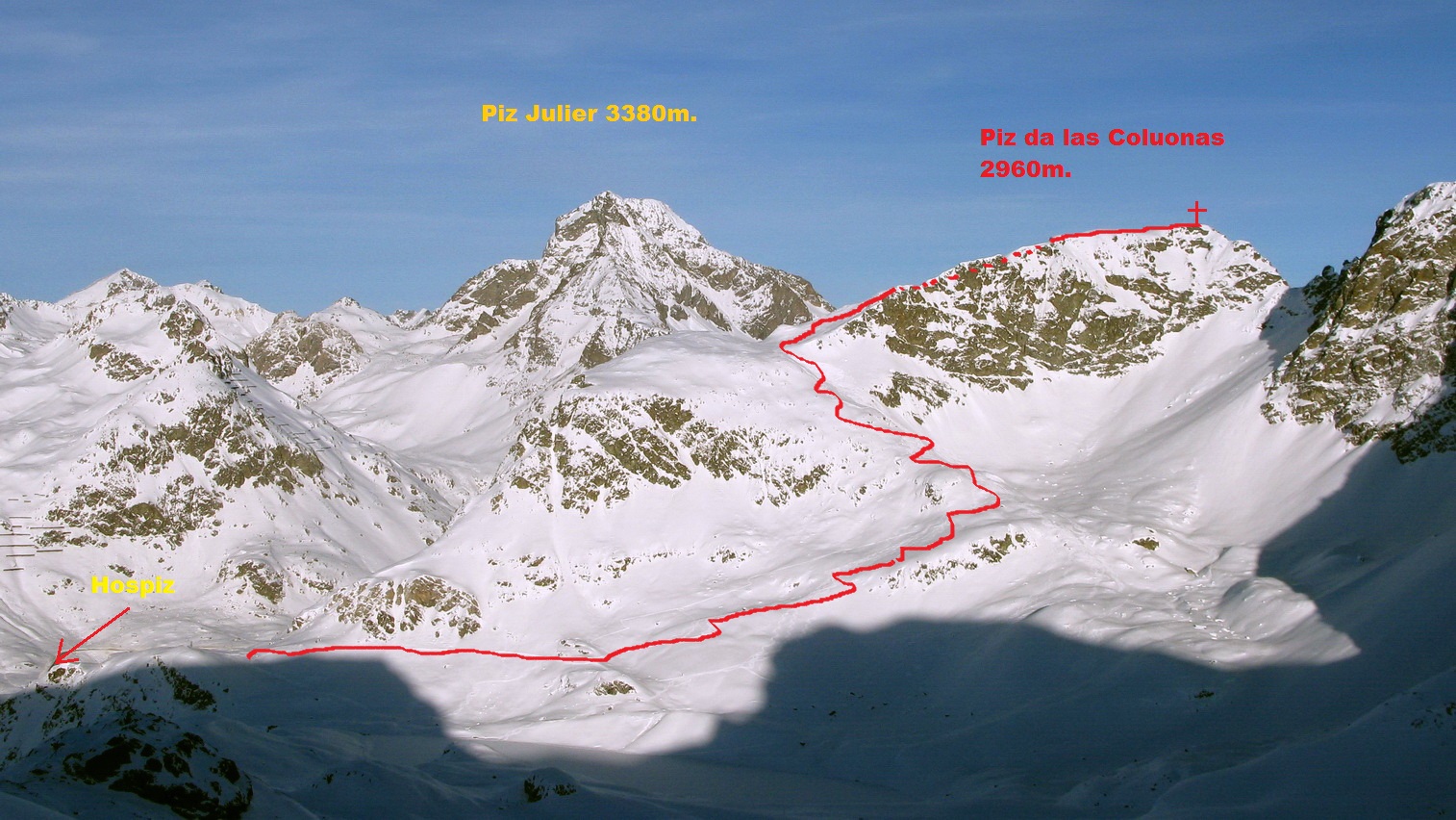 Jednou z obľúbených ale aj najkrajších túr z Julierpassu je skialpová túra na Piz da las Coluonnas. Na túru vyrážame priamo od Hospizu La Veduta. Parkuje sa pred hostincom. Prejdeme na druhú stranu cesty a následuje mierny výšľap na pahorok na úpätí samotného kopca Coluonnas. Odtiaľto vidíme jazero Grevasalvas ale nepôjdeme k nemu dole. Následuje traverz úbočím vľavo a následne naberanie výšky až na hrebeň nášho cieľu: Piz da las Coluonnas.
