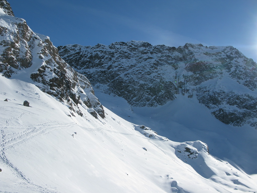 Ďalšie tipy: Z vrcholu Coluonnas vedú tri varianty už extrémnejších zjazdov (horná fotka). Uvidíte ich už z cesty až budete prichádzať v smere od St.Moritzu. Skúšať len v dobrých podmienkach!