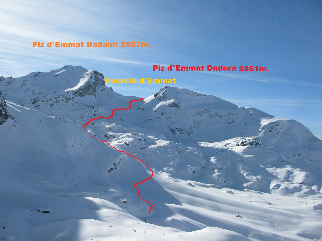 Po zjazde výstupovou trasou keď zídeme až dole ku jazeru Grevasalvas si ešte môžeme túru predĺžiť výstupom na zaujímavé kopčeky rovno oproti: Emmat Dadora a Emmat Dadaint. Tajným tipom je sedlo medzi nimi: Fuorcla Emmat, tam totiž vydrží najdlhšie prašan v celej oblasti...