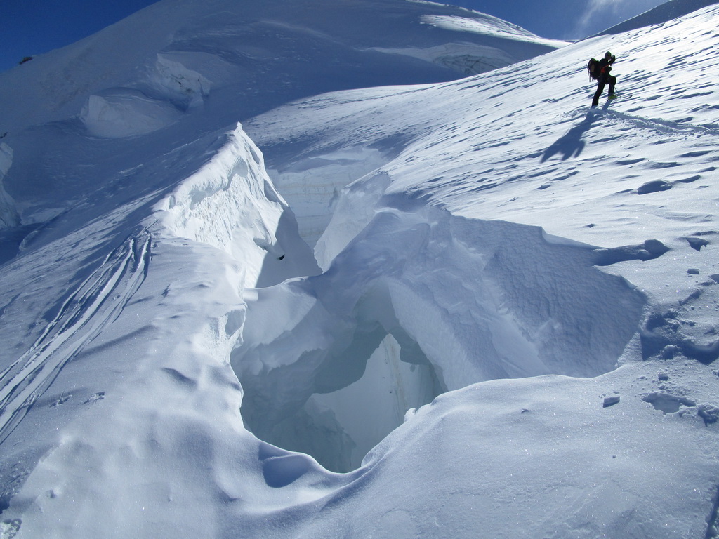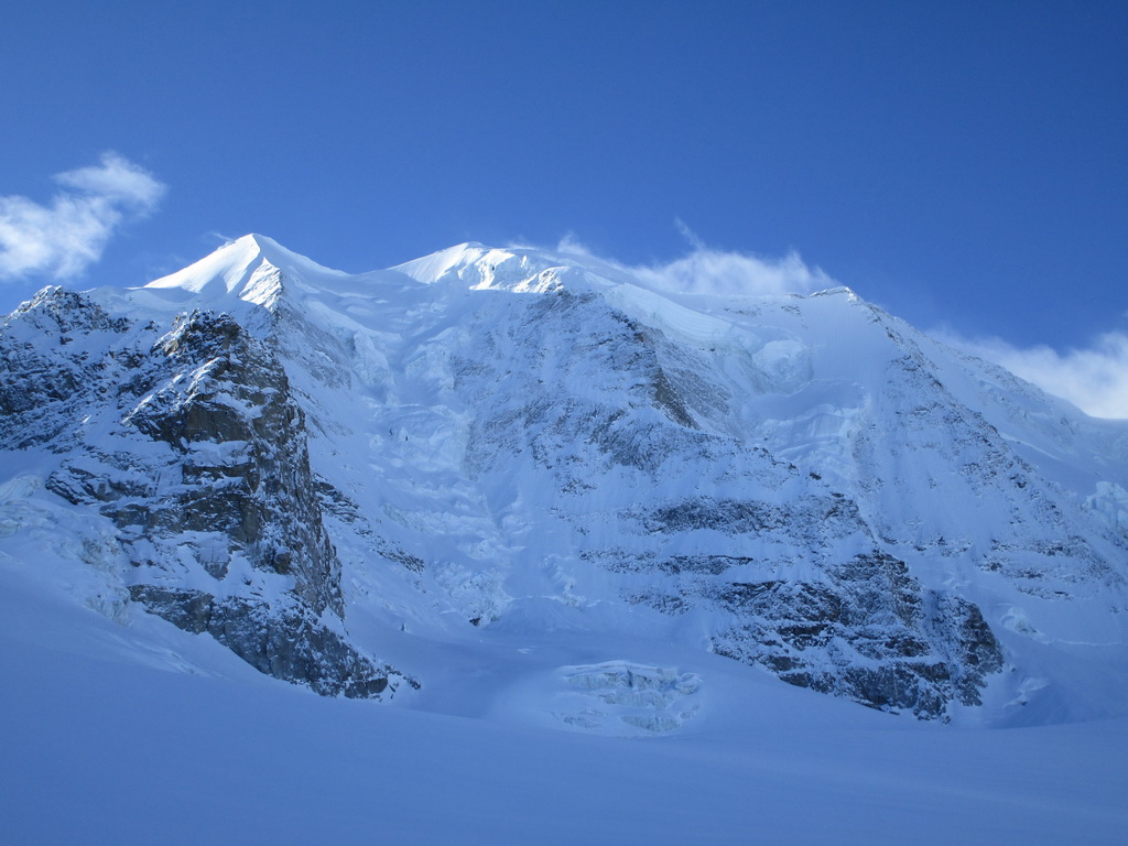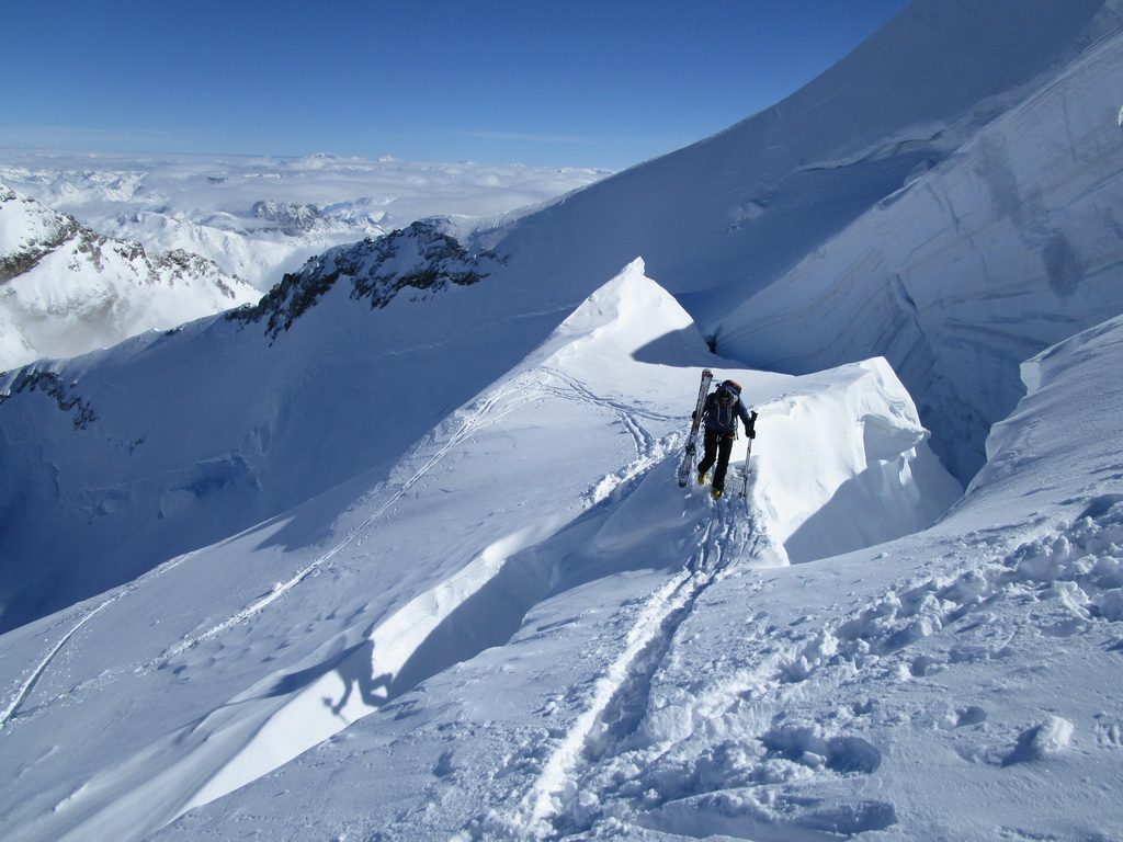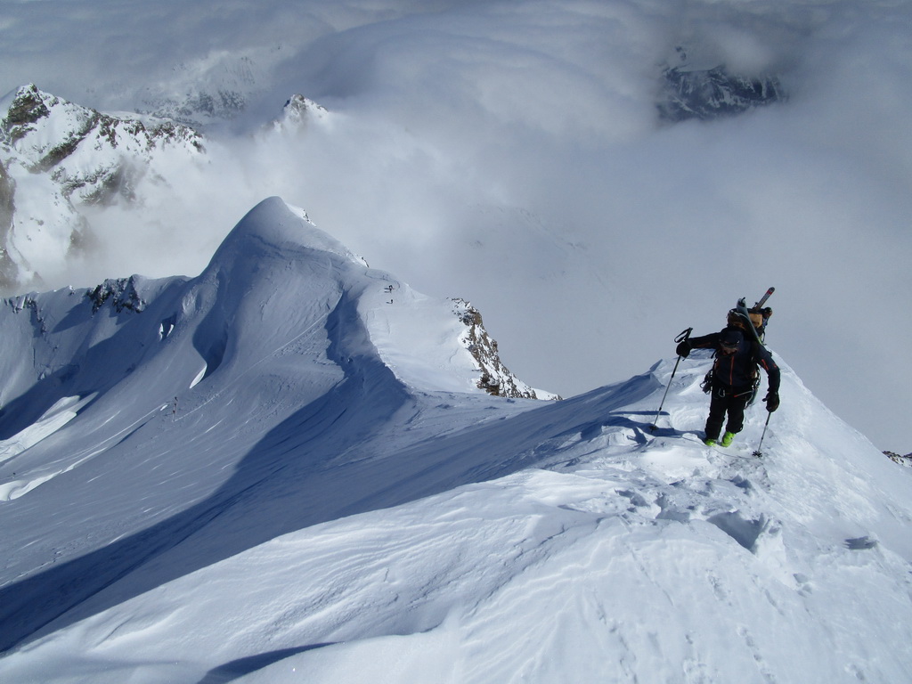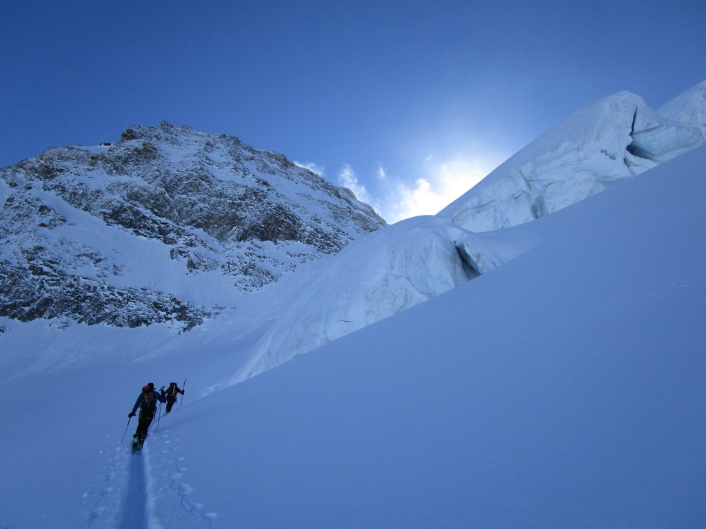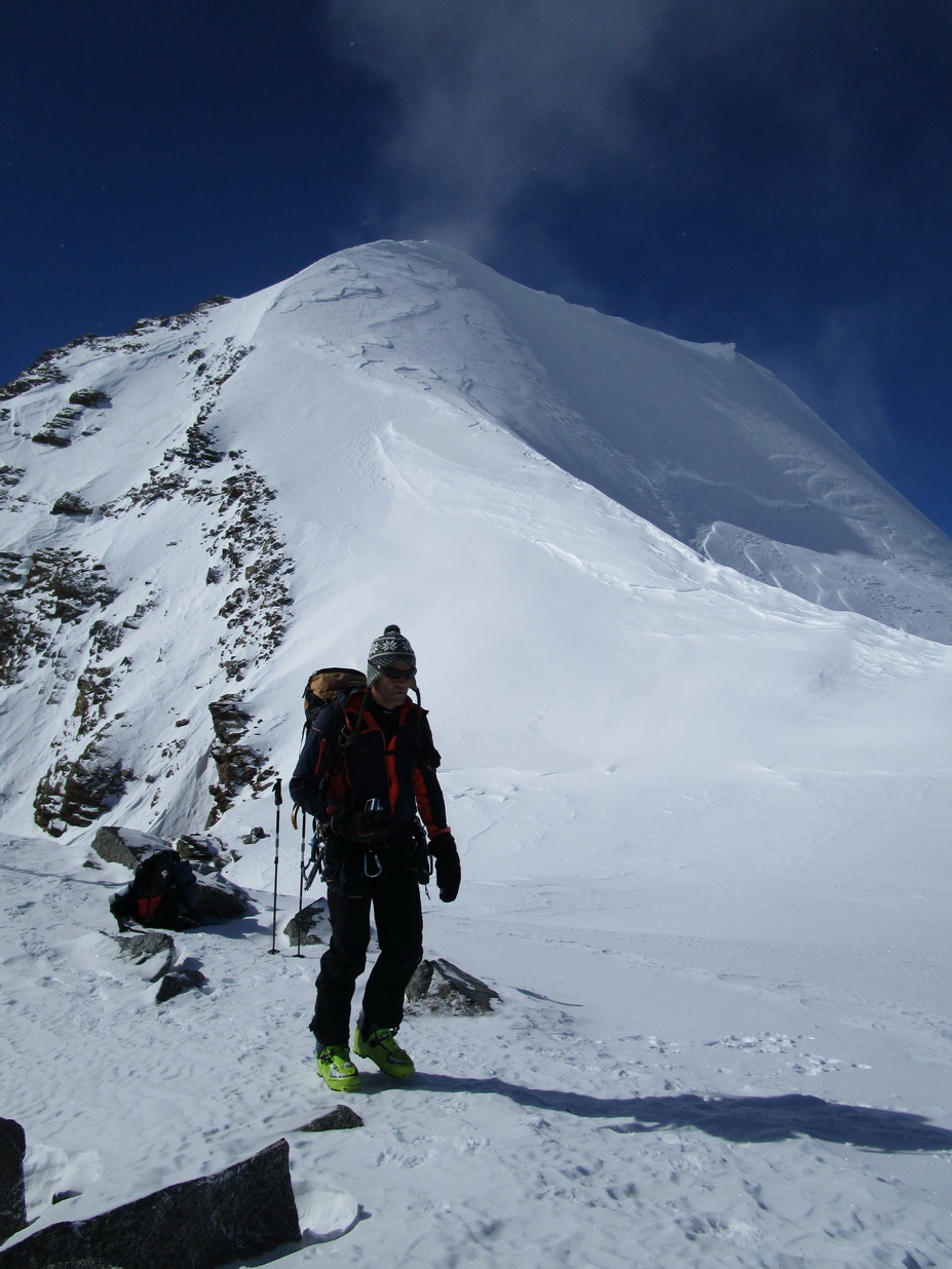 Dvíhajú sa mraky od juhu z talianskych dolín. Keď pôjdeme hore na vrchol riskujeme zjazd v zlej viditeľnosti hovorí Mauro. Mraky sa zastavujú o skalnú hradbu a náš ľadovec ostáva čistý. Poďme hore, vydrží to vravím chlapom, nerád sa otáčam kúsok pod vrcholom v takýchto podmienkach.