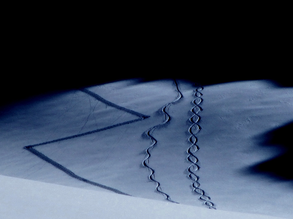 Lyžujeme dole v hlbokom čerstvom prašane, nalepíme pásy a po krátkej chvíli v stope odbočujeme. Miestami pol metra čerstvého snehu. Rozmýšlam, že to máme na dnes teda čo robiť.