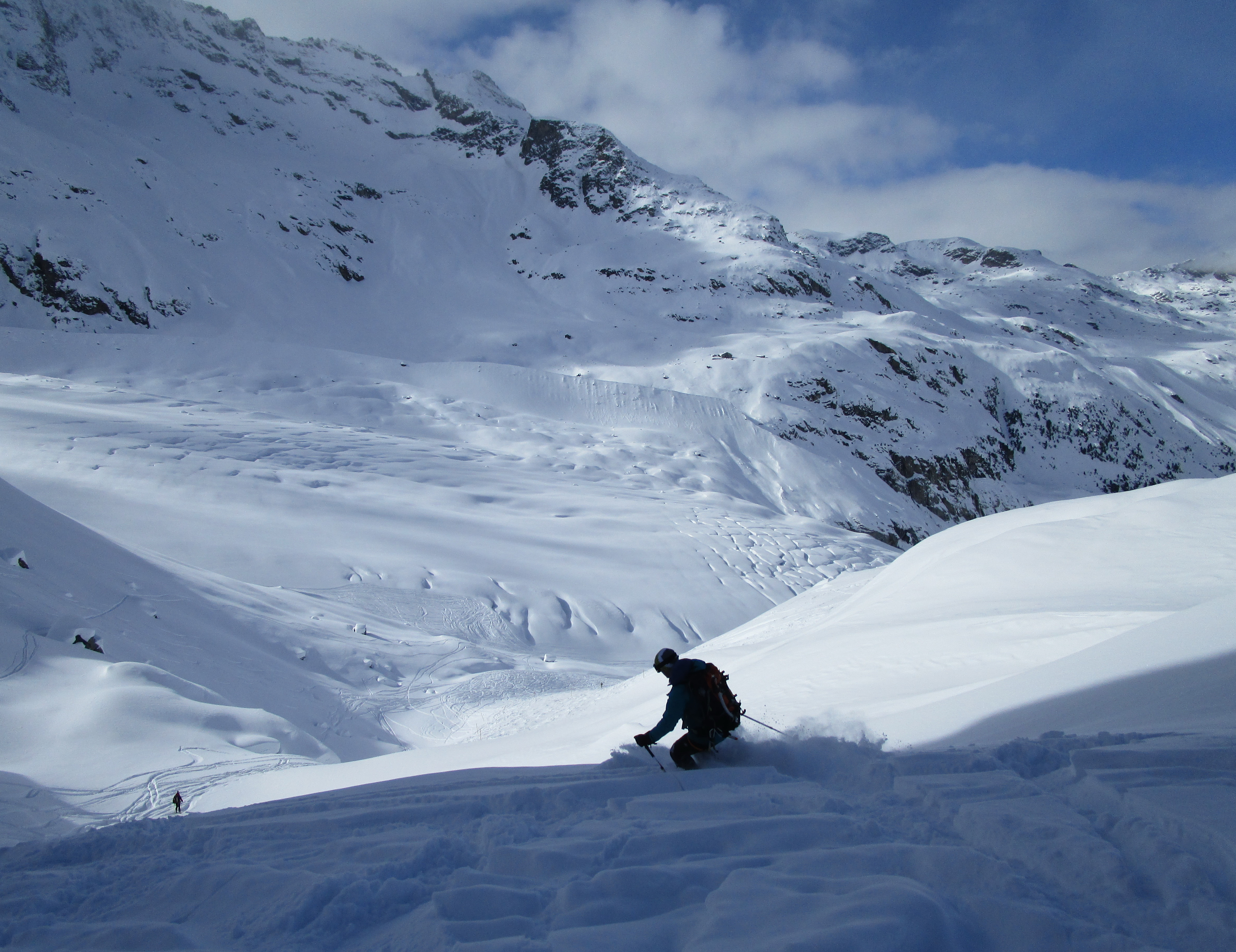 V sedle náš zjazd pozoruje skupina asi 10 ľudí. Keď prídem dole, Mauro je už zabratý do rozhovoru so známym horským vodcom. Po chvíli sa otáča ku mne a ukazuje mi niečo v ruke. Prichádza bližšie: "Vyzbierali sa nám za prešliapanie stopy!" Sa mi zdá, že som zle rozumel, asi žartoval. Uverím mu až keď mi to dole v reštike znovu vysvetľuje a zároveň platí všetko, čo sme skonzumovali. Aj na vláčik nám ostalo...