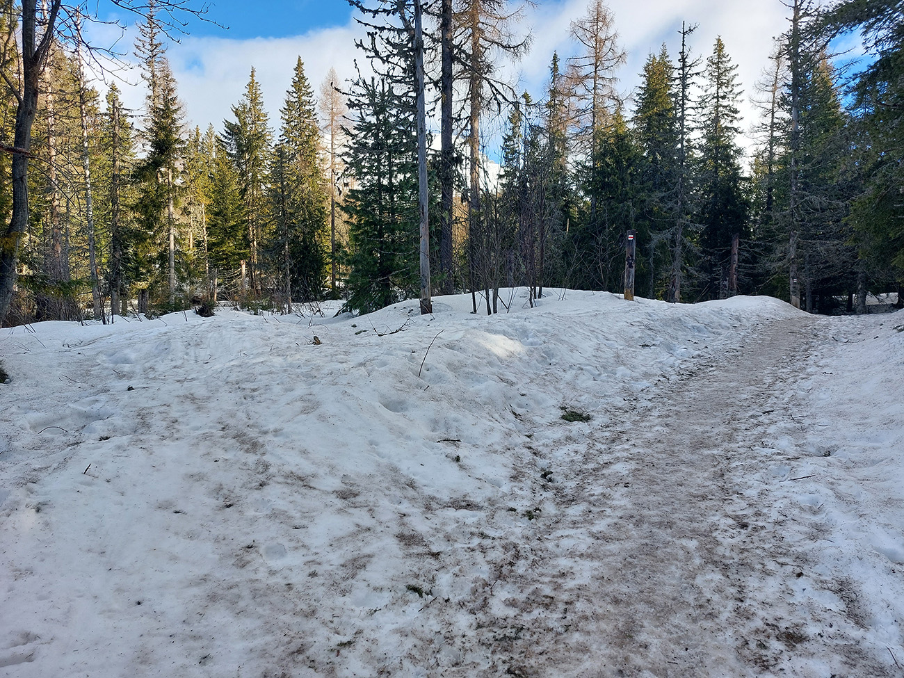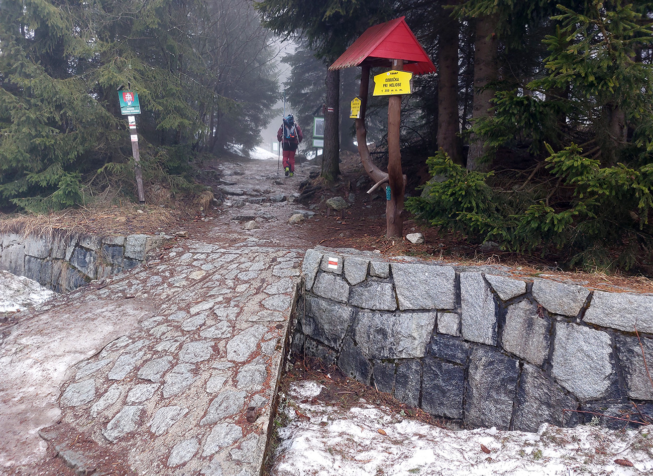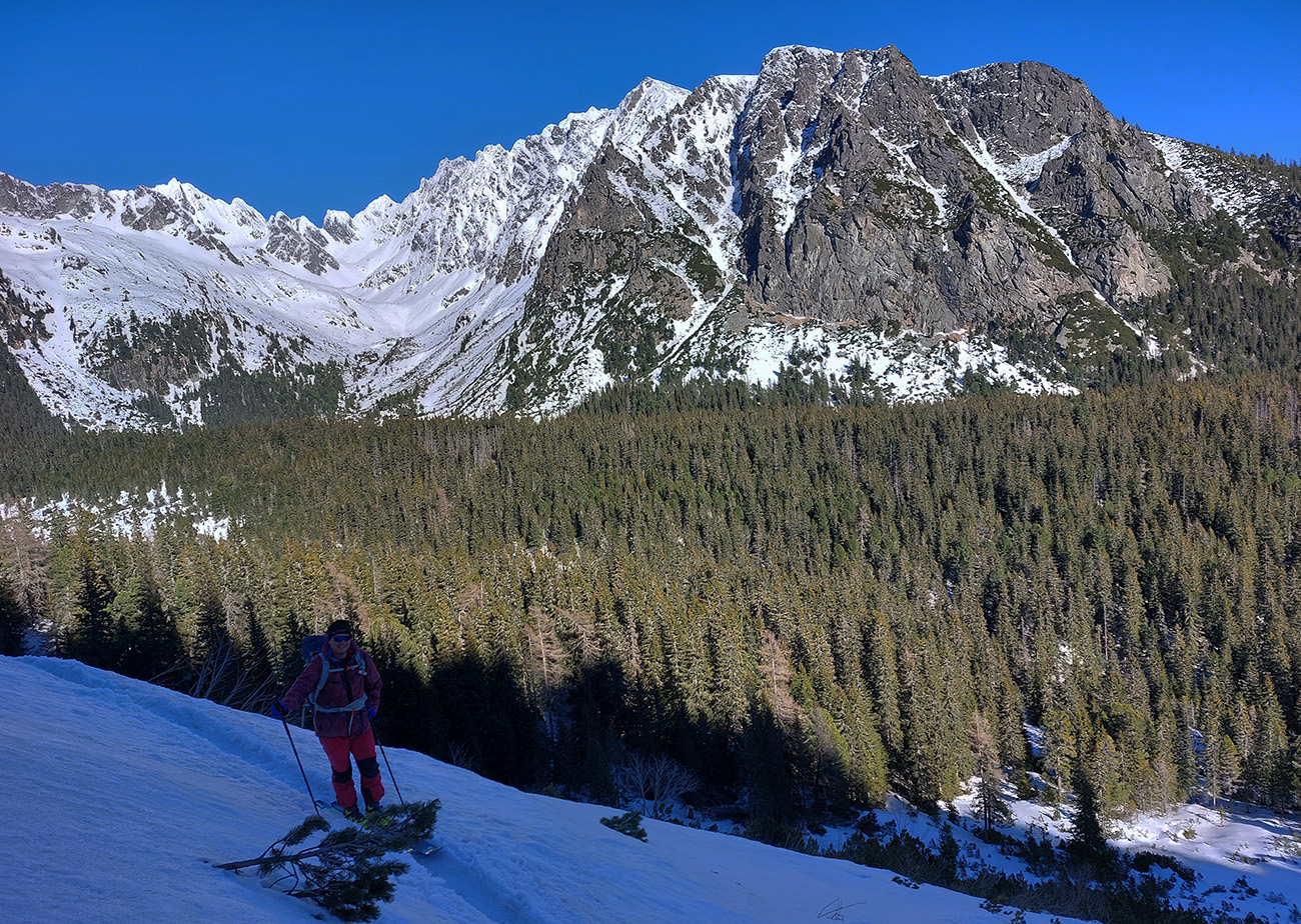 Rozbitý po sobote, chcel som sa ísť len s domácimi snehmi rozlúčiť, ale nejako nedopatrením ma zavialo do Tatier. To len ako výhovorka, prečo z Mengusovskej nebude toho viac – v podstate len Široký žľab a biedny pokus o Volí chrbát. Našťastie som nebol jediný nevládny, tak som nebol za brzdu a pohodové tempo mi véééééľmi vyhovovalo. Z domu sme vyrážali ešte za dažďa, ale mraky mali rýchlo odtiahnuť a malo nastať dočasné ažúro – asi do obeda. Potom ďalší front a pokles teploty pod nulu ešte počas dňa. Ráno bolo čvachtavo a teda poriadne - aj na Štrbskom plese, odkiaľ sme vyrážali. V pláne bola Mengusovská, že tam sa nejako a niekam hádam schováme pred dobiedzavým sz vetrom. Podobný program ako pred dvoma týždňami ( report je tu ), akurát, že „od parkoviska“ už to nešlo, poctivo sme si lyže vyniesli až tam, kde letný chodník vychádza z lesa, ďaleko za Triganom. Lebo v lese toľko špiny na chodníku, že nám bolo pásov ľúto: