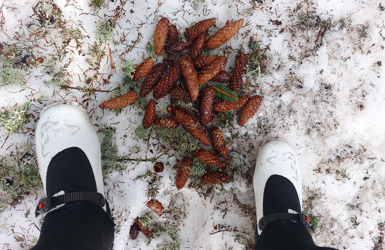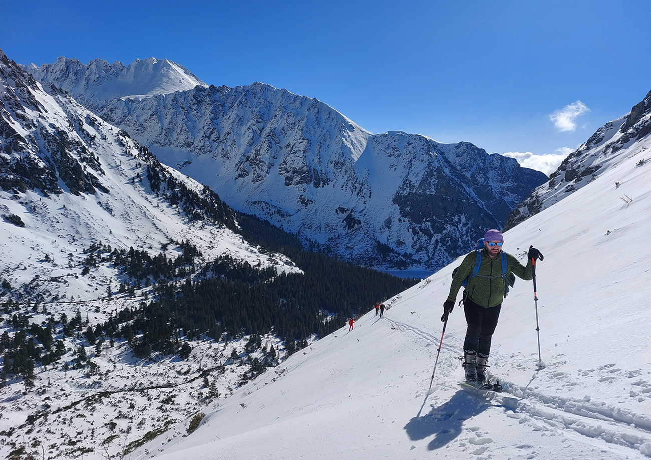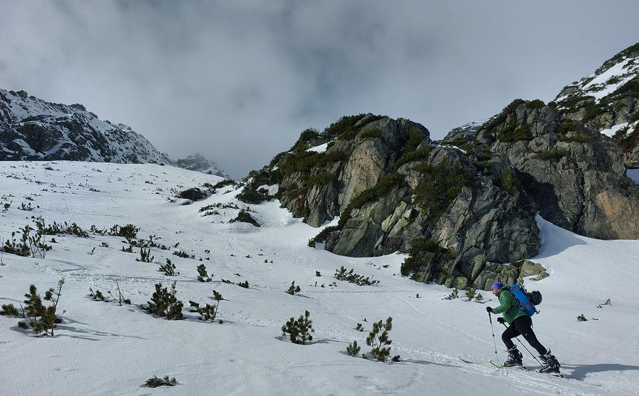 Ešte bolo trochu času aj síl, tak sme od potoka začali dupať v ústrety Žabím plesám, už so slnkom za chrbtom. Ale obe spomenuté dôležité komodity sa rýchlo míňali, tak sme skončili niekde pod prahom Volej kotliny a zahanbene sme začali strácať výšku po červenej značke smerom ku potoku. Celkom fajn jarná lyžba, lebo slnco tam malo ešte svoje slovo.