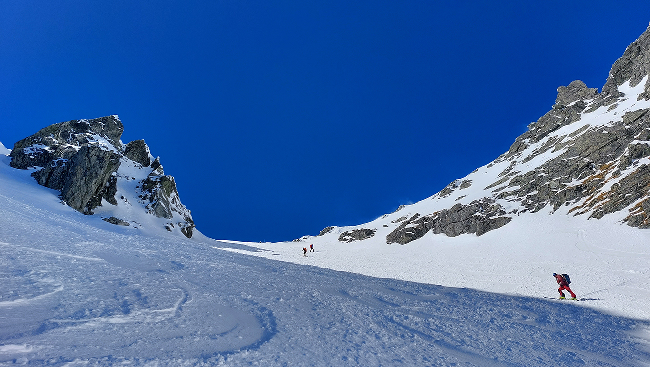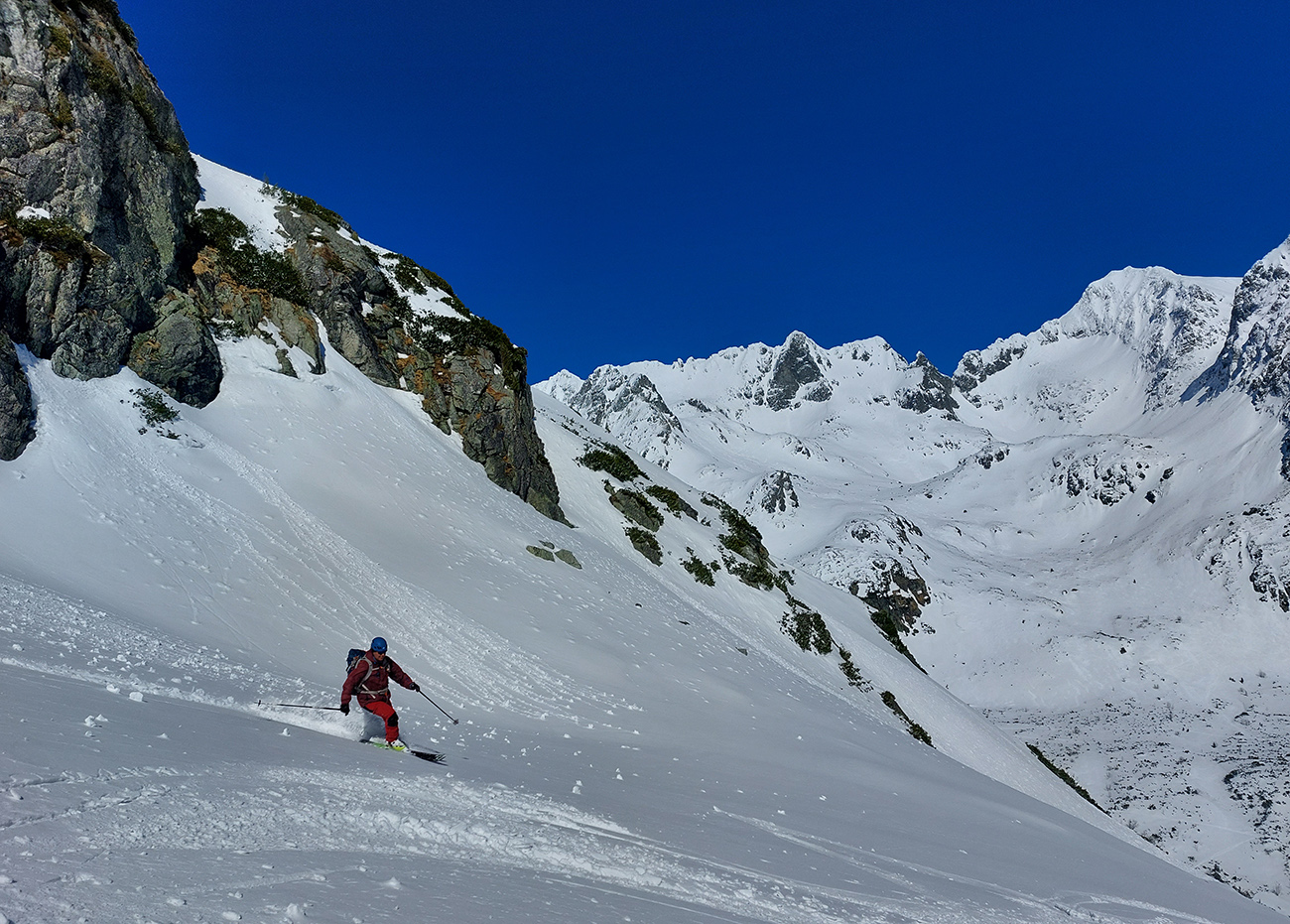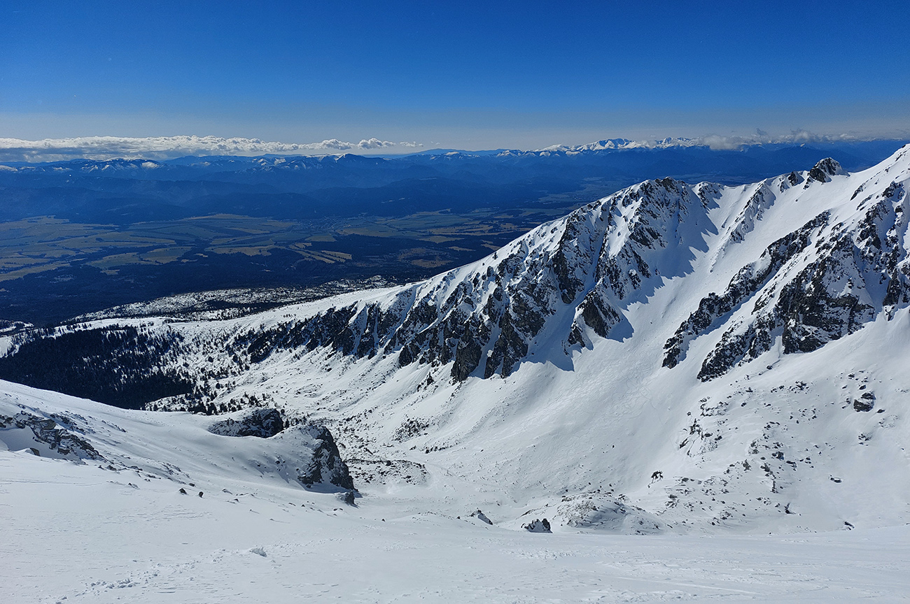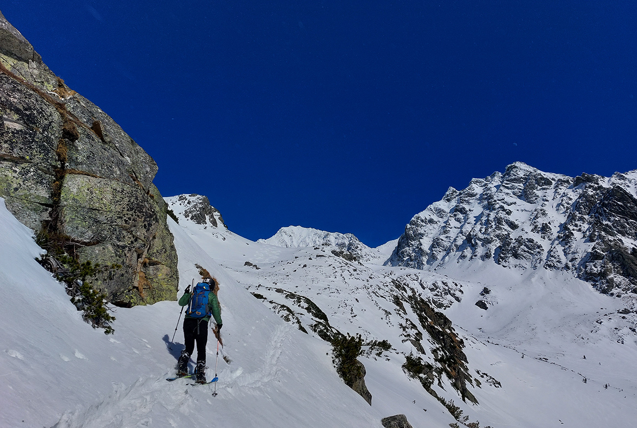 Dole k mostíku sme ale nešli, odbočili sme doľava a cez kosovku sme natraverzovali rovno pod Široký žľab a ten sa nám zapáčil. Lebo podložka príjemne mäkká (natopený firn) a piati predjazdci ťahali stopu priam profesionálne. Vyššie, v strmšom, už o bolo suchšie a boli ta zo dve miesta, kde sme aj rozmýšľali nad haršajzňami (mokrý firn alebo v tieni prášok na tuhej kôrke), ale ešte vyššie viac suchšieho a lepšie državého snehu, skoro prašanu, najmä v tieňoch na južnej strane žľabu. Aj kde bol už odhrnutý lyžujúcimi, dala sa do kôrky pod ním jednoducho hrana zaseknúť, nebol to hrubý ľad. Takže komfortne až hore a tam okrem pár nárazov vetra parádne, tichúčko. Ten ďalší front v nedohľadne.