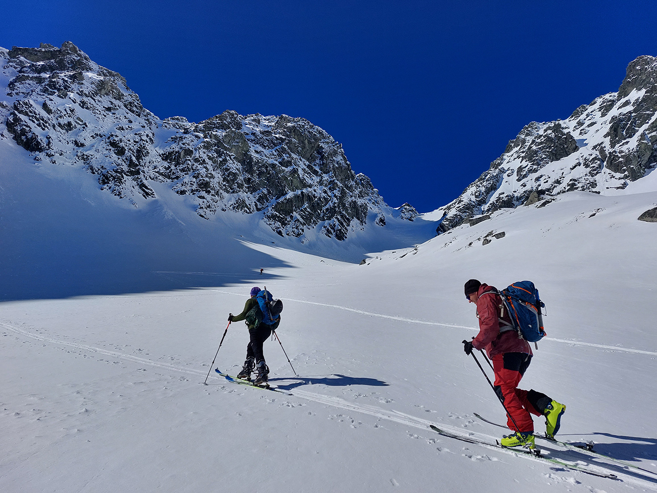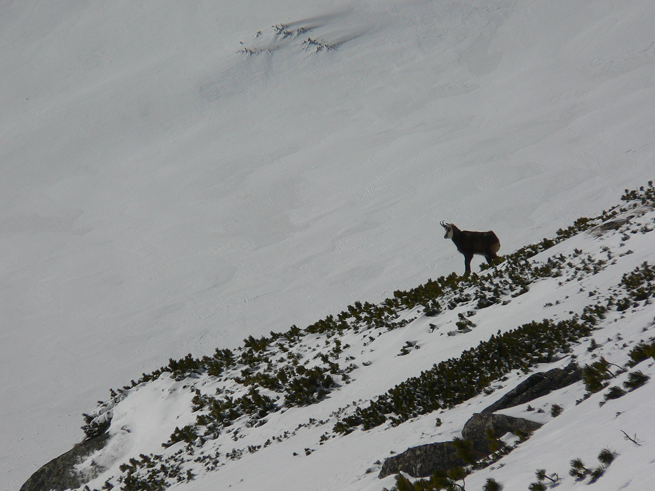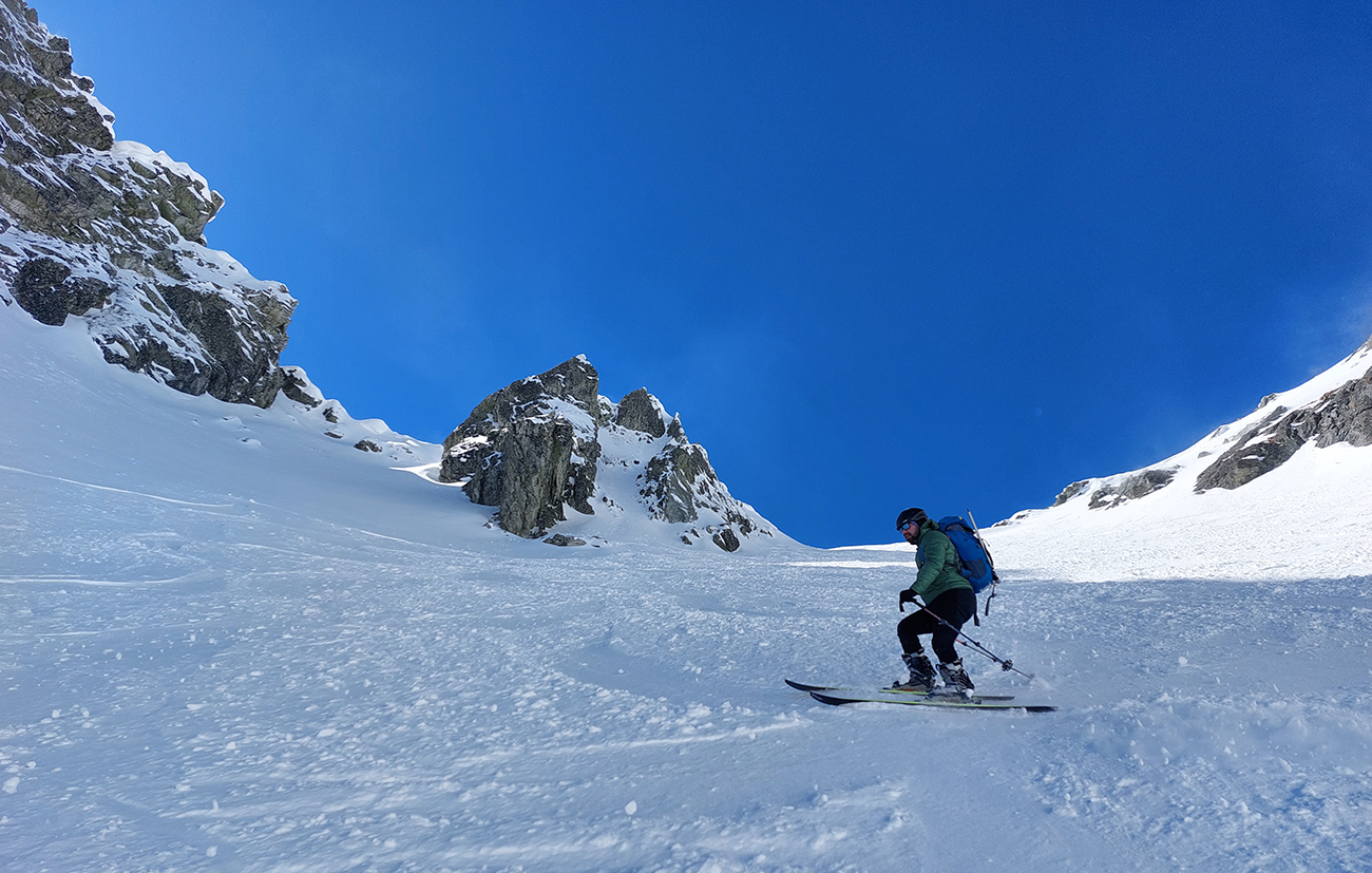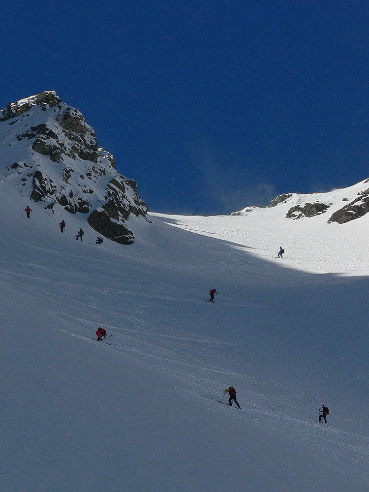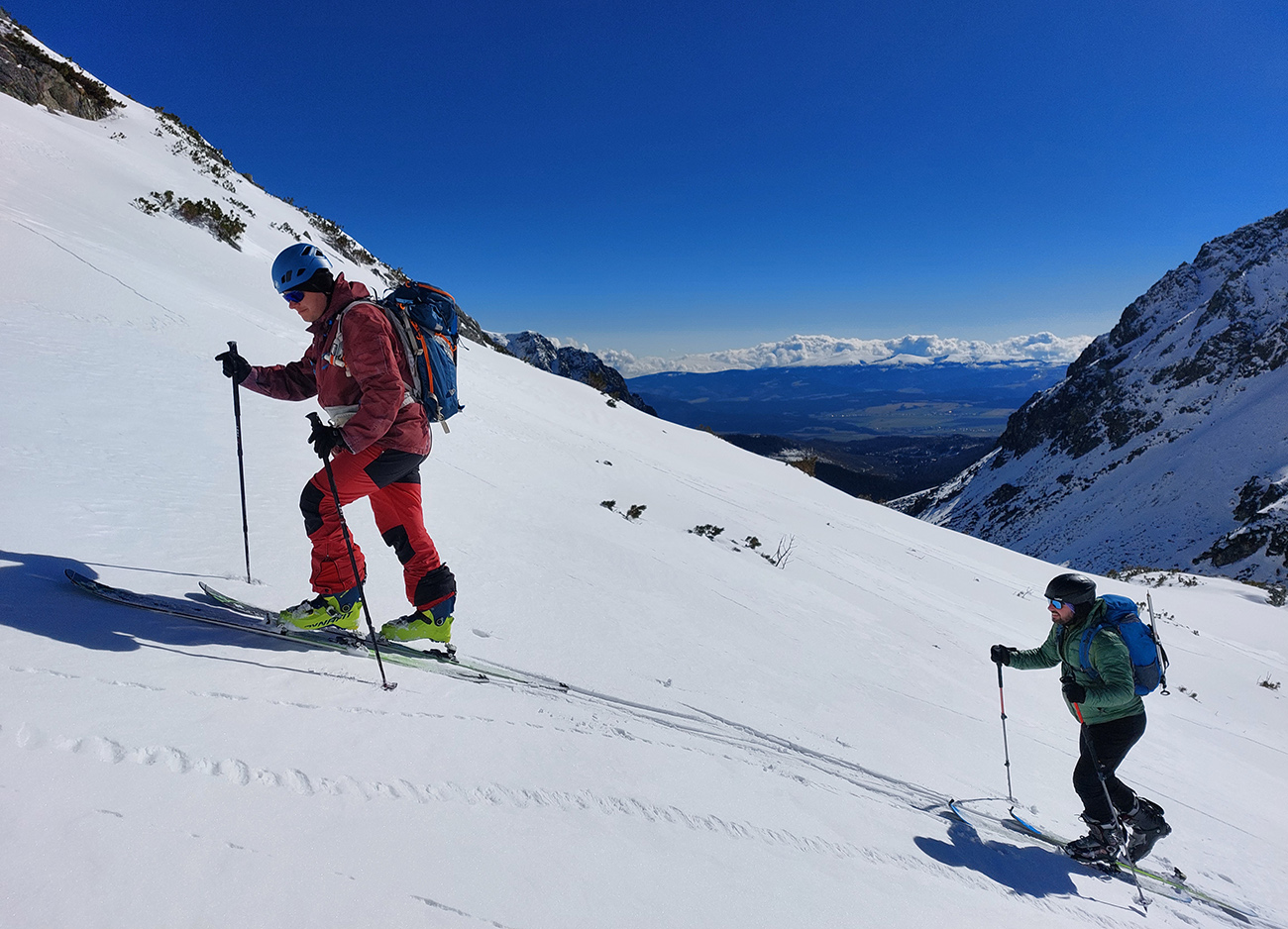 Dole k mostíku sme ale nešli, odbočili sme doľava a cez kosovku sme natraverzovali rovno pod Široký žľab a ten sa nám zapáčil. Lebo podložka príjemne mäkká (natopený firn) a piati predjazdci ťahali stopu priam profesionálne. Vyššie, v strmšom, už o bolo suchšie a boli ta zo dve miesta, kde sme aj rozmýšľali nad haršajzňami (mokrý firn alebo v tieni prášok na tuhej kôrke), ale ešte vyššie viac suchšieho a lepšie državého snehu, skoro prašanu, najmä v tieňoch na južnej strane žľabu. Aj kde bol už odhrnutý lyžujúcimi, dala sa do kôrky pod ním jednoducho hrana zaseknúť, nebol to hrubý ľad. Takže komfortne až hore a tam okrem pár nárazov vetra parádne, tichúčko. Ten ďalší front v nedohľadne.