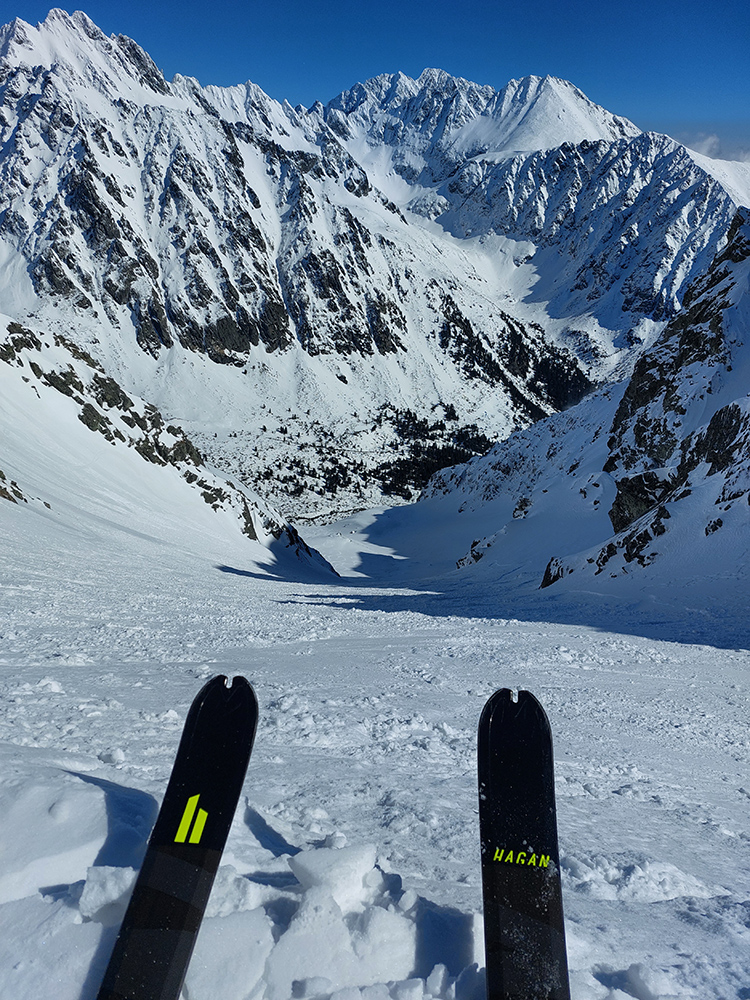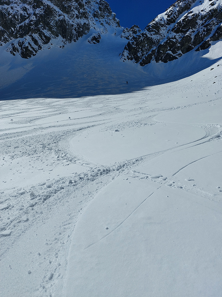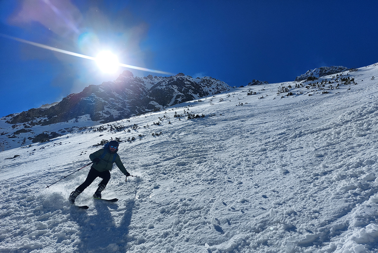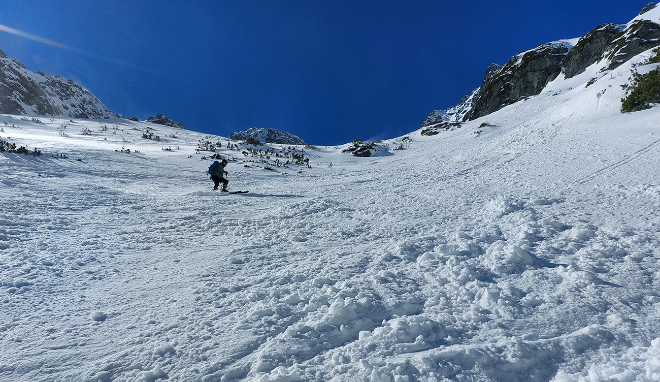 Nečakane dobré podmienky aj na zjazd: najmä horná časť, skoro prašanové orgie. Čím nižšie, tým to bolo ale horšie. V strede už čerstvo tvoriaca sa kôrka trochu chytala za nohy a úplne dole postupne tuhli rozlyžované hrudky firnu z nedávneho splazu. Takže lyžba skoro ako po lavínisku. Partia, ktorá prešla z Mlynickej, ale hovorila, že na tej strane je sneh oveľa horší.