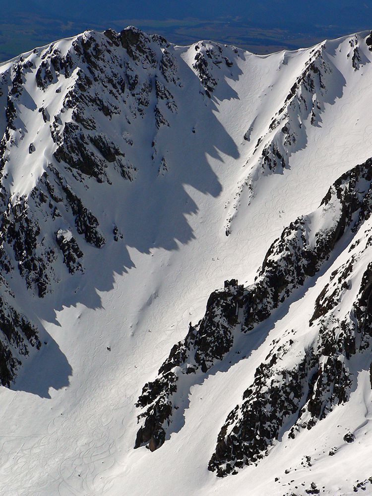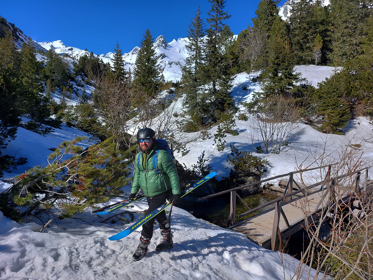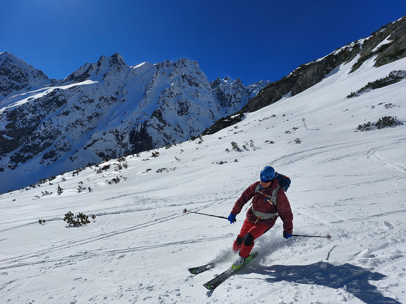 Nečakane dobré podmienky aj na zjazd: najmä horná časť, skoro prašanové orgie. Čím nižšie, tým to bolo ale horšie. V strede už čerstvo tvoriaca sa kôrka trochu chytala za nohy a úplne dole postupne tuhli rozlyžované hrudky firnu z nedávneho splazu. Takže lyžba skoro ako po lavínisku. Partia, ktorá prešla z Mlynickej, ale hovorila, že na tej strane je sneh oveľa horší.