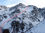 Meno žlabu v hrebeni približne v strede medzi spomínanými kopcami sa mi zistiť nepodarilo, v každom prípade mi však učarovala jeho priama línia a takmer 500 výškových metrov. Sklon má asi 40 stupňov, v hornej časti to môže byť aj viac. V najužšom mieste má stále aspoň 10 metrov - žiadny extrém, ale lyžba ako vyšitá.