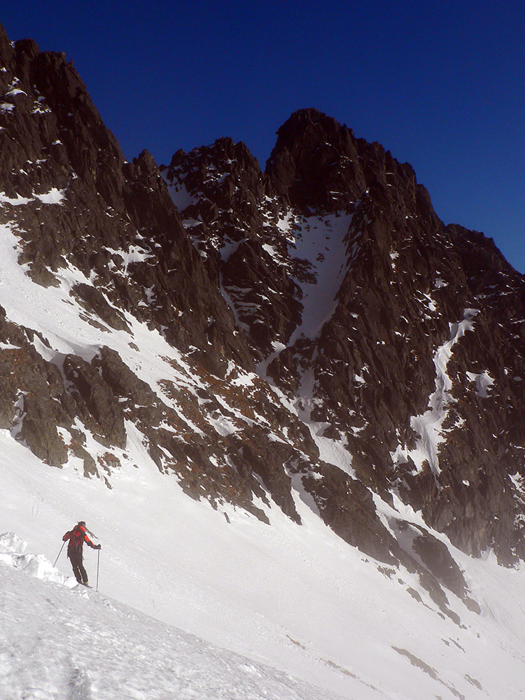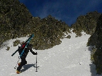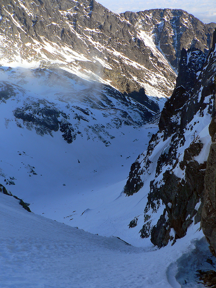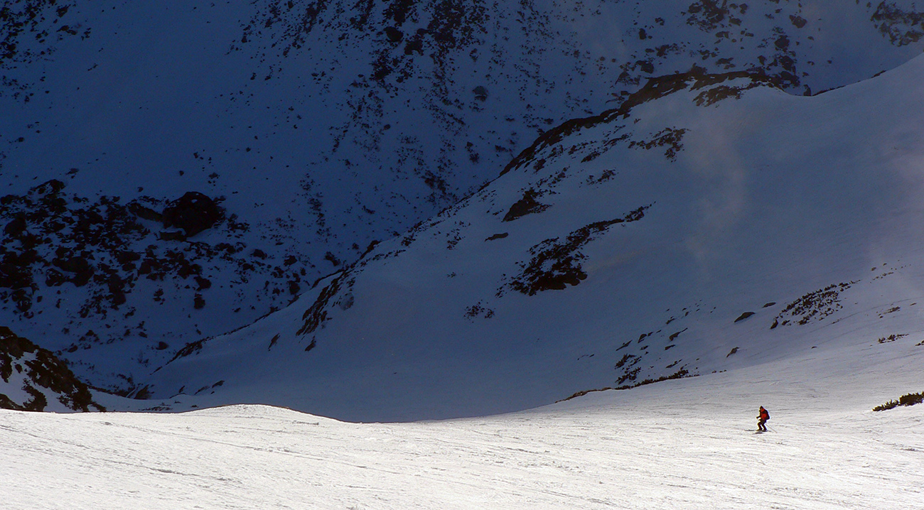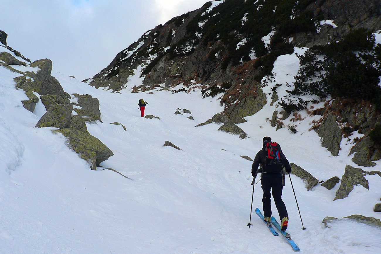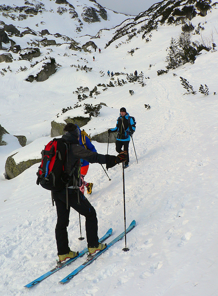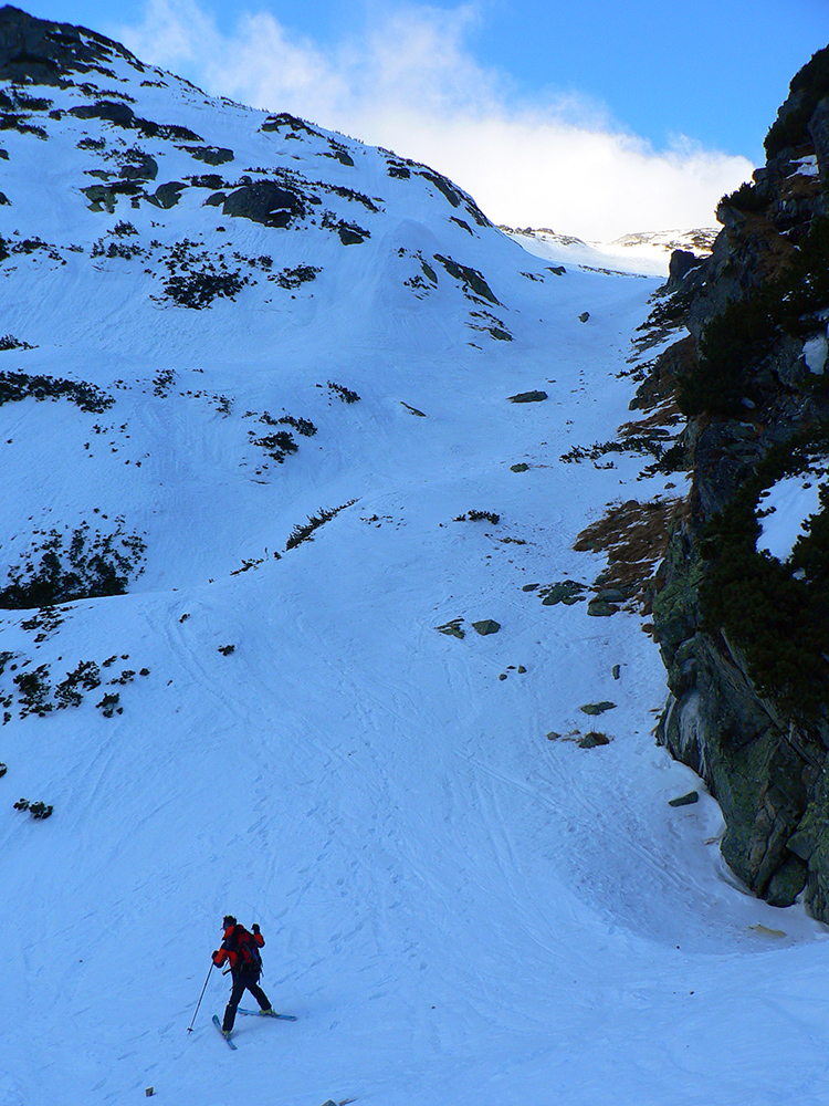 Stúpame zatiaľ tieňom doliny popod rozžiarené hrebene a čuduj sa svet: oproti nám schádza stále viac ľudí. Peši od Zbojníčky. To už sme za Húpačkami, za Bufetom. Pod Bránou to zostrmie, je to vyšmýkané mnohými lyžami, ale dalo by sa aj bez komplikácií - len si netreba zabudnúť zaaretovať špičky viazania :-)