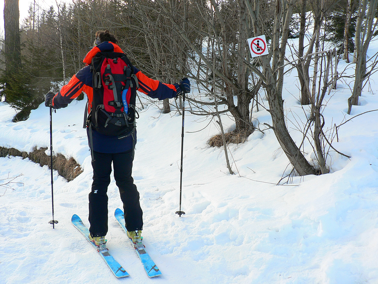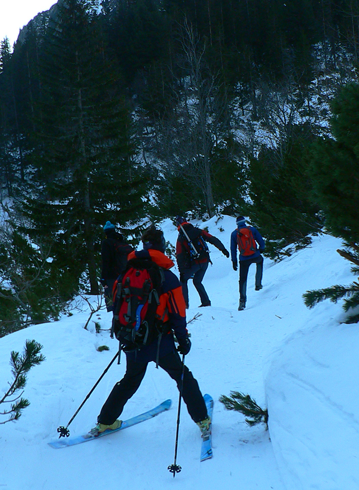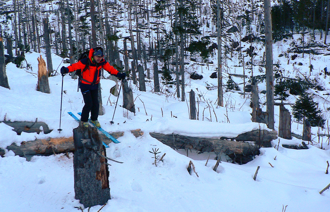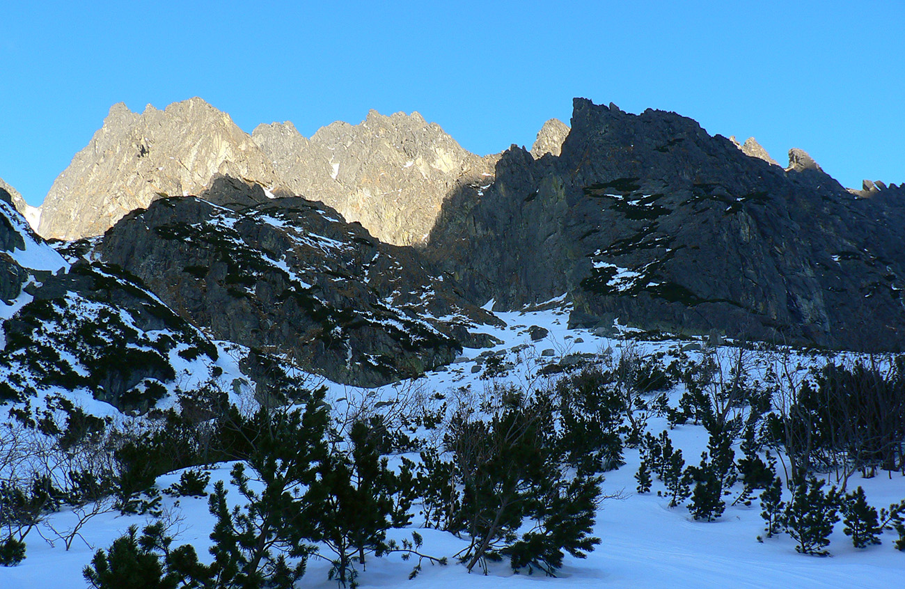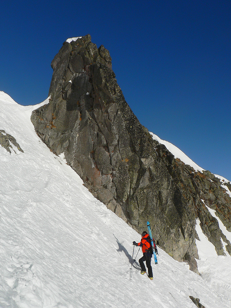 Stúpame zatiaľ tieňom doliny popod rozžiarené hrebene a čuduj sa svet: oproti nám schádza stále viac ľudí. Peši od Zbojníčky. To už sme za Húpačkami, za Bufetom. Pod Bránou to zostrmie, je to vyšmýkané mnohými lyžami, ale dalo by sa aj bez komplikácií - len si netreba zabudnúť zaaretovať špičky viazania :-)