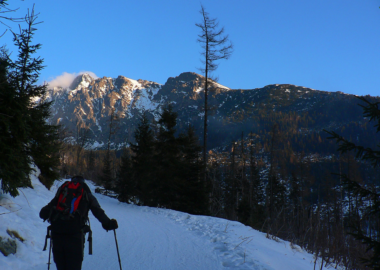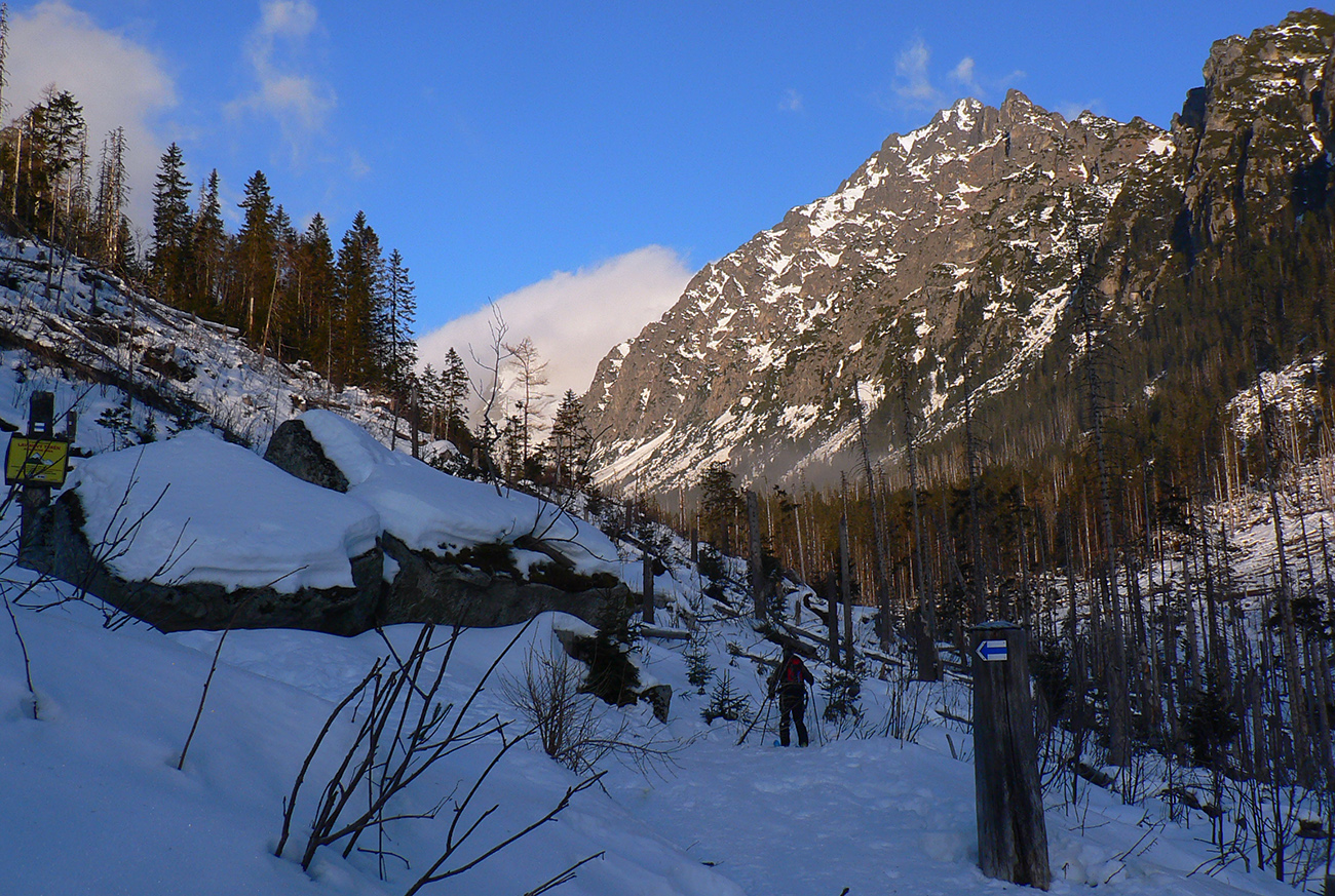 Nedeľa 19. januára mala byť ešte krajšia ako perfektná sobota ( tá je TU ), ale ráno to akosi nevychádza. Z PP do Smokovca valíme popod mraky. Tie našťastie cestou rednú a VSD pred nami je už nasvietená vychádzajúcim slnkom. Že by...? Poučení zo včera sa nešuchceme na Hrebienok po ceste, ale po starej zjazdovke a obchádzkou poza hotel ďalej do doliny. Malá prestávka nad Bilíkovou chatou kvôli „operácii“ jedného pásu (druhý odišiel už včera, nie je to dobre vymyslené) a hneď sa ľahšie šmýka. Ale aj tak dáko spomaľujeme - po dvoch krátkych nociach to nebude nechuťou k pohybu...