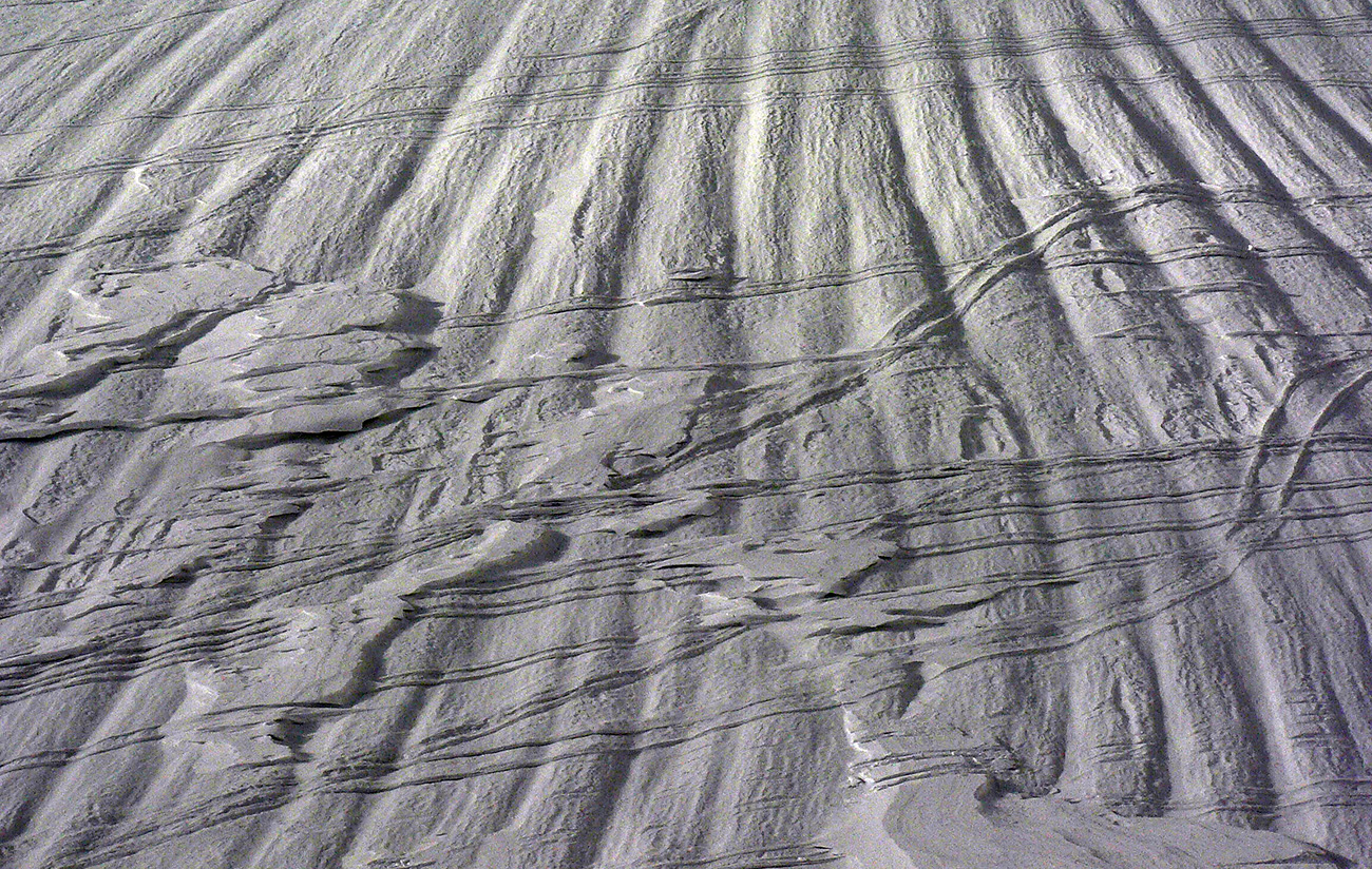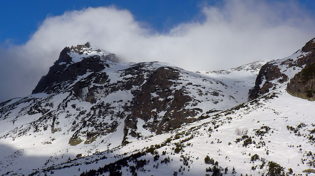 Miestami treba aj po kameňoch, miestami nepríjemné ľadové platne v sklone doprava - a dole sa žraločie zuby ceria. Až nad Sivým plesom snehu dosť, a aj dobre drží. A to mlieko začína rednúť a v stúpaní na Strelecké polia nás doháňajú závany takého homosexuálneho vetríka, ako by jar išla. Po čiernych bľeskoch zrazu stekajú kvapky vody.