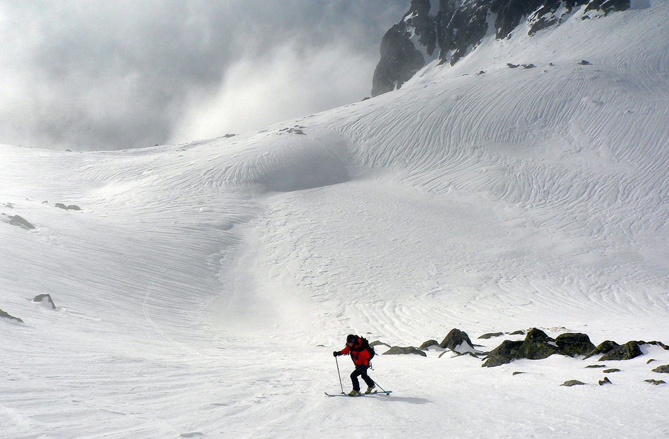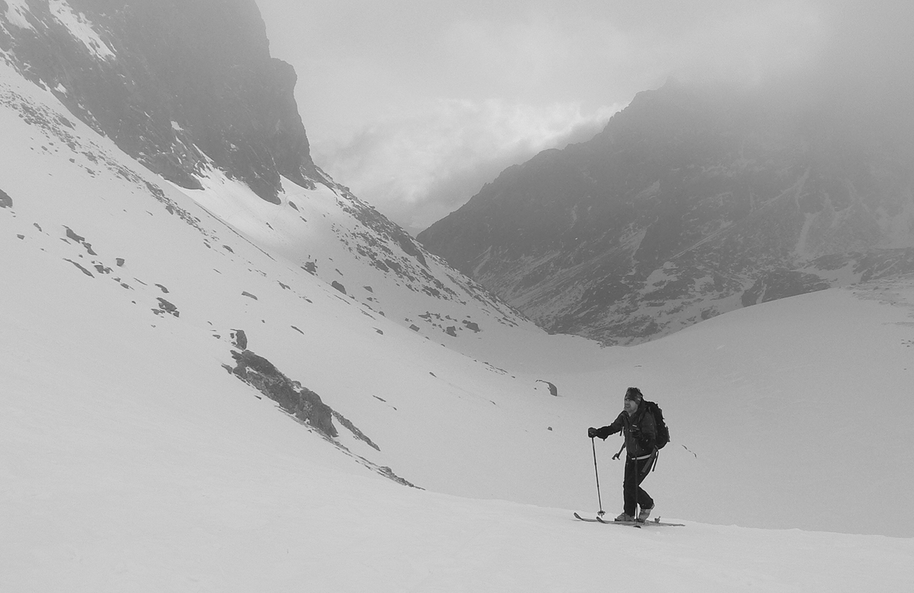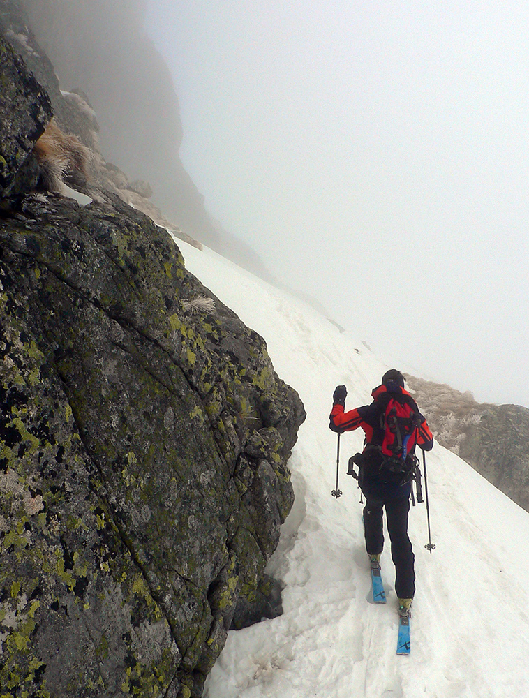 Potom už bez trapasov odbočujeme do Generála a dolinou oproti nám už dobre fučí jedovatý „severáčik“ od západu. Obliekame, noríme sa do mlieka. Prvé strmšie stúpanie sa dá na pásoch, kolmo aj cik – cak. Pod Závratom ale už nahadzujeme haršajzne, ale tie sa s rastúcou výškou odmietajú zakusovať do „podkĽADU“. Aj keď stopa je. No ideálna skôr pre korčule.