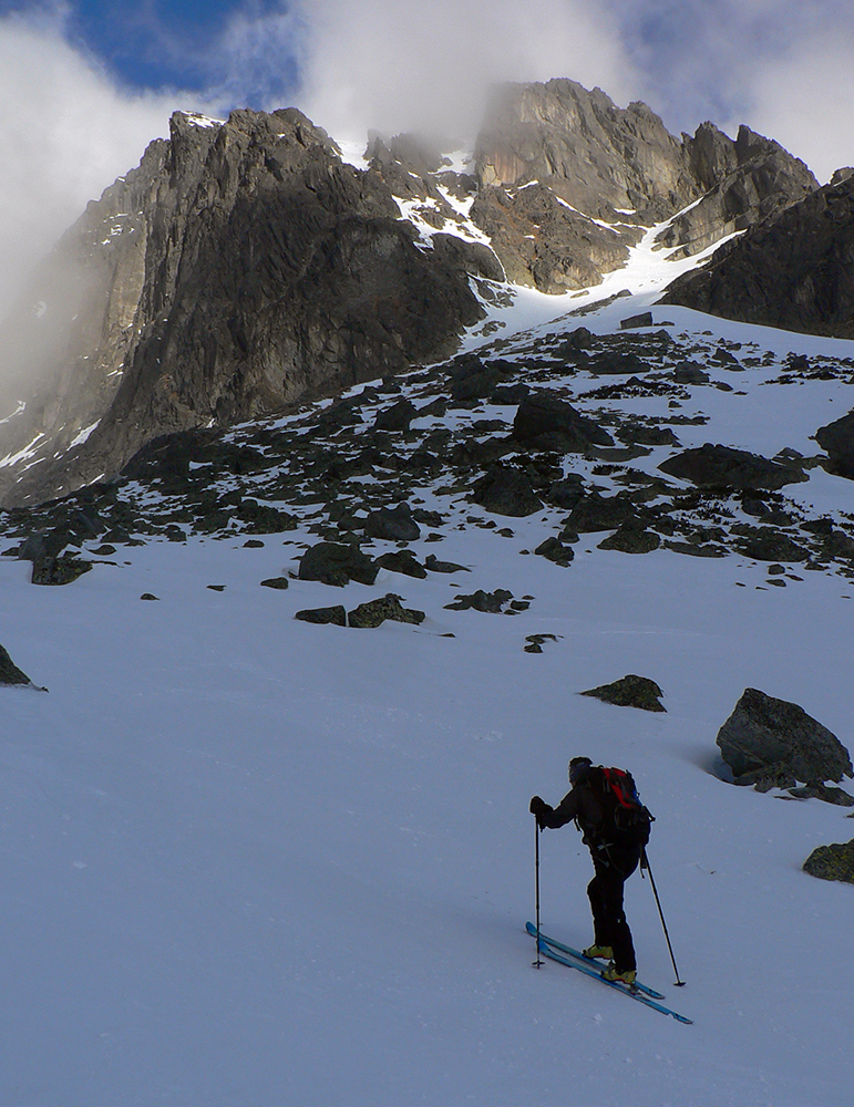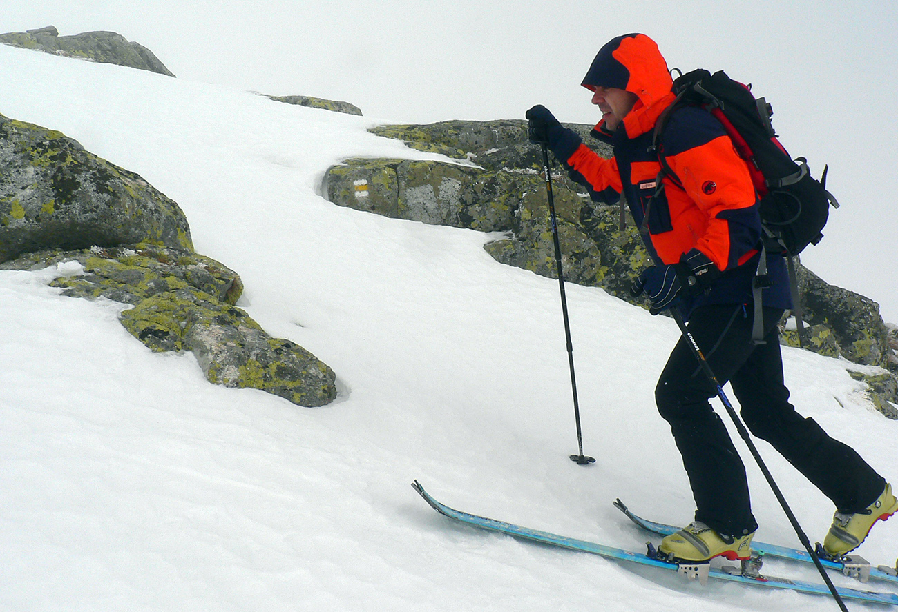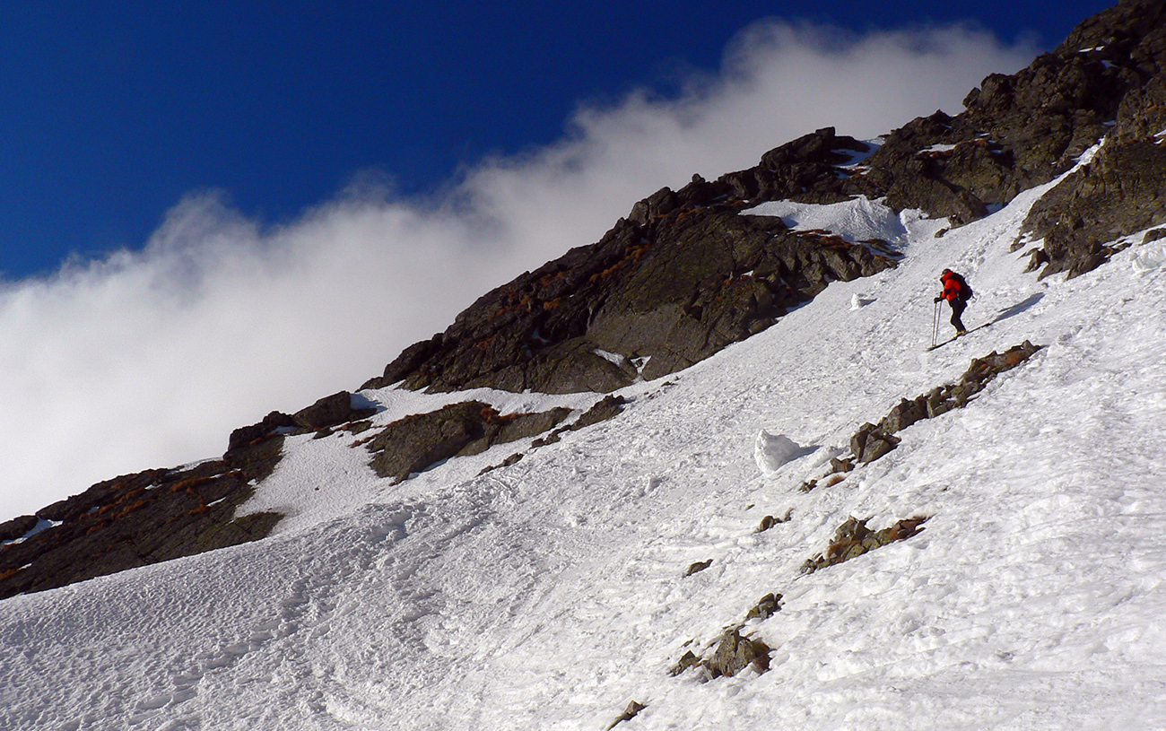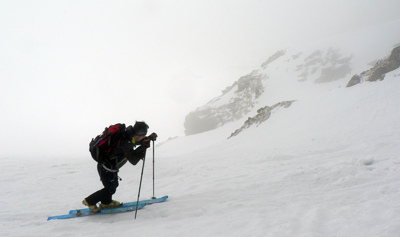 Potom už bez trapasov odbočujeme do Generála a dolinou oproti nám už dobre fučí jedovatý „severáčik“ od západu. Obliekame, noríme sa do mlieka. Prvé strmšie stúpanie sa dá na pásoch, kolmo aj cik – cak. Pod Závratom ale už nahadzujeme haršajzne, ale tie sa s rastúcou výškou odmietajú zakusovať do „podkĽADU“. Aj keď stopa je. No ideálna skôr pre korčule.