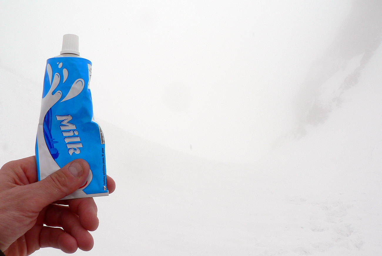 Posledné desiatky výškových metrov teda na mačkách pešo, nech sa tie zubane celý víkend nevozia nadarmo v batohu. Stopy sú, po ľavej strane popod stenu, ale je parádne ľadovo. Zato fučať prestalo a aj hore tíšina. V pohode na posedenie, dokonalý mliečny bar.