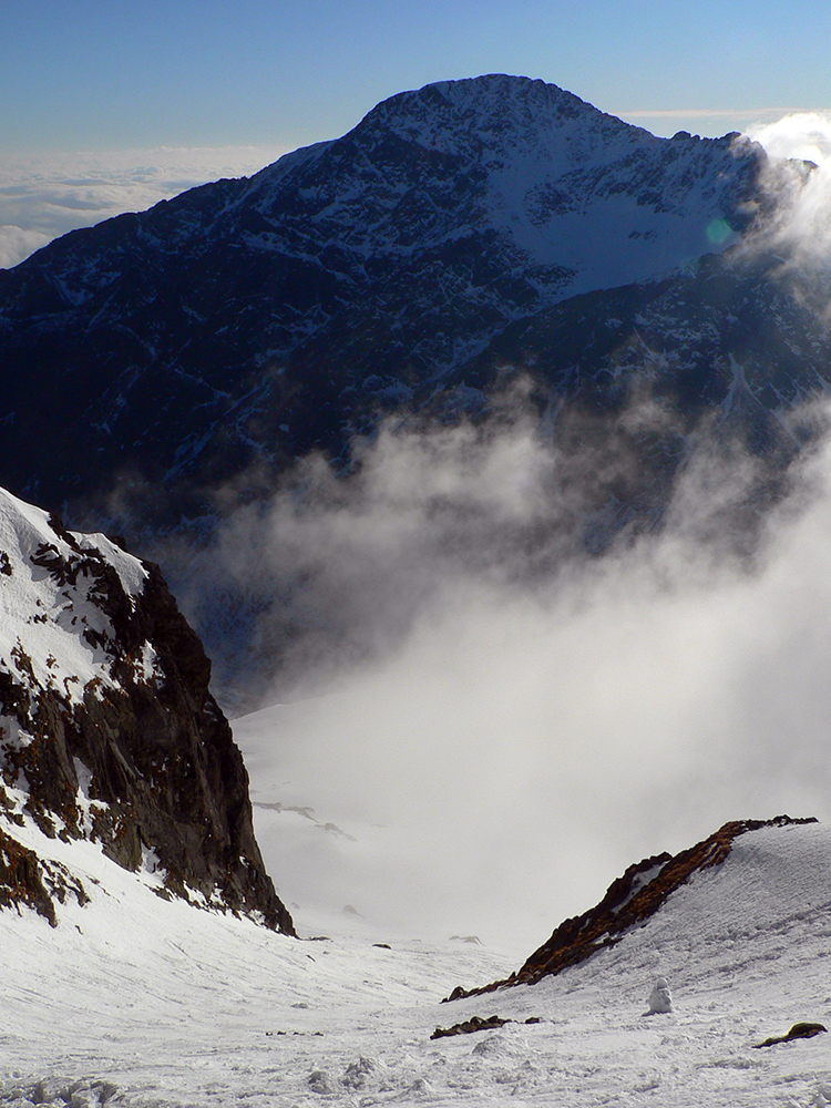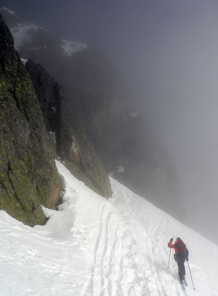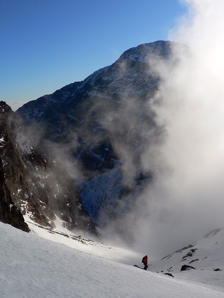 Ešte krátky a menej príjemný (lebo premrznutý) traverz pod Širokou vežou a ideme do finále. Lyže na chrbát a hore do Priečneho, tentokrát už bez mačiek. Sme akurát na hranici hmly, ktorá sem dobiedza od západu a spolu so slnkom z juhu vytvára zaujímavé efekty. Sneh jemne povolený a stôp habadej, tak dupeme do fialovejúceho neba.