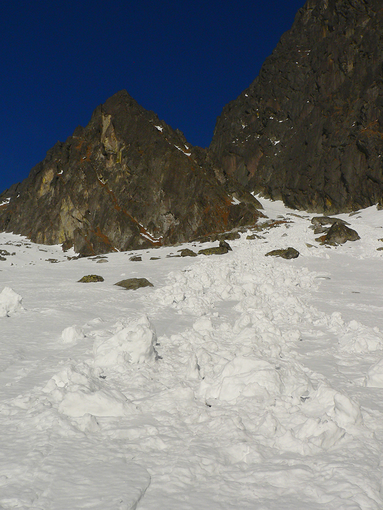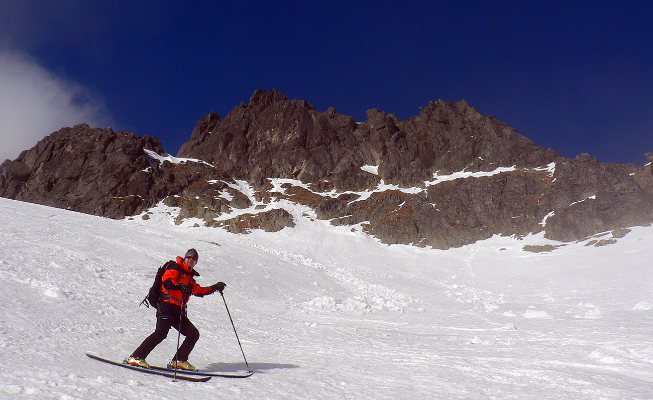 Do Rovienkovej doliny to vyzerá byť prudko lyžovateľné, rovné. My máme rozrytý betón, hnus je to. Aj nižšie je to už tvrdšie ako včera, teda hrkotavejšie. Robíme rachot na celú dolinu. Nad hangom zas pásy a popod steny Javorovej galérie pekne traverzovať, v podstate po žltej turistickej pod Priečne sedlo.