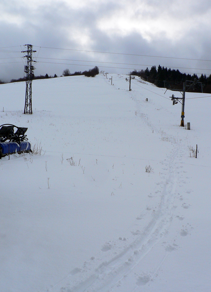 Takže: veľmi neskoré ráno, Nižné Revúce. Ignoroval som žltú značku hneď na začiatku a zamieril rovno pod vlek. Lebo tráva trčala spod snehu nahusto všade a aj na zjazdovke mi bolo hneď jasné, že cestou nazad dole to budú musieť byť veeeeľmi opatrné oblúčiky. Sneh síce prikryl nerovnosti, ale tak, že miestami 30 cm, miestami len zo päť. Zamrznuté krtince zákerne striehli!