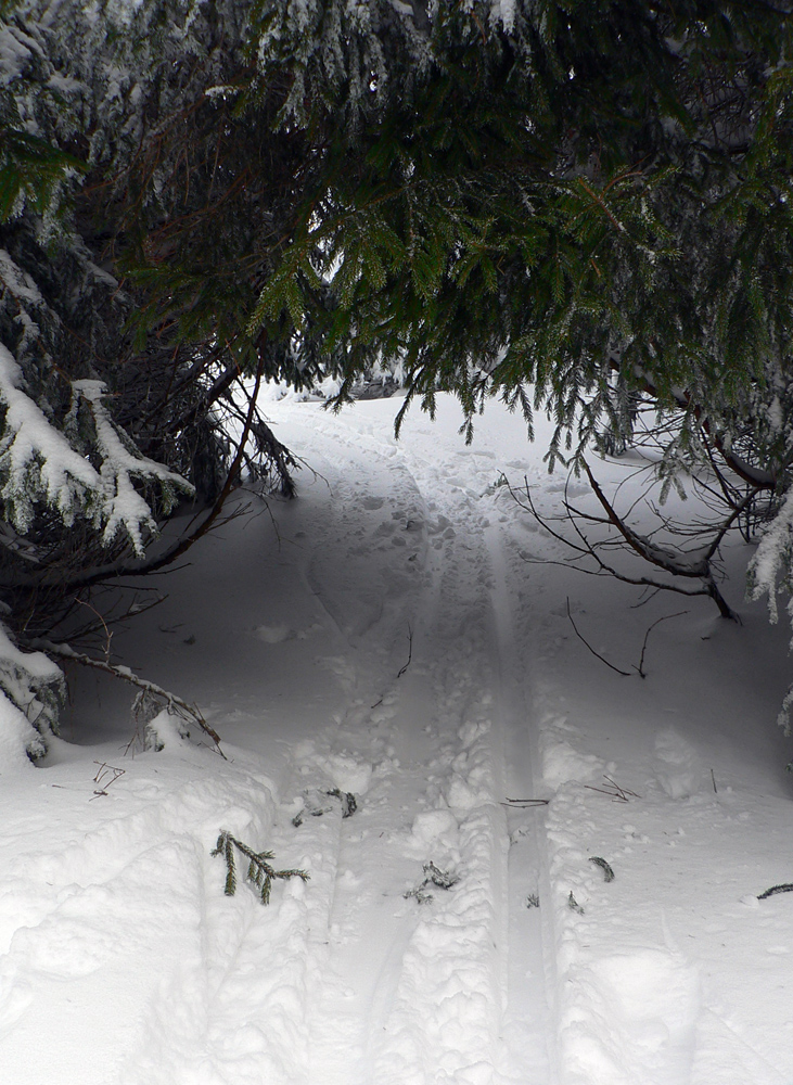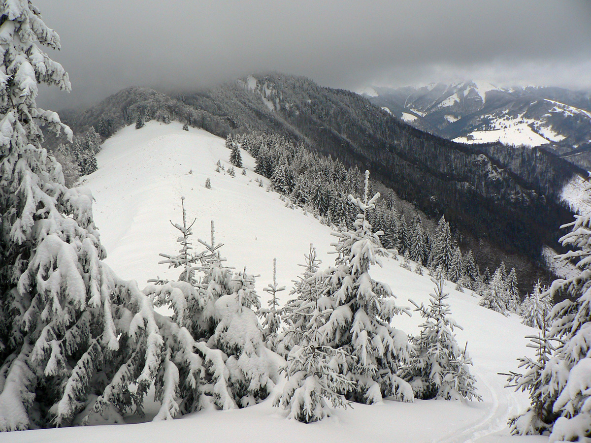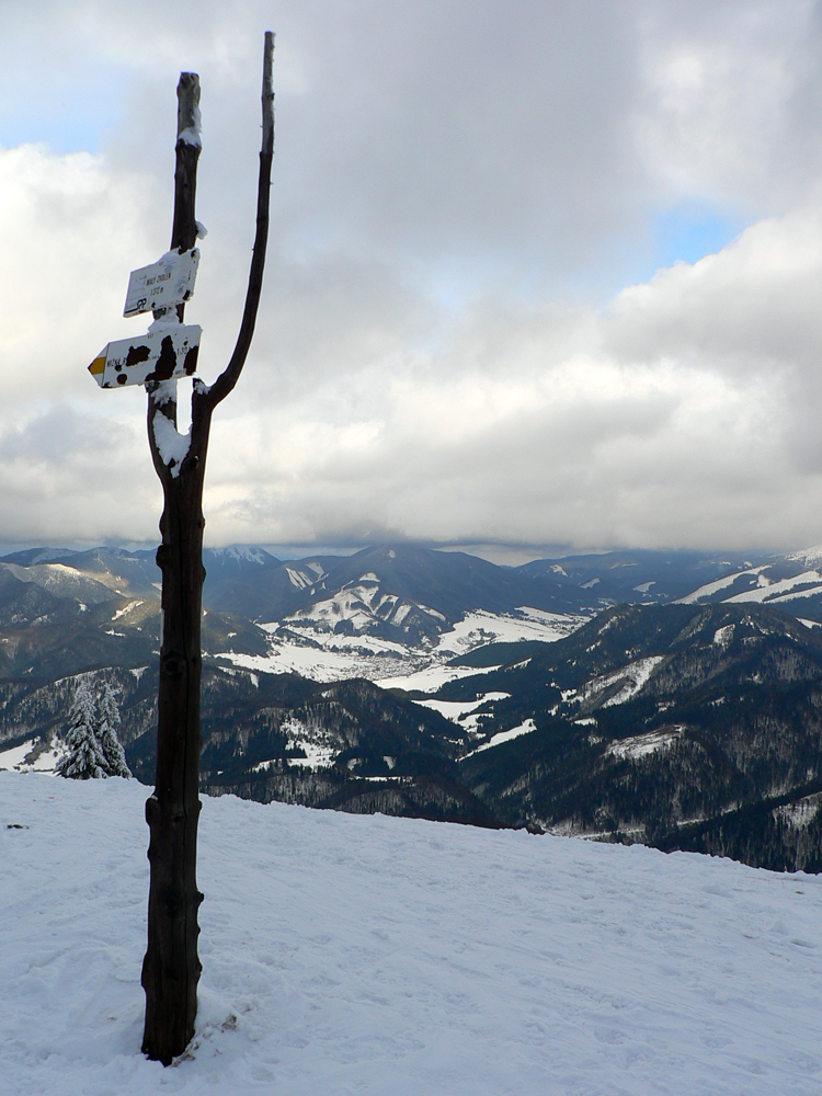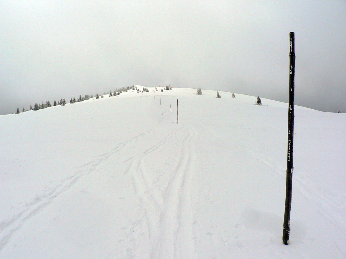 Nad vlekmi som konečne pod hrotmi palíc necítil hlinu, ale zmrznutý starý firn, v strmšom lese tesne pod Malým Zvolenom aj preveje sa vyskytli. Hore pri smerovníku už hmlisto, ale ľudsky dosť husto. Poďakoval som sa chlapom, ktorí (vraj len pre mňa) natiahli zdola čerstvú stopu (miestami aj do pol lýtok) a valil som ďalej po širokom hrebeni. Pekná tichá stopa v čerstvom, len sem tam zahrkotal ľad, kde bol sneh odfúknutý.