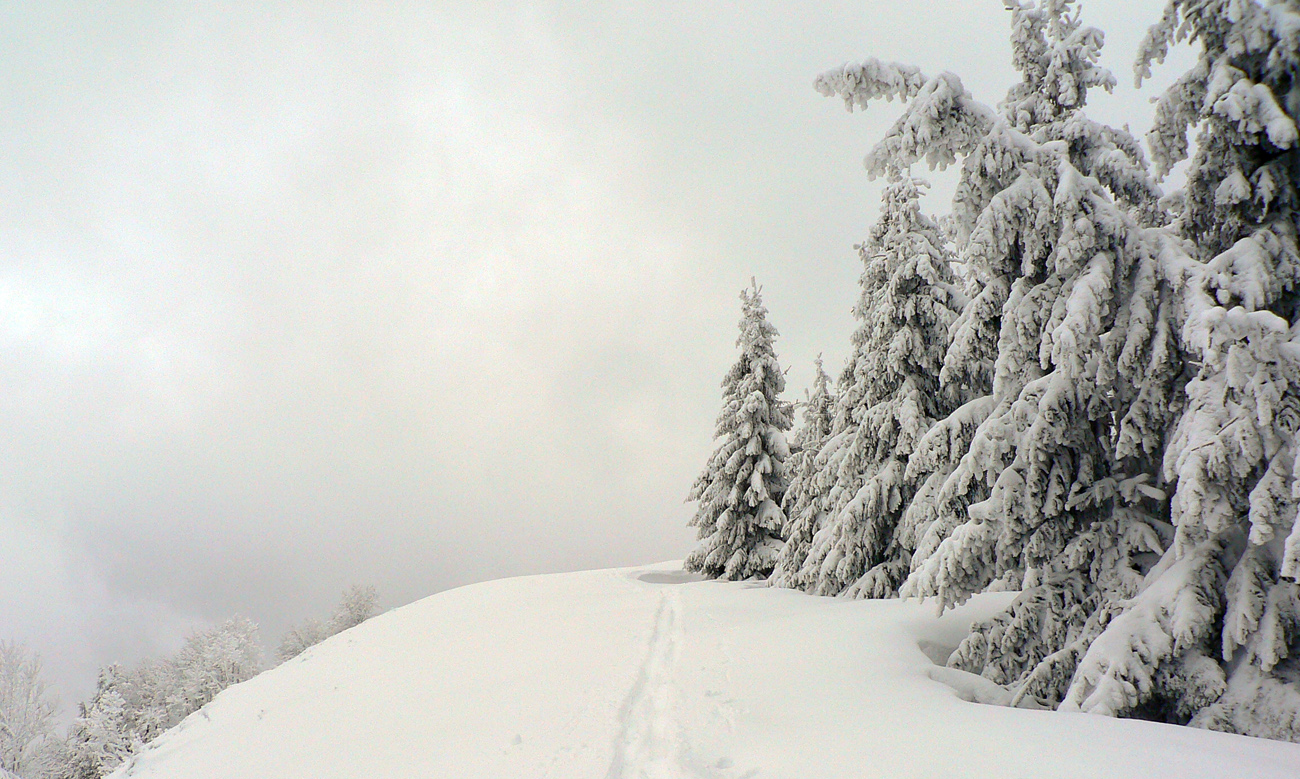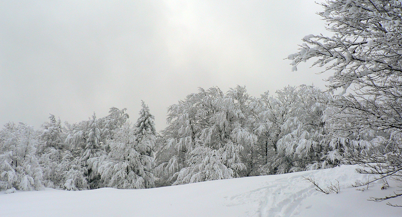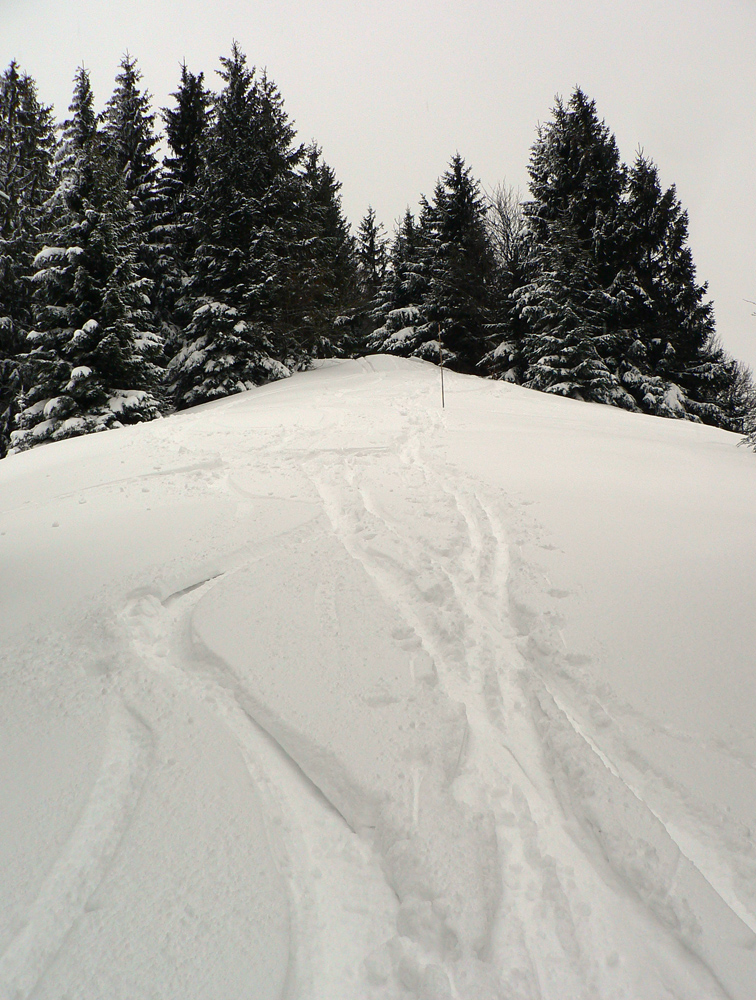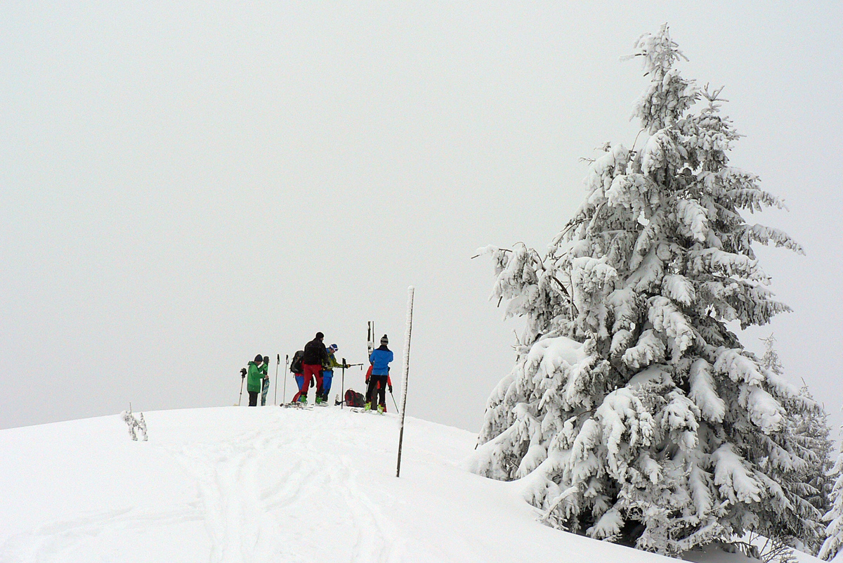 Nad vlekmi som konečne pod hrotmi palíc necítil hlinu, ale zmrznutý starý firn, v strmšom lese tesne pod Malým Zvolenom aj preveje sa vyskytli. Hore pri smerovníku už hmlisto, ale ľudsky dosť husto. Poďakoval som sa chlapom, ktorí (vraj len pre mňa) natiahli zdola čerstvú stopu (miestami aj do pol lýtok) a valil som ďalej po širokom hrebeni. Pekná tichá stopa v čerstvom, len sem tam zahrkotal ľad, kde bol sneh odfúknutý.