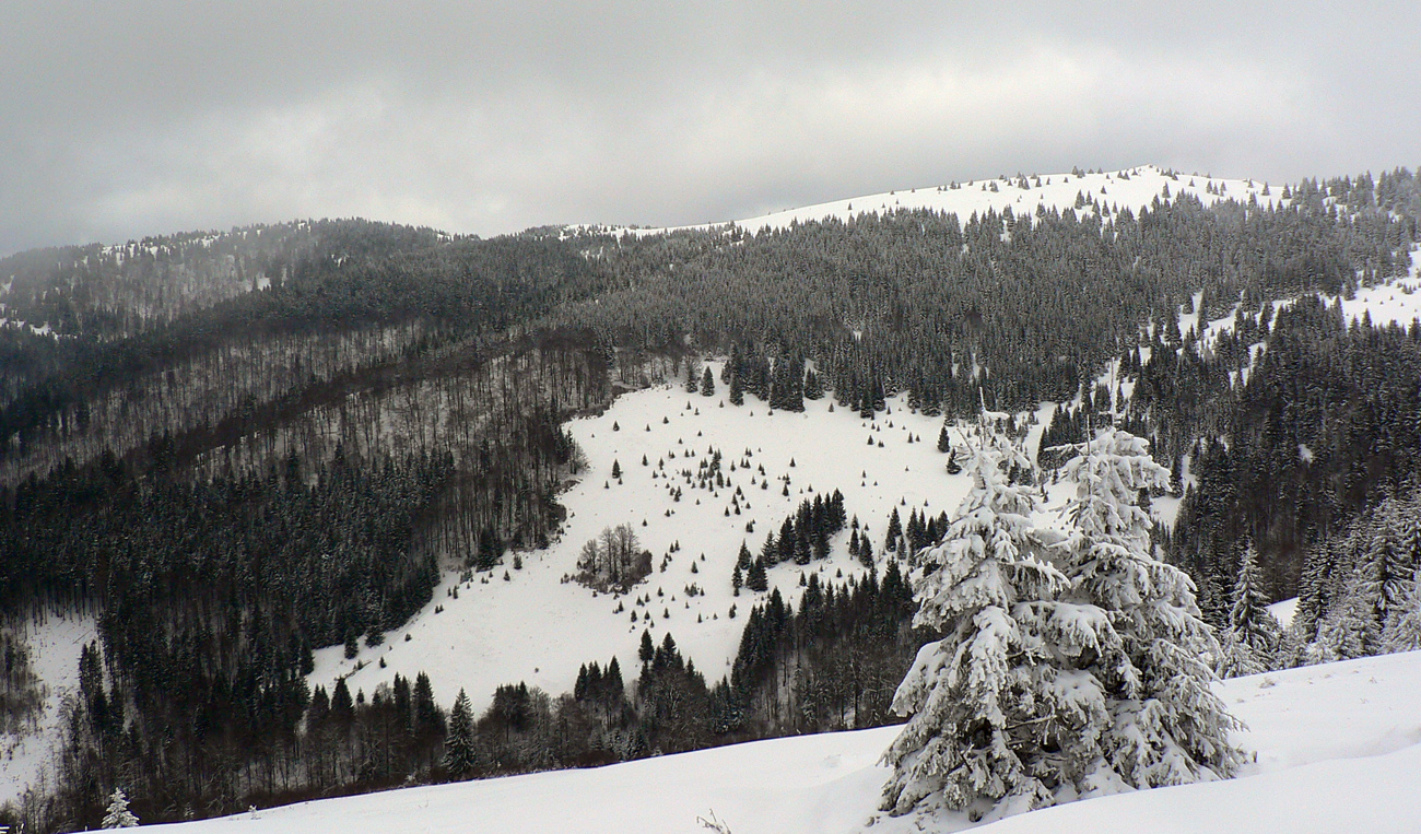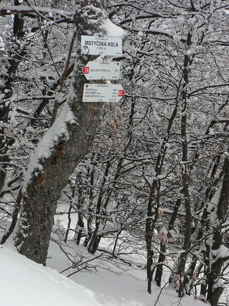 Aj dole zo Zvolena k Motyčskej holi mäkkučko, v prudších svahoch slalom v závejoch pomedzi smreky, dalo sa brzdiť bez obavy o pásy. Krásny, čerstvo zasnežený les. Po dvoch a pol hodinách som sa na holi otočil. Stopa prerazená až do sedla Veľký Šturec, dvaja páni si to od rána dali z Vyšných Revúc. Vraj aj stopa po ceste z dediny do sedla je komfortná, prebehnutá pásovou štvorkolkou. Ale z Motyčskej hole sa ide do sedla zväčša lesom, to sa mi nechcelo furt kľučkovať a brodiť prašan, preto otočka.
