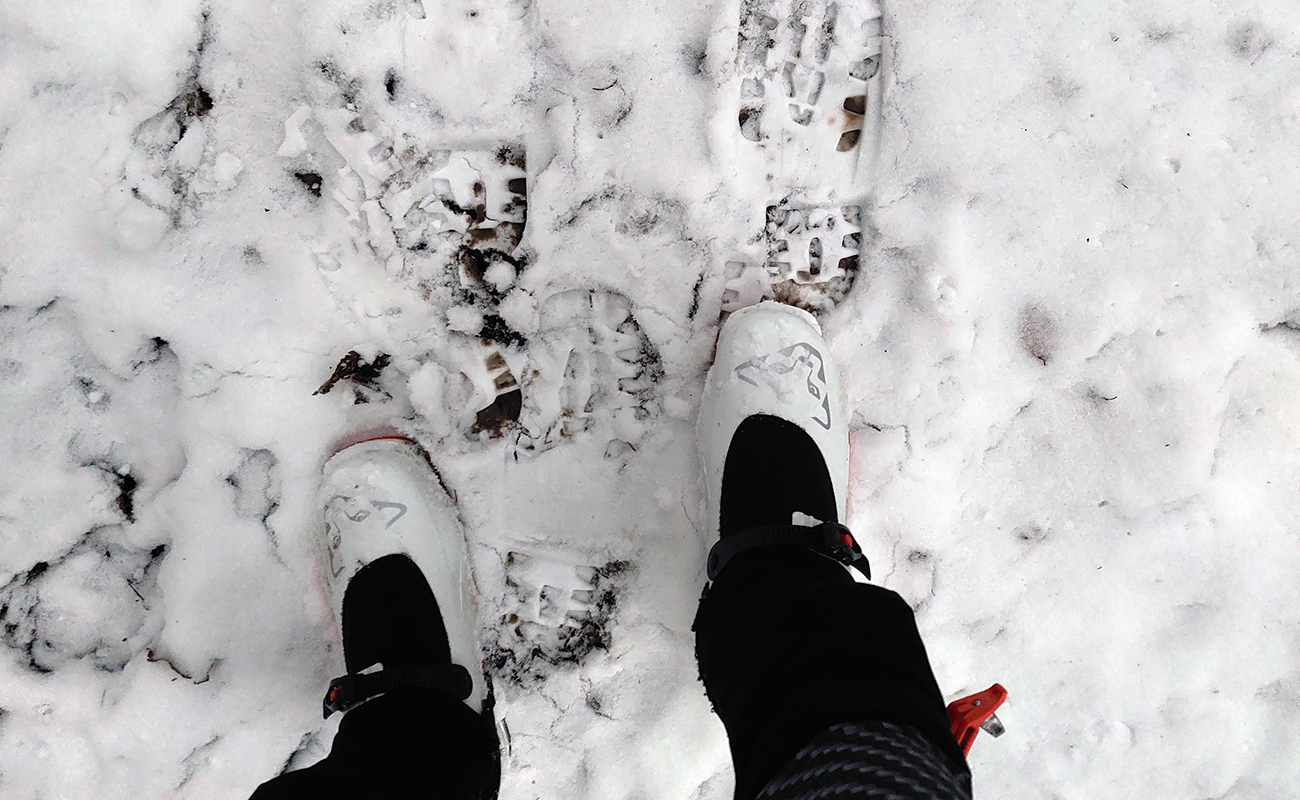 Ráno väčšina stôp odbočovala doľava na Medvediu cestu – a tá je smerom hore čistý komfort a po nočnom snežení aj rozprávka. Len miestami nejaký ten šutrík, treba si dať pozor najmä v strmších úsekoch. Základ? Skoro žiadny, samozrejme trochu biedneho ľadu, popoludní už aj mokroty presvitali na niektorých miestach. Ale zjazdiť sa to dalo aj po okrajoch, „bezpečne a plynulo“.