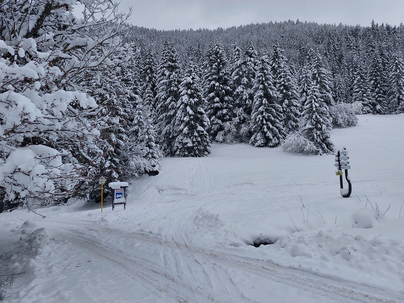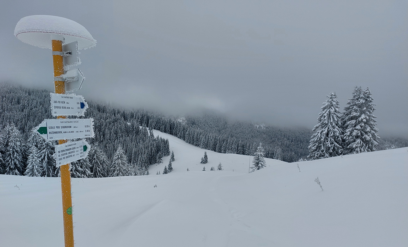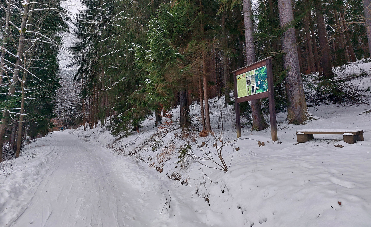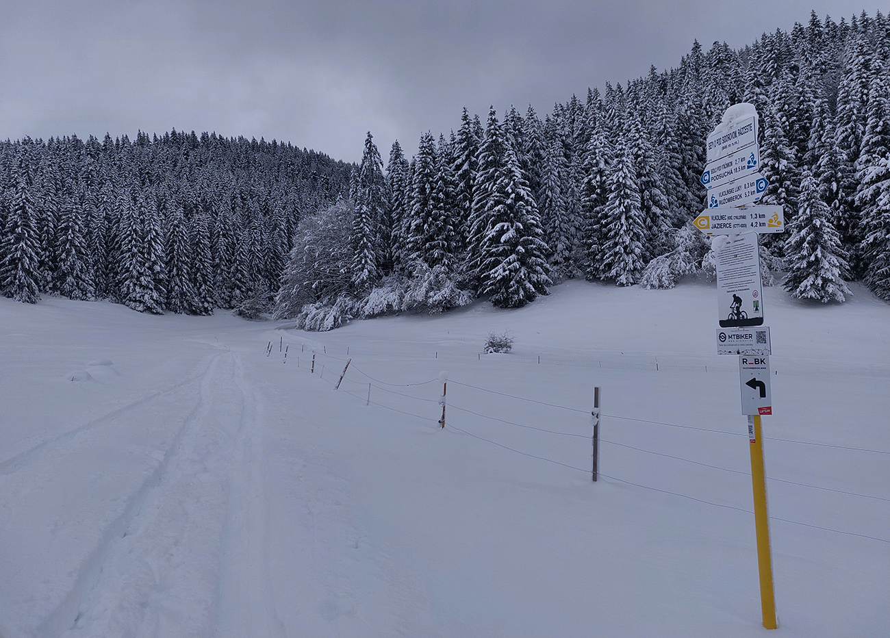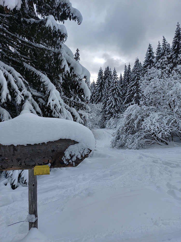 Na serpentíne stopa viedla rovno hore, tak som skúsil doľava, že preleštím cyklotrasu – asi päť cm v noci padlo do prechodenej stopy. Aj tiež jeden statný smrek – tam už to podliezanie také jednoduché nebolo, a ešte na lyžiach. Len také okienko pomedzi vylomené konáre. Inak cesta jedna paráda a okolie ako v zimnej rozprávke.
