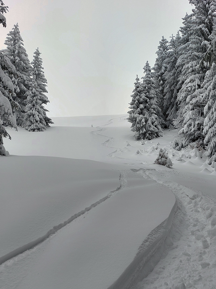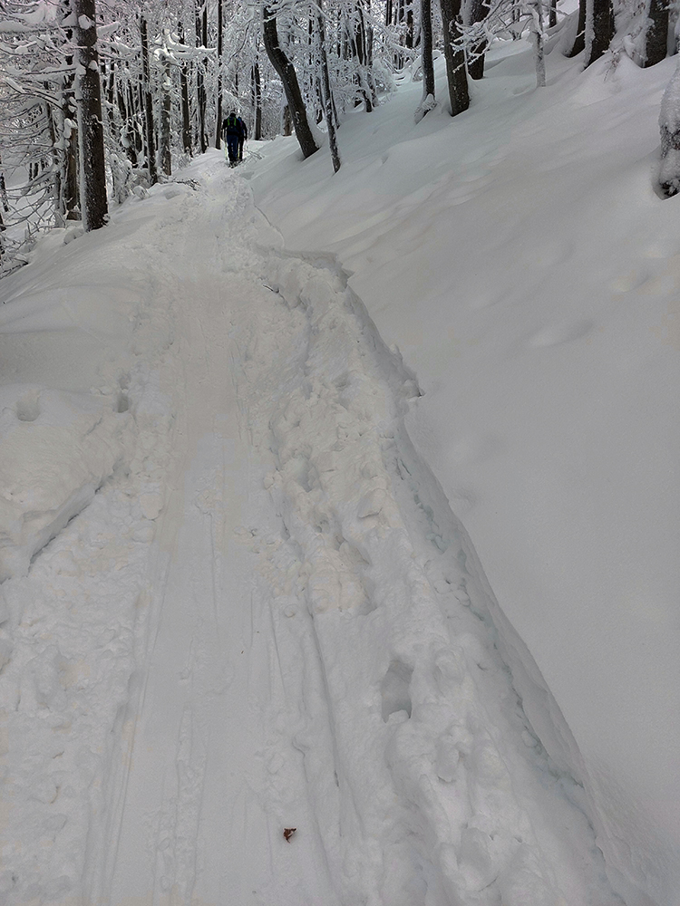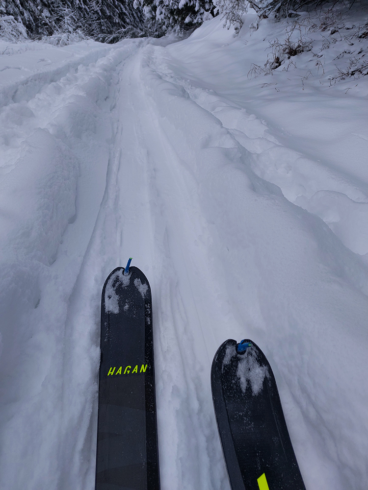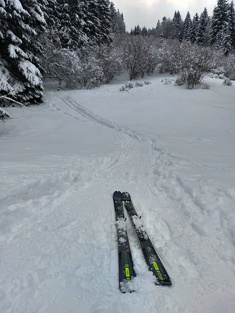 Ešte ostalo času do odjazdu, tak na záver ešte raz hore k lanovke, známym cikcakom lesom. Stopa v čerstvom snehu parádna, hlboká, len pozor! Miestni pretekári ju natiahli ako vždy strmo. Alebo len mojim pásom už končí život?
