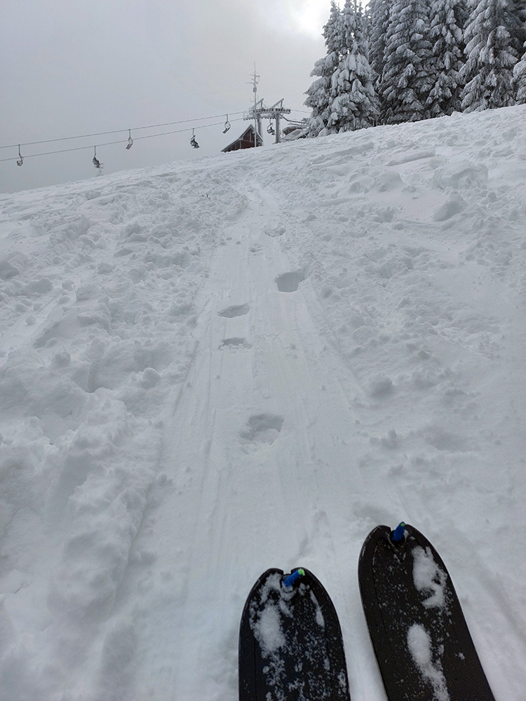 Zjazdovka sa v podstate dá skoro z parkoviska relatívne bezpečne smerom hore a niektorí šialenci ju dávali potom aj smerom dole skoro celú, ale ako vidno vyššie na fotke, je pekne pooraná ratrakom a pomimo jeho zubov síce utlačená, ale trčí z tej špiny všetko, čo trčať môže.
