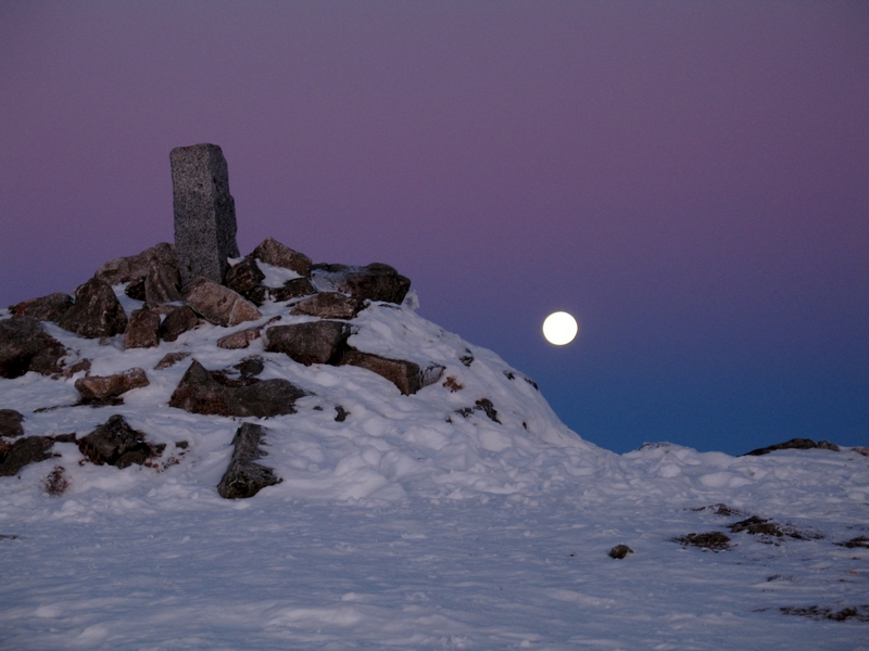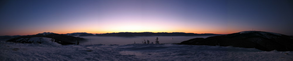 Spicha si dávame vo Vrútkach pod kostolom. Teplomer hlási neľútostných -15°C a hodinky ešte neľútostnejší čas 03:15. Naše kruhy pod očami hovoria za všetko a chabý úsmev na tvári je skôr výsledkom primrznutia mimických svalov ako ozajstnej radosti z pohybu na rannom vzduchu. Ale kto sa dal na boj, musí bojovať. Tak vyrážame zahrievacím tempom na Piatrovú, odkiaľ nás už ďalej povedie modrá značka. Čoskoro nechávame za sebou posledné chaty a pouličné lampy a bočíme na lesný chodník. Kým si oči trochu privyknú na šero a kým sa mesiac prehupne ponad horizont, pomáhame si čelovkami. Aj napriek tomu sa mi dvakrát takmer podarilo nabiť si hubu a vypichnúť ľavé oko. Les na mňa pôsobí hrôzostrašne. Nie som síce nejak extrémne paranoidná, ale asi by som pre istotu mala prestať pozerať tie treťotriedne horory. Nerobí to dobre mojej psychike. Snažím sa preto vytrvalo držať krok s mojím parťákom, veď vo dvojici máme hádam väčšiu šancu ubrániť sa lesným príšerám.Chodník nás prudkým stúpaním vedie cez les a ako motivácia sa nám občas odhalia výhľady do doliny, do jasnej noci vytrvalo svietia svetlá civilizácie. No nemôžeme sa pridlho kochať, sme limitovaní časom východu slnka. Ak to nestihneme, budem mať čo robiť, aby som sa ubránila nasr...ému chlapovi (nasrdenému), ktorého som zbytočne vytiahla o pol tretej z postele. A tak sledujeme vyšlapaný chodník, na ktorom mesiac pomedzi stromy vytvára záhadné obrazy. Míňame Diaľnu a po vyše dvoch hodinách sa konečne dostávame nad hranicu lesa. Načase, lebo od východu sa už nad horami začína nebo sfarbovať ružovými farbami. Najprv zvažujeme pre istotu rozložiť pozorovací tábor už tu, ale nakoniec sa mi darí presvedčiť nás obidvoch, že to ešte stihneme vyšlapať na vrchol, kým sa slnko prehupne cez horizont. Nasadzujeme zrýchlené tempo, popri kanóne v sedle Okopy len prefrčíme (teda aspoň ja; kamarát stíha aj vytiahnuť statív a fotiť).