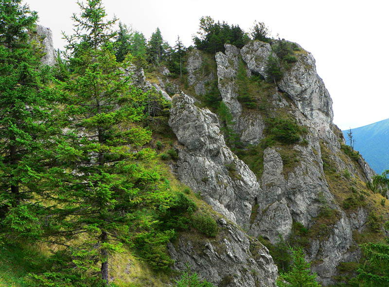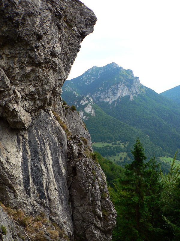 Nasleduje poriadne prudký zostup dolu z Bobot k asfaltke a rovnako prudký výstup na Malé nocľahy v masíve Sokolia. Zo dve krátke reťaze na pomoc, do Sokolia aj schodíky, ale hlavne veľa skál, veží, vežičiek nad hlavou a pod nohami ešte viac voľnej sute. Radosť padať :-) Len na to že sme v NPR Tiesňavy, dosť zaskočí pohľad na výsek s elektrickým vedením - priamo pomedzi skalné veže. Slovenská realita...