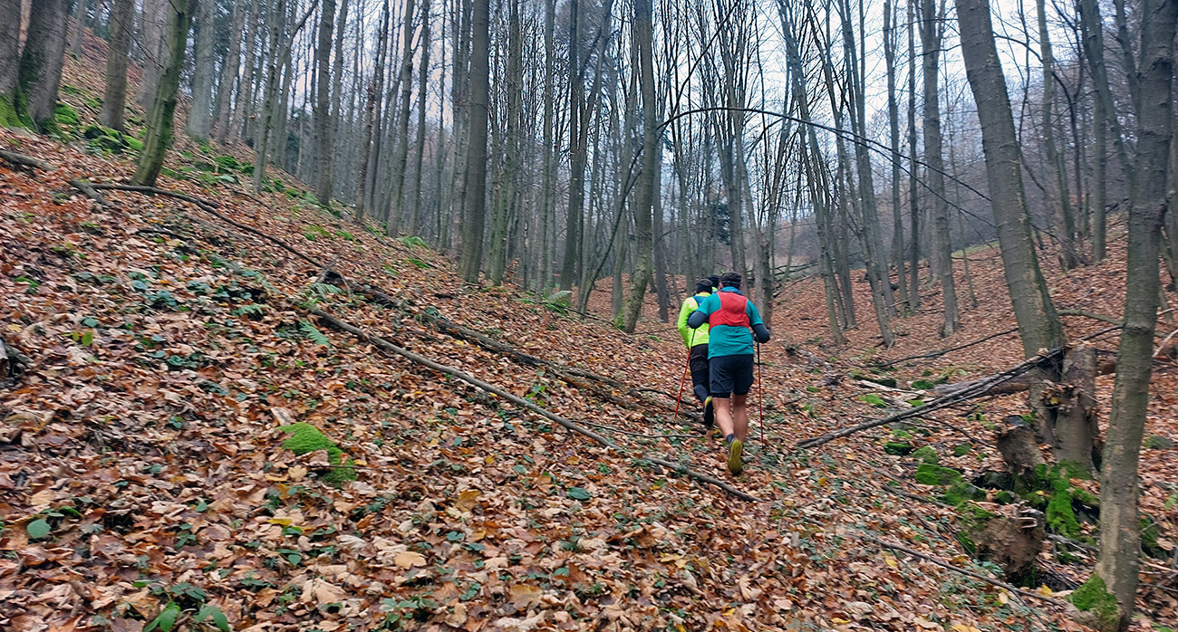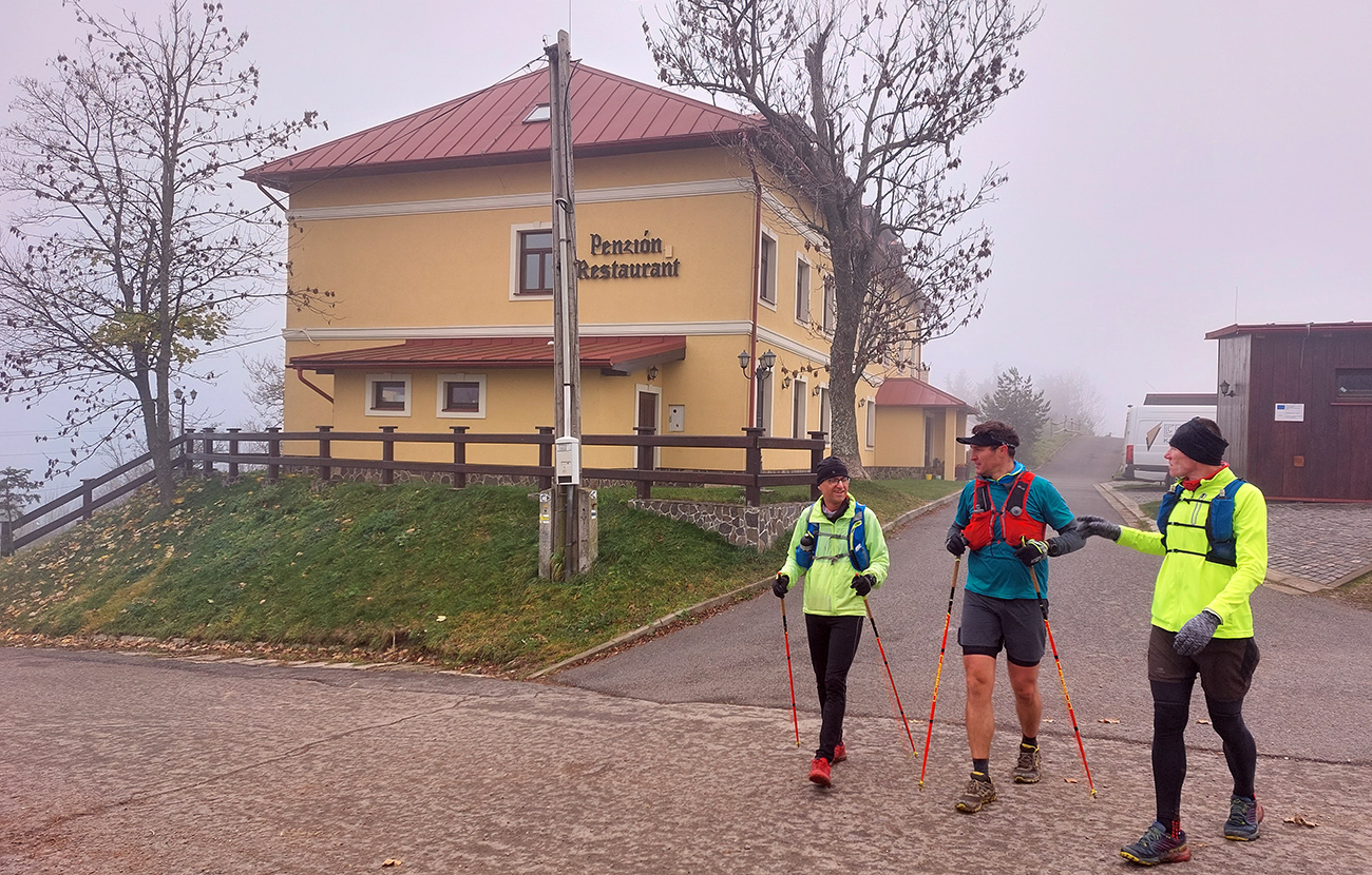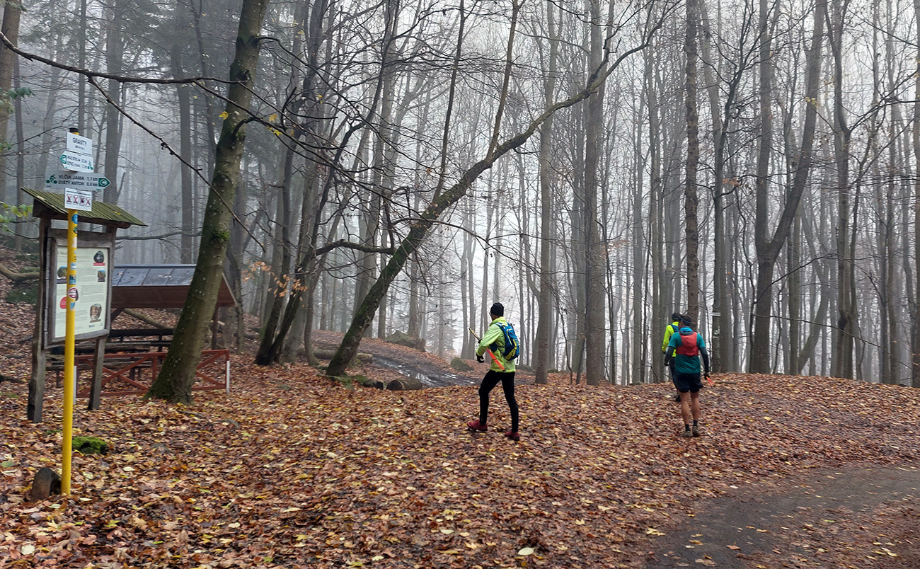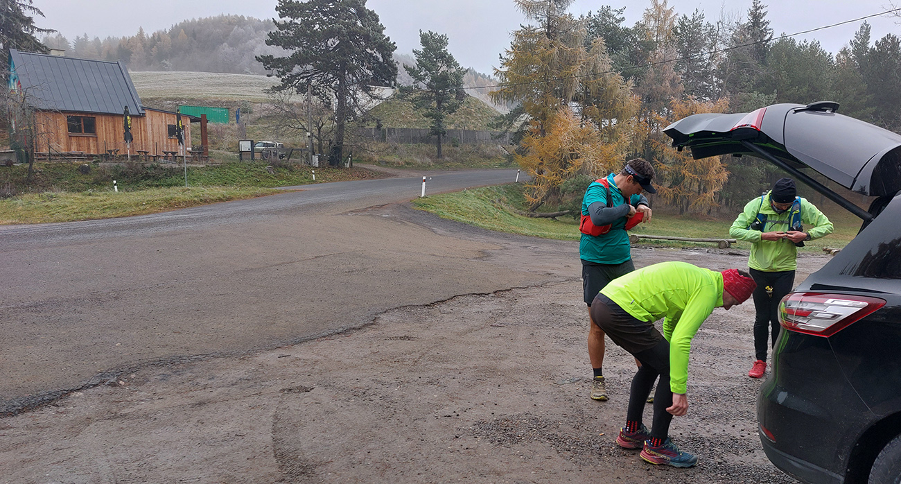 Názov preto taký podobný staršiemu článku ( TU alebo odkaz dole), lebo zostava sa nazbierala úplne rovnaká ako takto pred dvoma rokmi na pobehu okolo Nitrianskeho Pravna. Aj dátum skoro sadol, tri týždne hore dole, to je nič. A možno ešte niečo dáme aj neskôr... Zámer bol vraj tentokrát nejako sa prehupnúť cez Kľak do Rajeckej doliny a nazad, ale hore nasnežilo a keď už aj prestalo, mraky viseli odporne nízko. Tak huspeninový pes dostal dôveru a naklikal niečo v Štiavnických vrchoch, že tam je pekne, aj keď je škaredo. A keď to tam vraj trochu pozná... Ale hlavne je to nižšie a južnejšie. A že vraj to ani ultraparametre nemusí mať, že max. do 30 km, lebo že jeden z partie je na tom biedne. No to sa ale H.P. náramne potešil, že nebude zase za brzdu, lebo po Stovke Považím je na tom dosť biedne tiež. Nohy stále huspeninové, ale to v podstate už od jari, tak čo? Tak vlastne nič, a už sme sa ráno za tmy pekne postupne zbierali do auta a pred ôsmou už sme v hnusnej, vlhkej, osrienenej kose poskakovali v sedle Červená studňa a snažili sa rozkývať telá do prevádzkového režimu. Za nechty poriadne zachádzalo, ešte že nefúkalo.