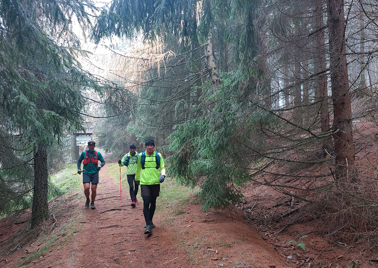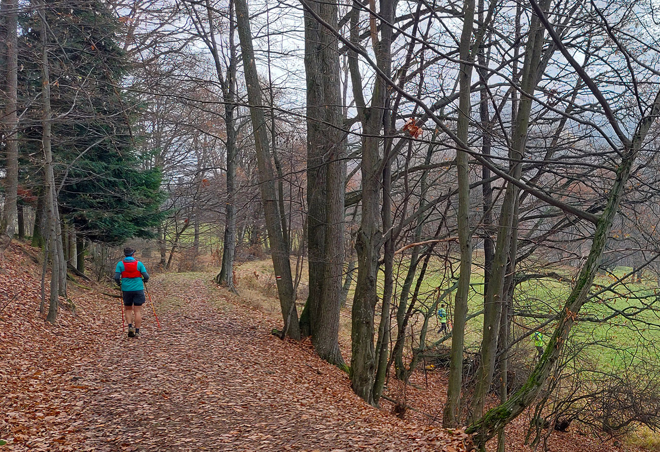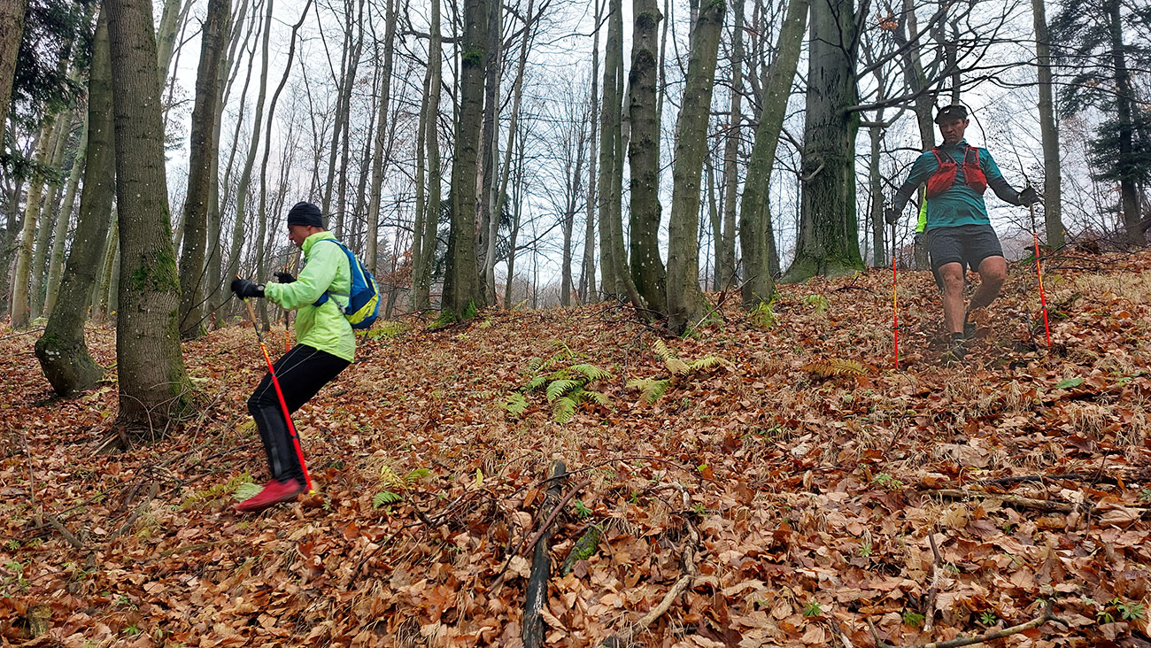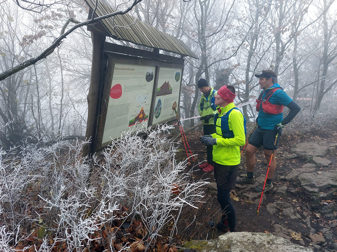 Názov preto taký podobný staršiemu článku ( TU alebo odkaz dole), lebo zostava sa nazbierala úplne rovnaká ako takto pred dvoma rokmi na pobehu okolo Nitrianskeho Pravna. Aj dátum skoro sadol, tri týždne hore dole, to je nič. A možno ešte niečo dáme aj neskôr... Zámer bol vraj tentokrát nejako sa prehupnúť cez Kľak do Rajeckej doliny a nazad, ale hore nasnežilo a keď už aj prestalo, mraky viseli odporne nízko. Tak huspeninový pes dostal dôveru a naklikal niečo v Štiavnických vrchoch, že tam je pekne, aj keď je škaredo. A keď to tam vraj trochu pozná... Ale hlavne je to nižšie a južnejšie. A že vraj to ani ultraparametre nemusí mať, že max. do 30 km, lebo že jeden z partie je na tom biedne. No to sa ale H.P. náramne potešil, že nebude zase za brzdu, lebo po Stovke Považím je na tom dosť biedne tiež. Nohy stále huspeninové, ale to v podstate už od jari, tak čo? Tak vlastne nič, a už sme sa ráno za tmy pekne postupne zbierali do auta a pred ôsmou už sme v hnusnej, vlhkej, osrienenej kose poskakovali v sedle Červená studňa a snažili sa rozkývať telá do prevádzkového režimu. Za nechty poriadne zachádzalo, ešte že nefúkalo.