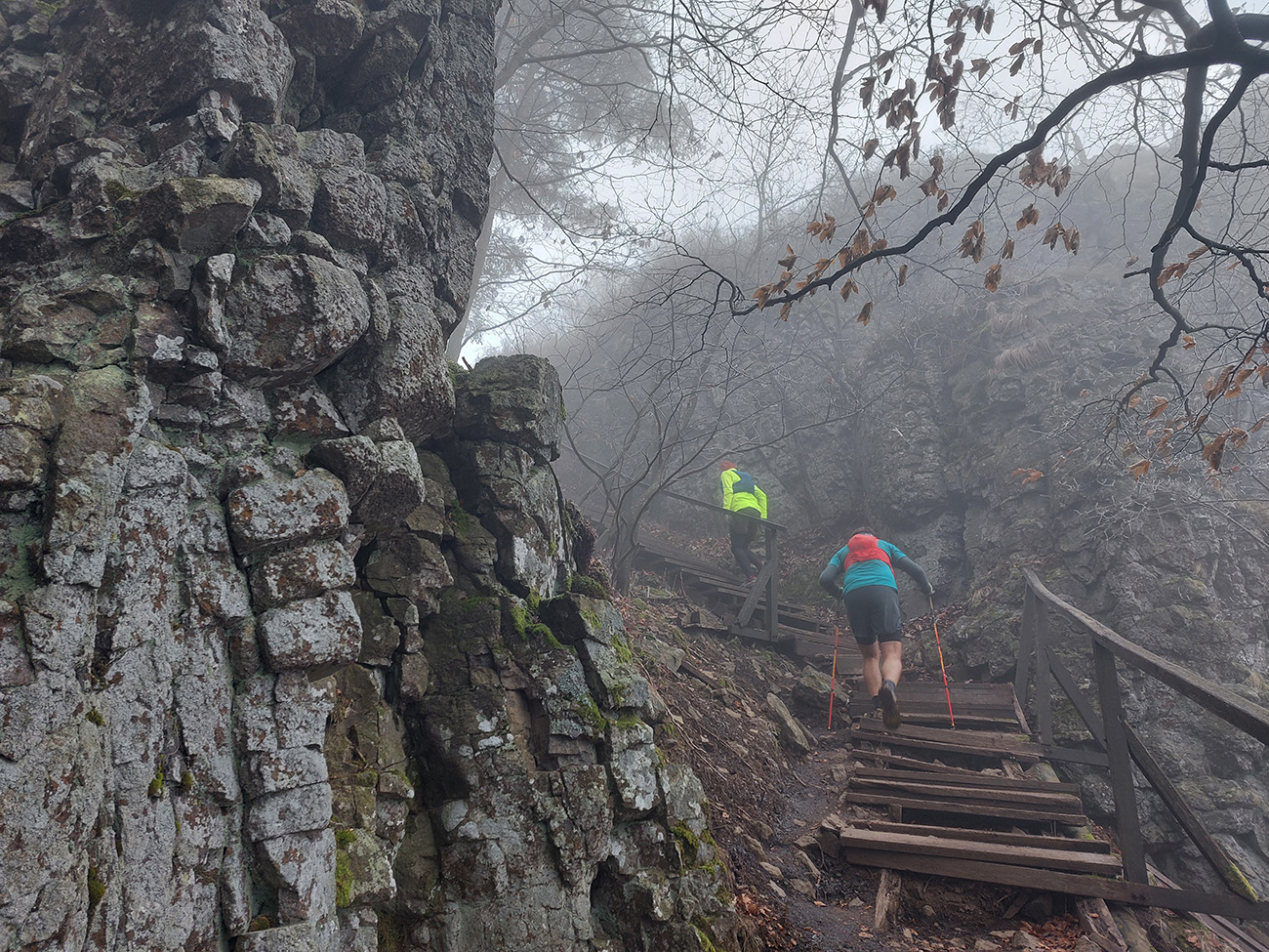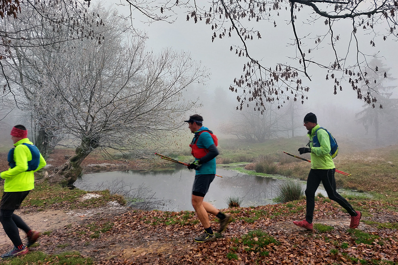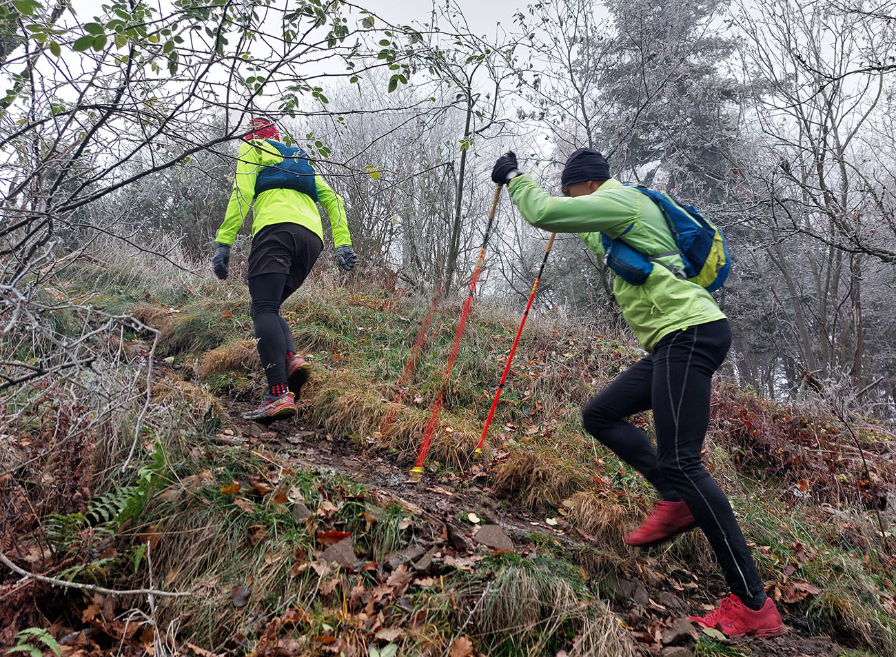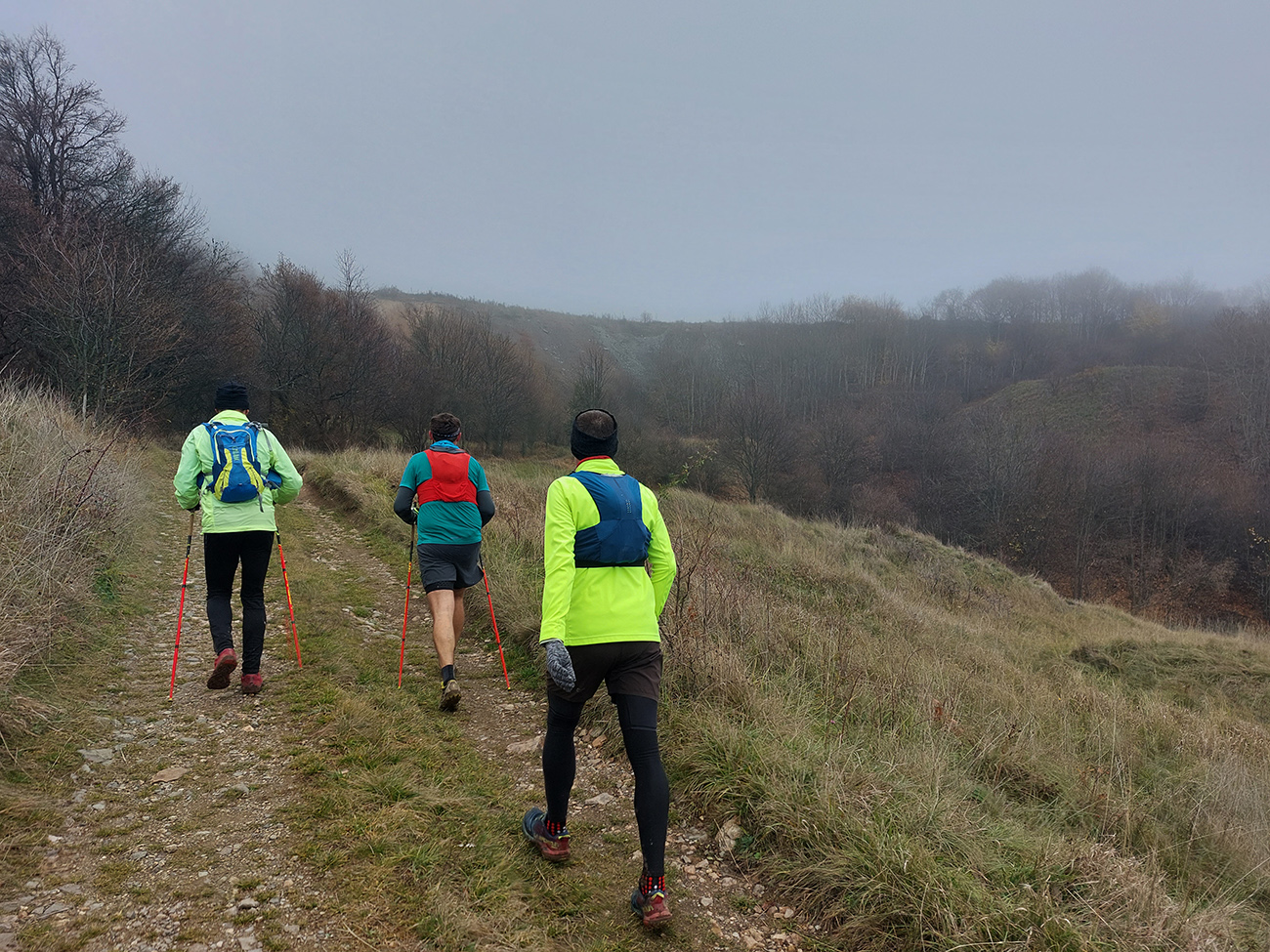 Názov preto taký podobný staršiemu článku ( TU alebo odkaz dole), lebo zostava sa nazbierala úplne rovnaká ako takto pred dvoma rokmi na pobehu okolo Nitrianskeho Pravna. Aj dátum skoro sadol, tri týždne hore dole, to je nič. A možno ešte niečo dáme aj neskôr... Zámer bol vraj tentokrát nejako sa prehupnúť cez Kľak do Rajeckej doliny a nazad, ale hore nasnežilo a keď už aj prestalo, mraky viseli odporne nízko. Tak huspeninový pes dostal dôveru a naklikal niečo v Štiavnických vrchoch, že tam je pekne, aj keď je škaredo. A keď to tam vraj trochu pozná... Ale hlavne je to nižšie a južnejšie. A že vraj to ani ultraparametre nemusí mať, že max. do 30 km, lebo že jeden z partie je na tom biedne. No to sa ale H.P. náramne potešil, že nebude zase za brzdu, lebo po Stovke Považím je na tom dosť biedne tiež. Nohy stále huspeninové, ale to v podstate už od jari, tak čo? Tak vlastne nič, a už sme sa ráno za tmy pekne postupne zbierali do auta a pred ôsmou už sme v hnusnej, vlhkej, osrienenej kose poskakovali v sedle Červená studňa a snažili sa rozkývať telá do prevádzkového režimu. Za nechty poriadne zachádzalo, ešte že nefúkalo.