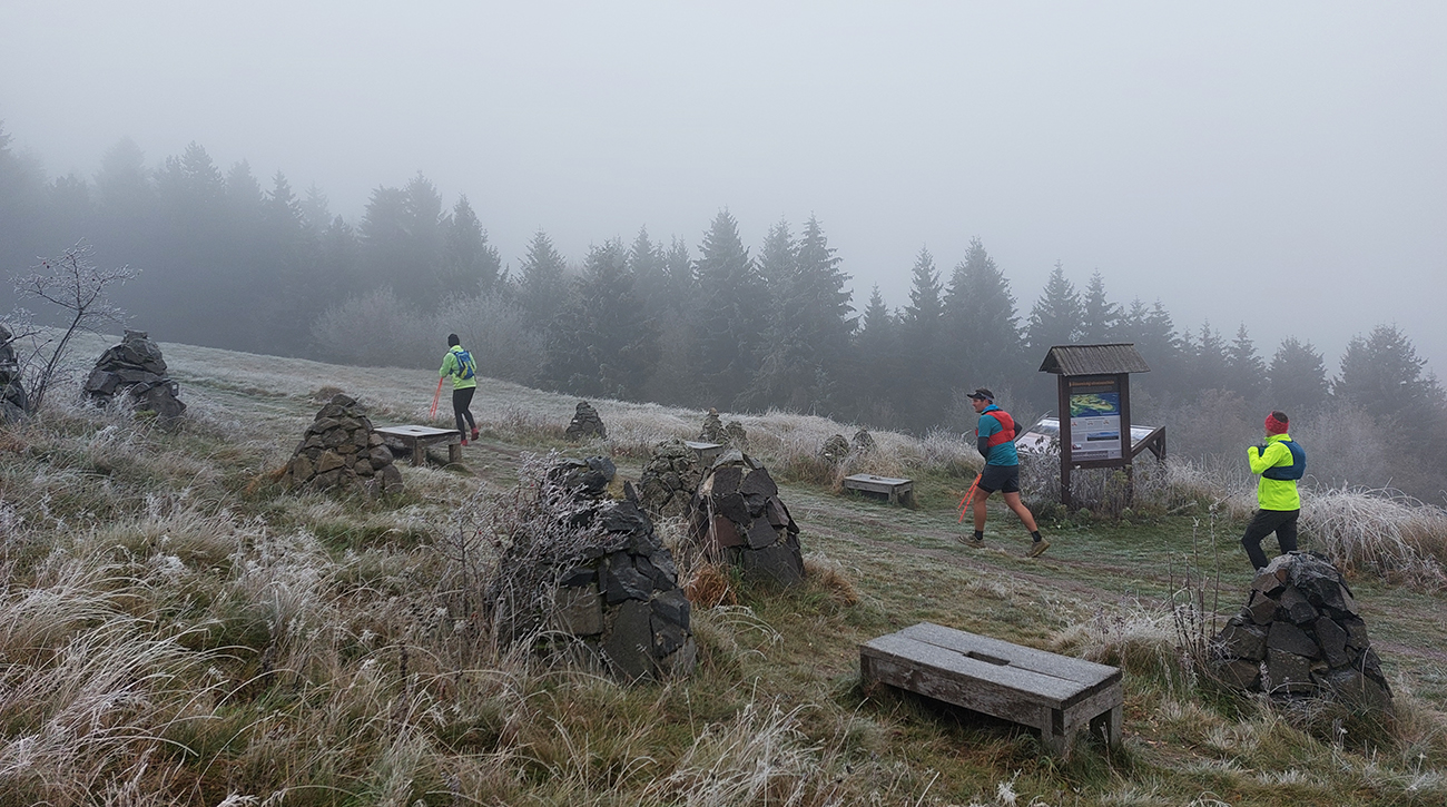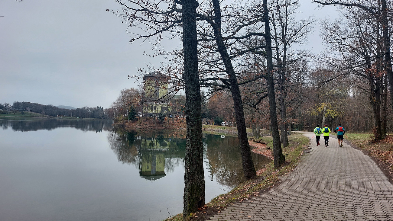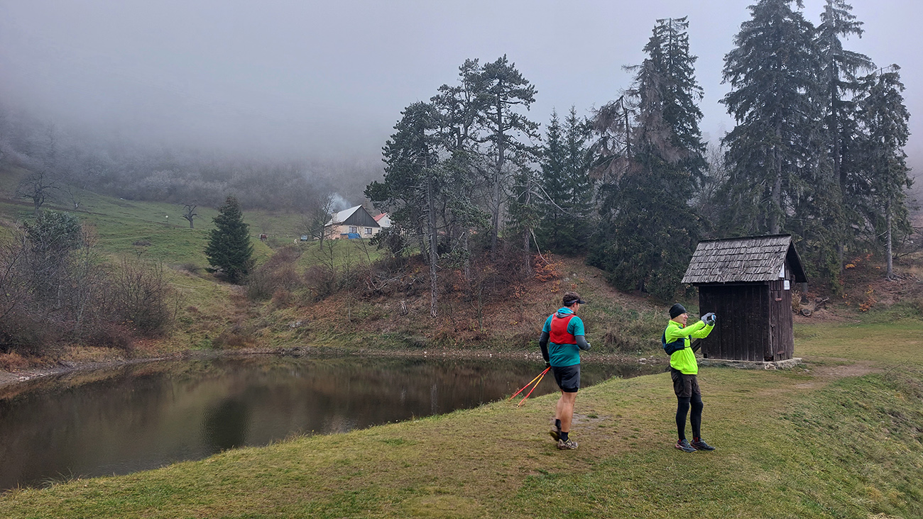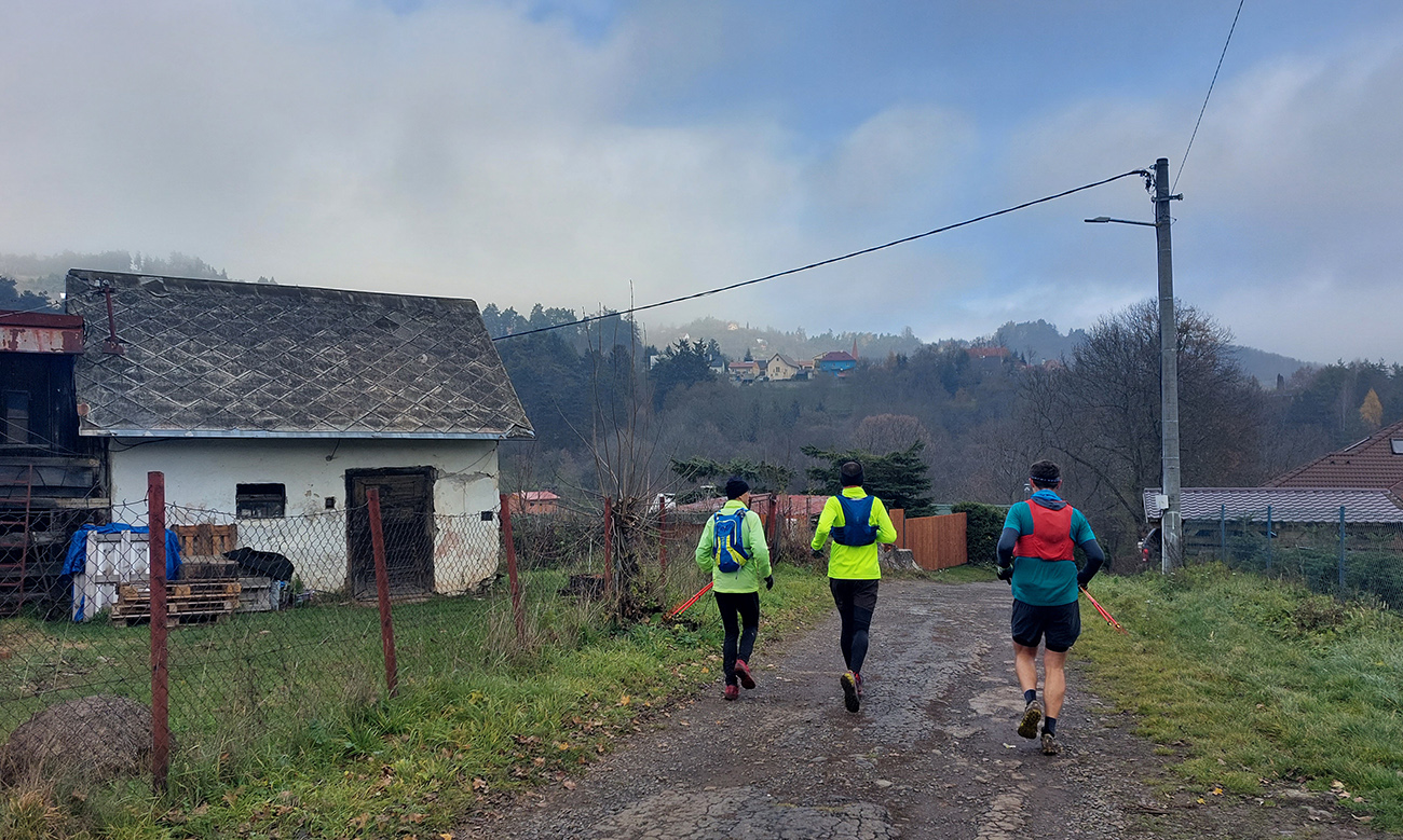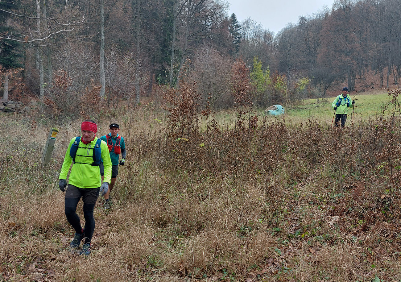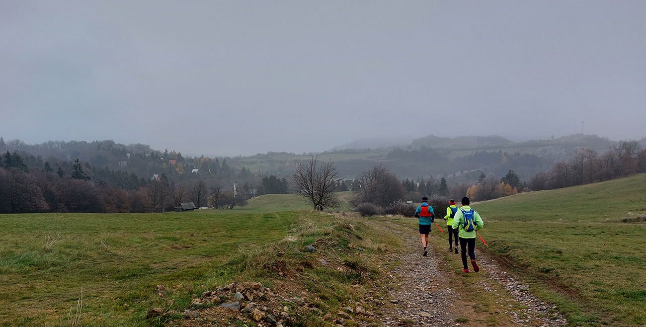 Krajina je tu ale všade pekná aj v škaredom počasí, alebo aspoň pestrá – a vraj ak by bolo pekne a boli by výhľady, mali by sme len zbytočne dlhé a časté prestoje a fotopauzy :-) No tak si vyber... Bola síce ešte naplánovaná aj zachádzočka na druhú stranu od štartu/cieľa, keby boli zúčastnení moc premotivovaní, ale to už sa nikomu nechcelo, zaokrúhľovať to na ultravzdialenosť. Úplne stačilo poniektorým zabehnúť kúsok do lesa a nazad, zaokrúhliť na 28 km. Čo sú toto za úchylky, že? Ale vďaka partii, že vzala aj huspeninového psa a vďaka aj za modeling. Každopádne okolo BŠ sa toho dá navymýšľať neskutočne veľa, isto sa sem ešte vrátime, a nielen na októbrový Ultrapank.