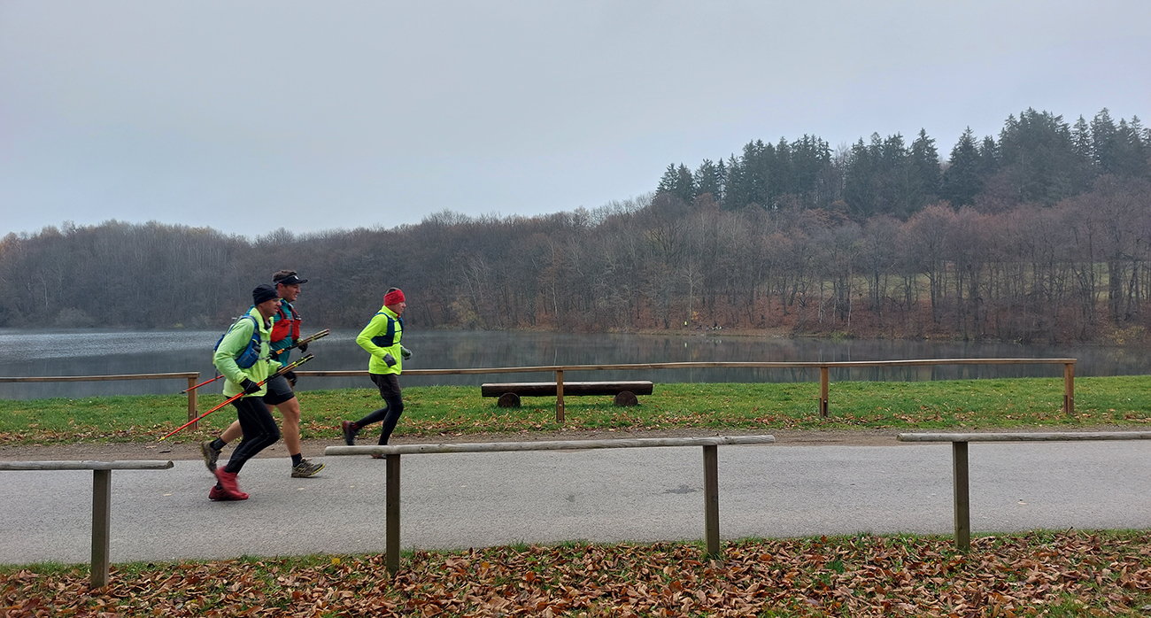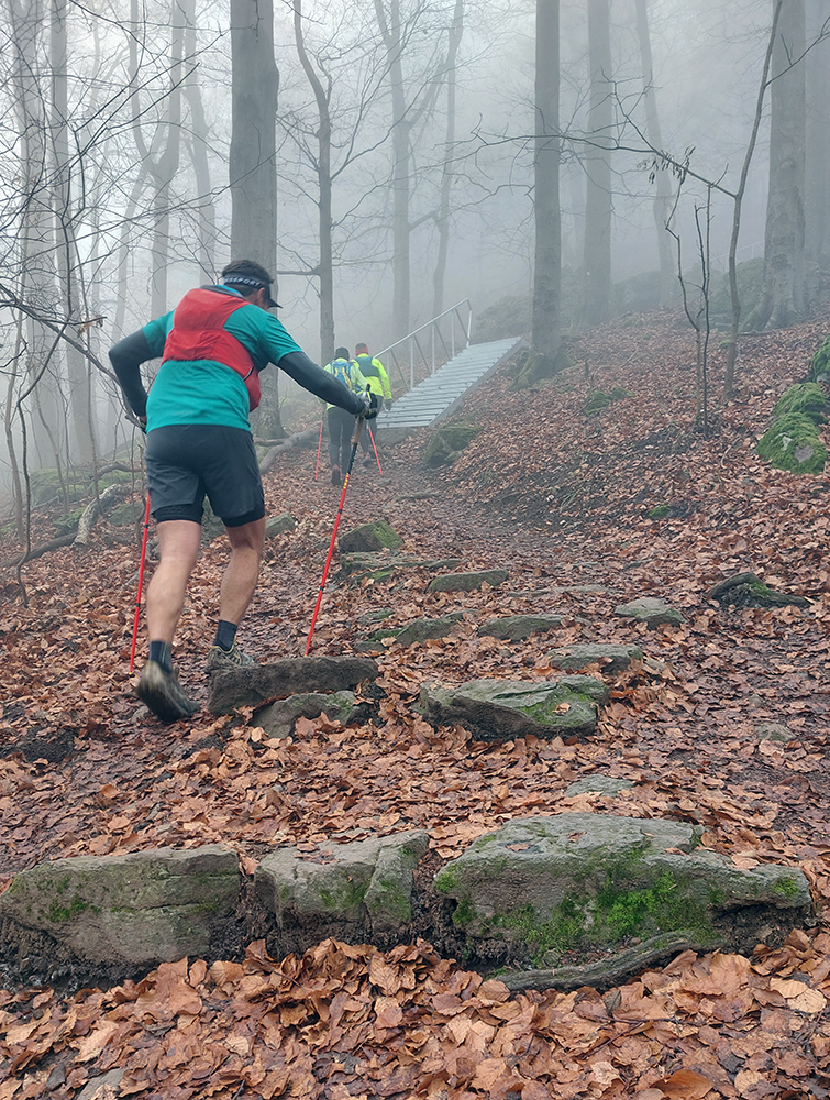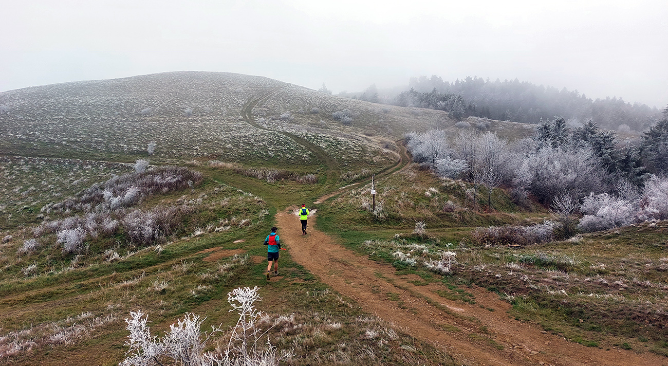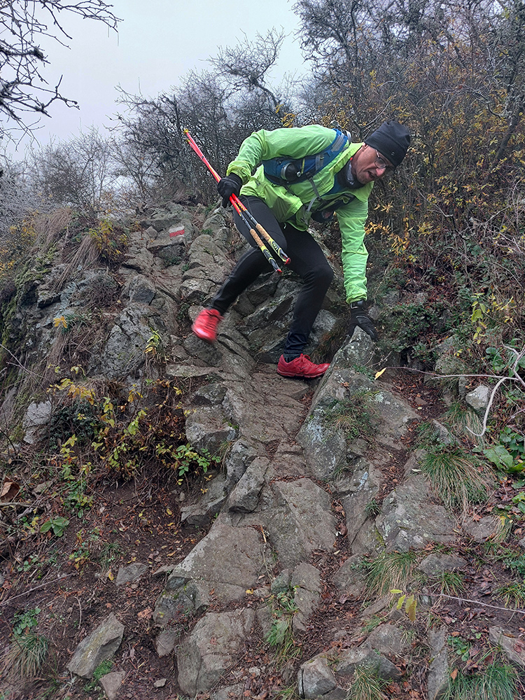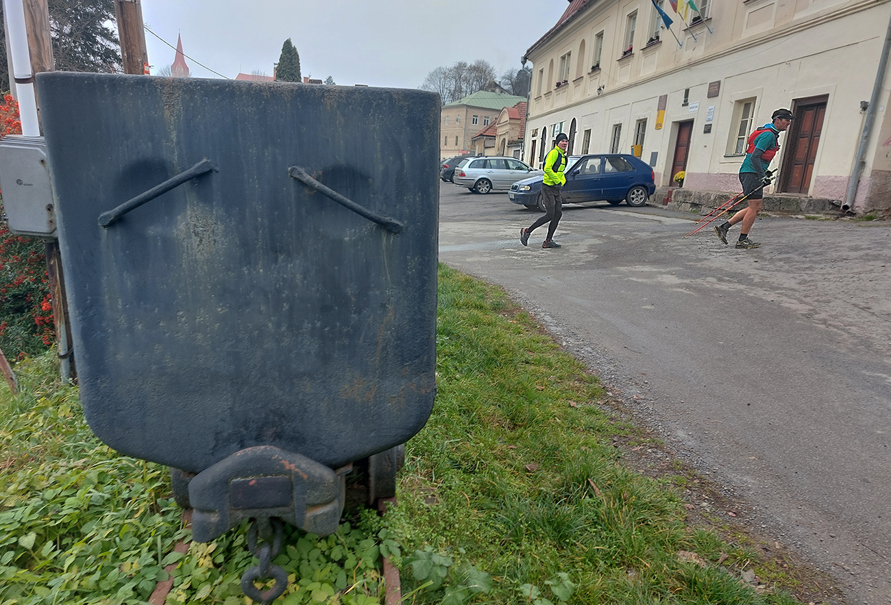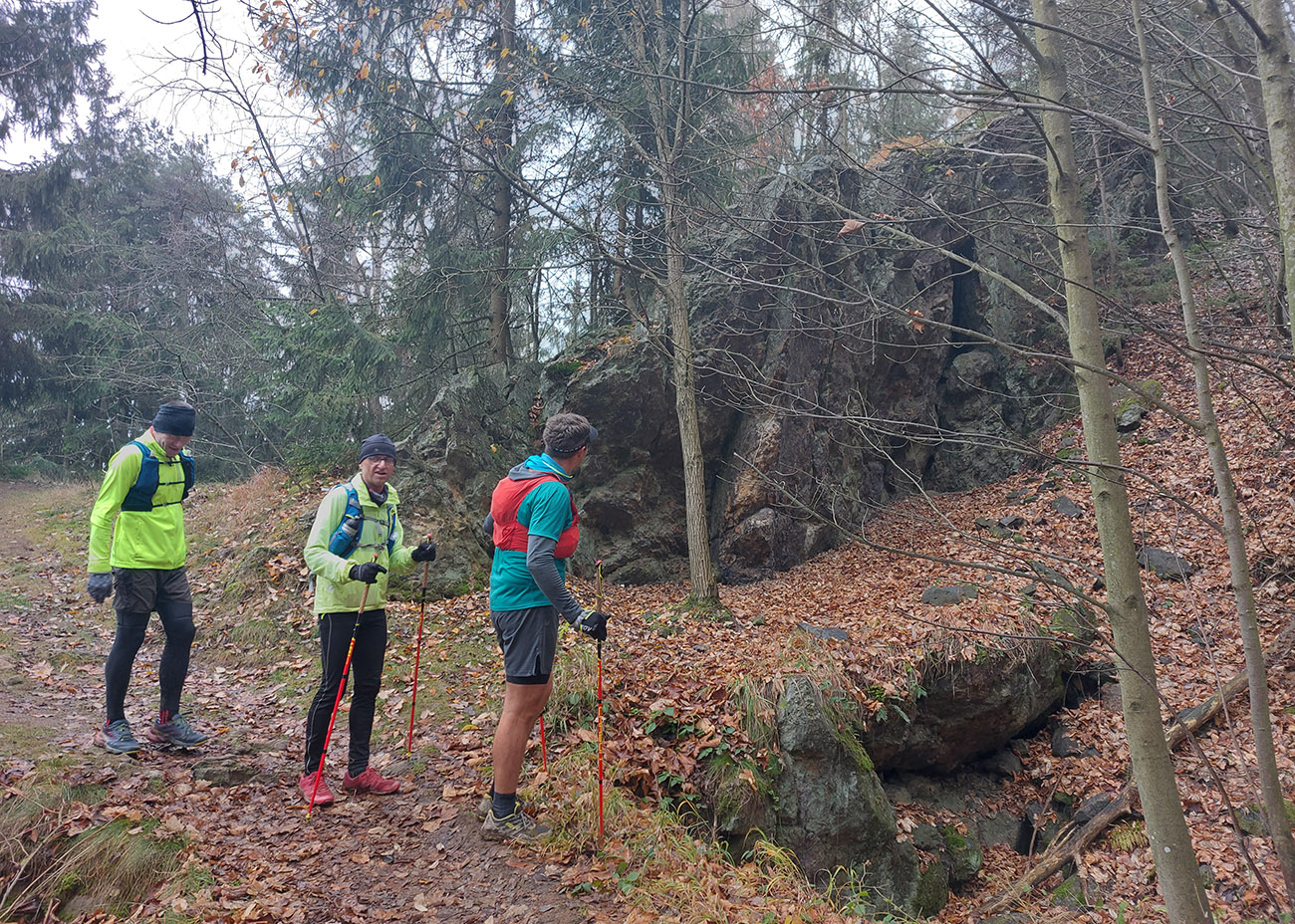 Krajina je tu ale všade pekná aj v škaredom počasí, alebo aspoň pestrá – a vraj ak by bolo pekne a boli by výhľady, mali by sme len zbytočne dlhé a časté prestoje a fotopauzy :-) No tak si vyber... Bola síce ešte naplánovaná aj zachádzočka na druhú stranu od štartu/cieľa, keby boli zúčastnení moc premotivovaní, ale to už sa nikomu nechcelo, zaokrúhľovať to na ultravzdialenosť. Úplne stačilo poniektorým zabehnúť kúsok do lesa a nazad, zaokrúhliť na 28 km. Čo sú toto za úchylky, že? Ale vďaka partii, že vzala aj huspeninového psa a vďaka aj za modeling. Každopádne okolo BŠ sa toho dá navymýšľať neskutočne veľa, isto sa sem ešte vrátime, a nielen na októbrový Ultrapank.