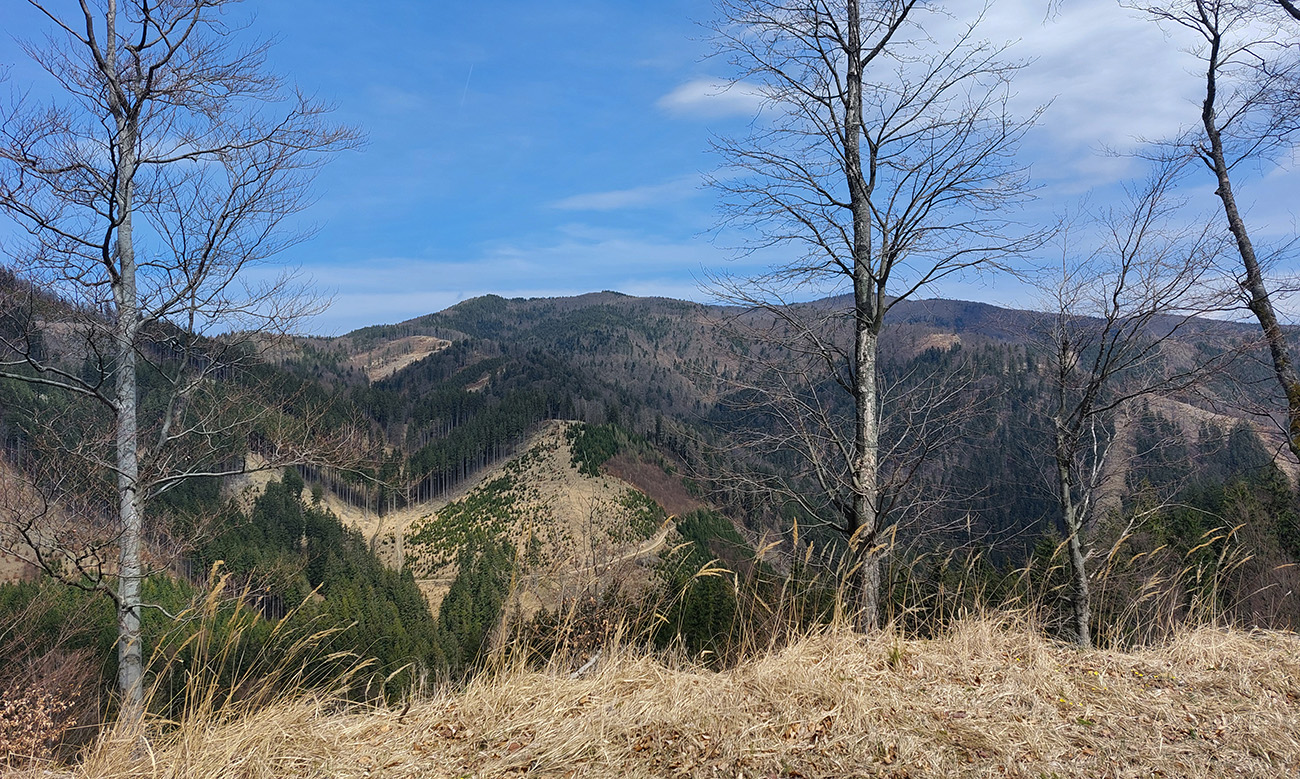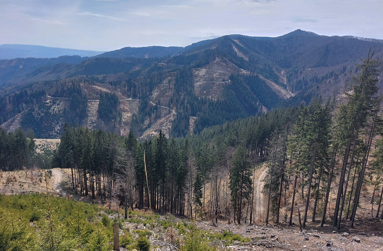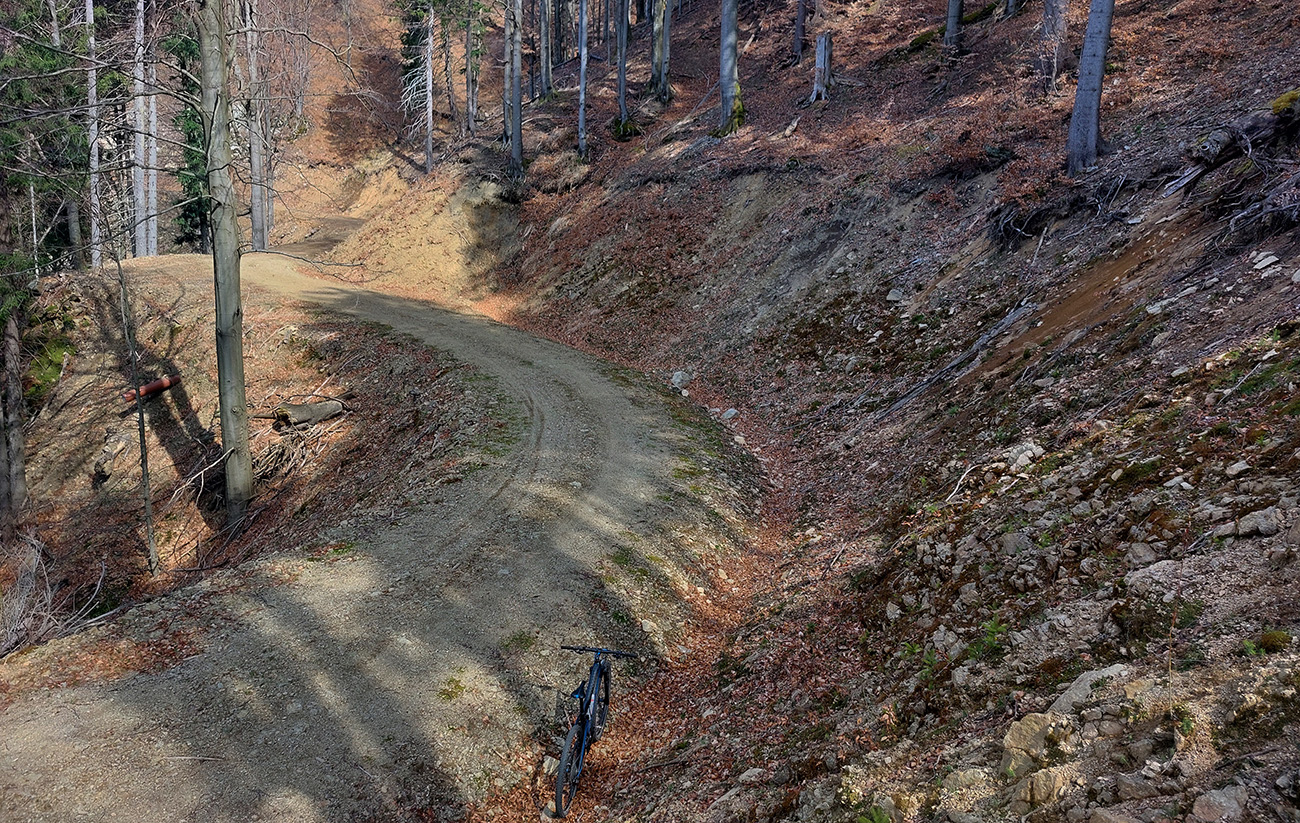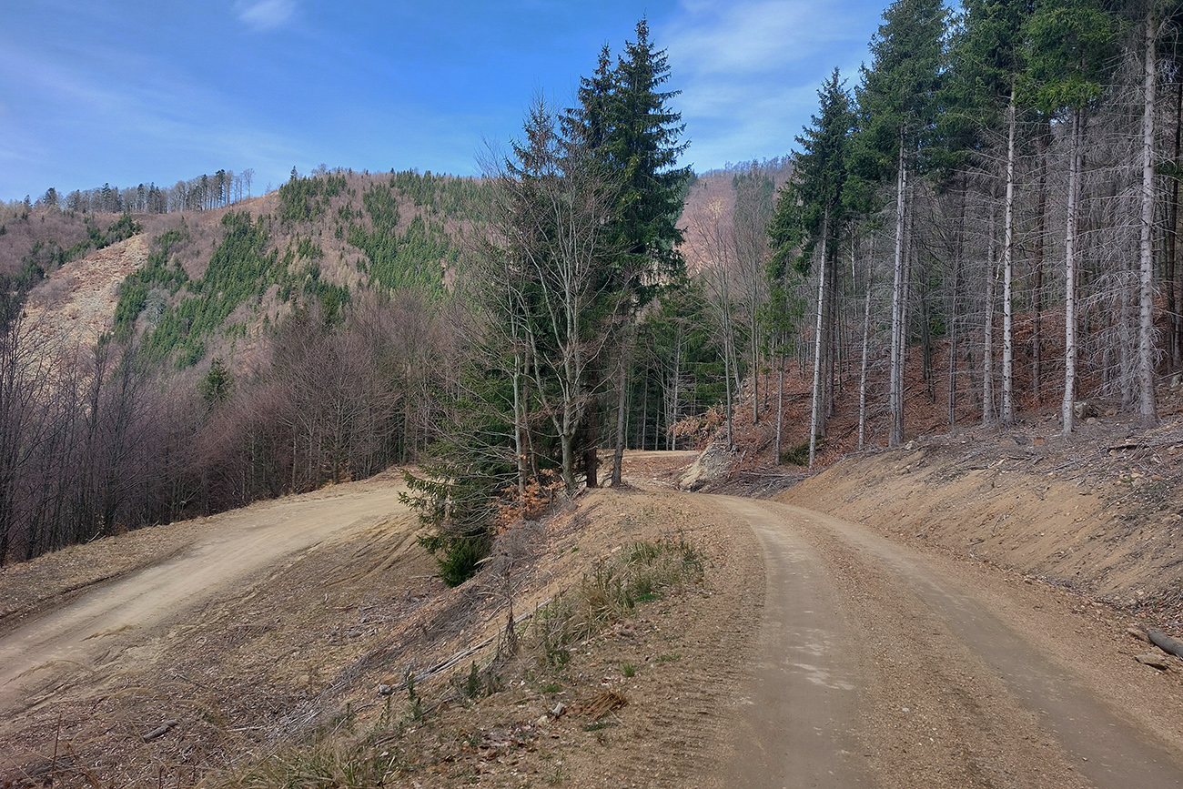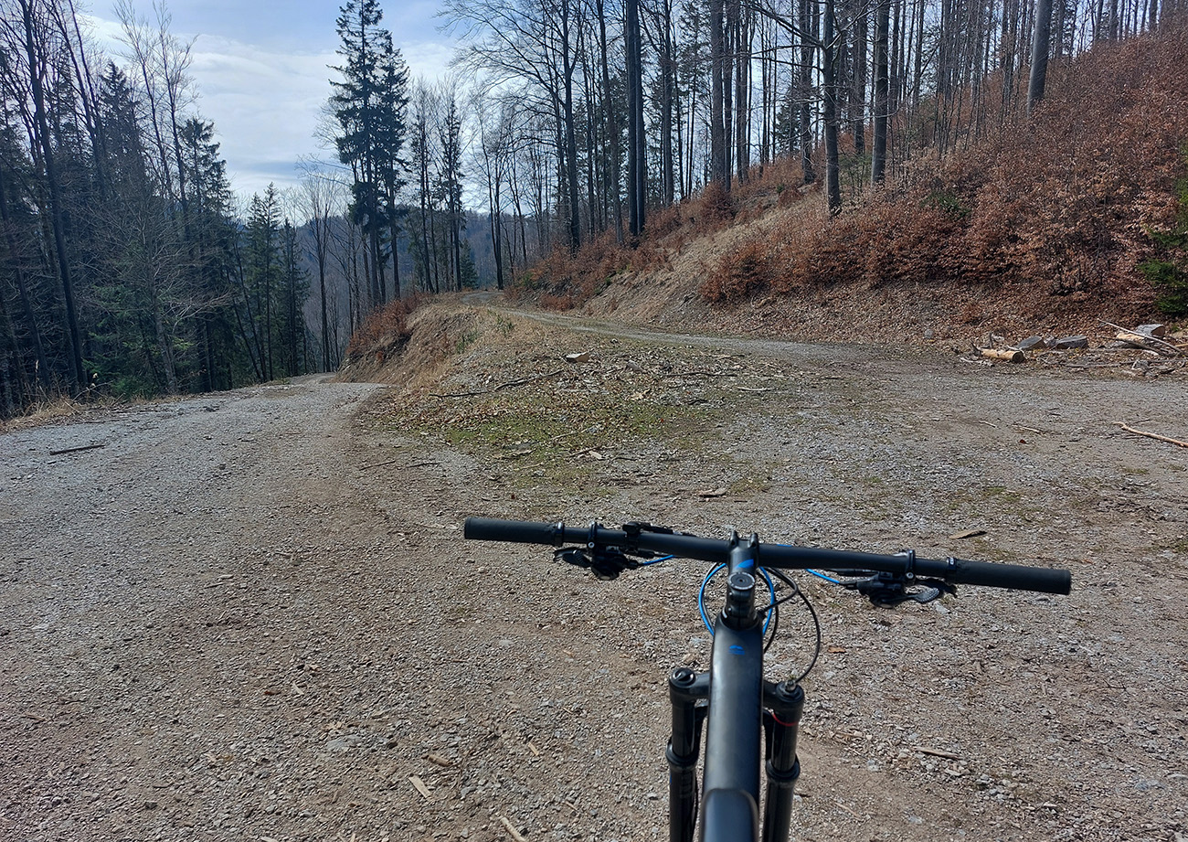 Asi 30-kilometrový okruh v Lúčanskej Malej Fatre, na turčianskej strane, okolo doliny so známym lyžiarskym strediskom. Tréningový preto, lebo chrtivý potenciál je tam vysoký, estetický o dosť nižší, miestami sa prepadá hlboko do mínusu. Najmä na severnom okraji doliny, kade som sa štveral hore. Ale pod kolesami pohodlná, zväčša rovná šotolina, samé lesné cesty, žiadne prekvapenia, aj gravel by sa miestami nudil. No héééj, aj výhľady sú – cez rúbaniská na rúbaniská. Aj hlboko do riedkych lesov vidno, lebo veľa tých ciest je surových, nových, ešte im okraje nestihli zarásť. Tak je to vhodné aj pre medveďofóbov. Čiernych kôpok sa tam na cestách vždy niekoľko nájde :-)