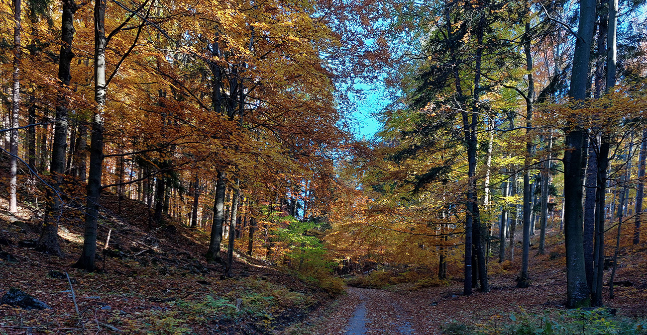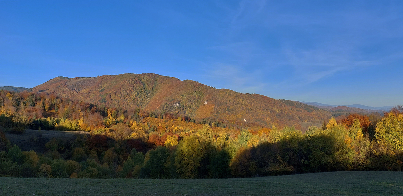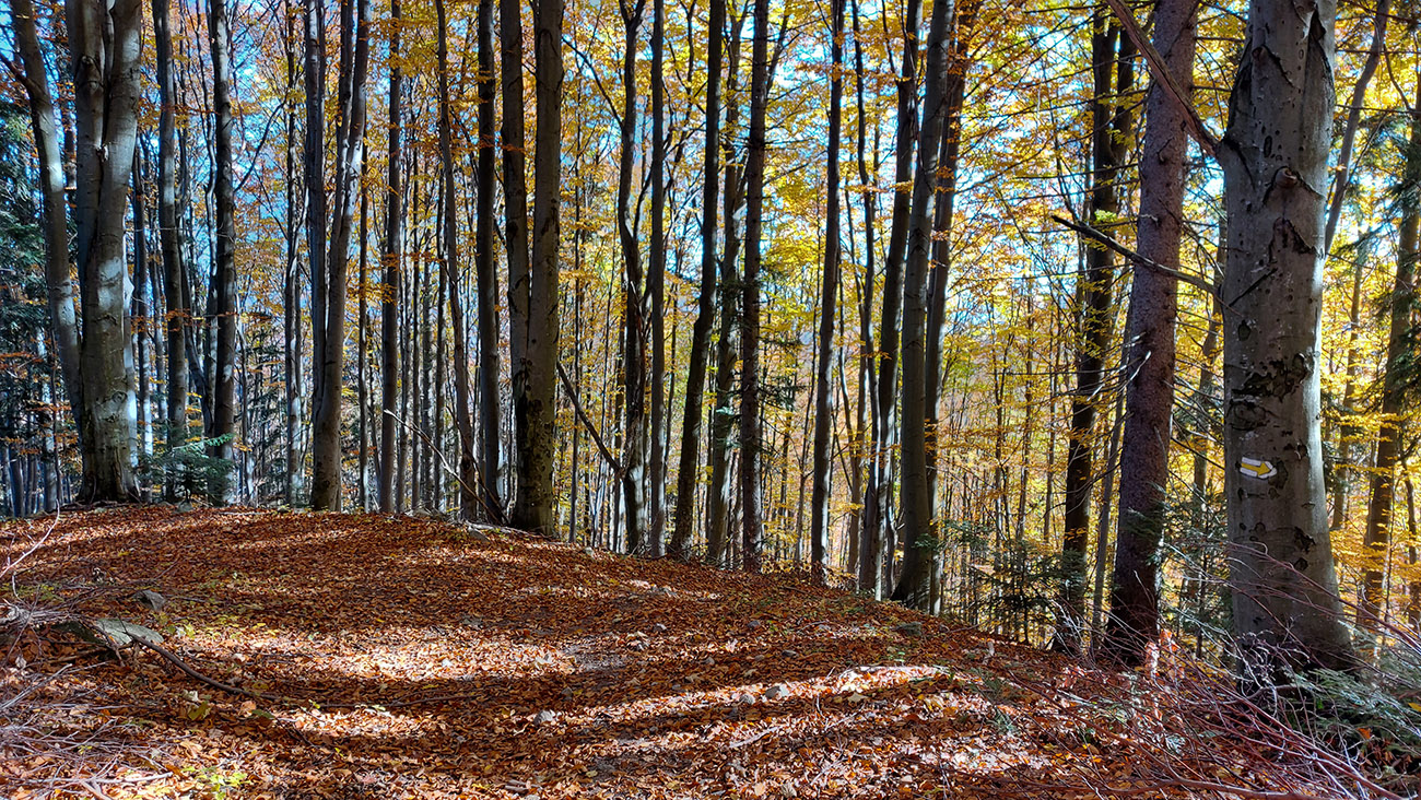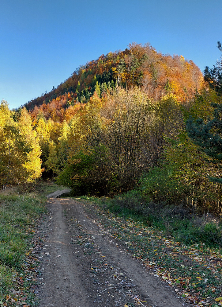 Názov hádam dobre vystihuje filozofiu tejto prechádzky. Predposledná októbrová nedeľa totiž vyšla neskutočne, čo sa počasia týka. Mrazivé ráno, obloha vymetená, vzduch ostrý, po fronte prečistený a do toho všetky farby jesene v najjasnejších odtieňoch. Jeden z tých nemnohých „superturistických“ dní, kedy hádam aj prechádzka rúbaniskom je potešením pre oko. Zaniesol ma do Kremnických vrchov, na ich západné úpätie. Potreboval som sa odtiaľ dostať do Banskej Bystrice, ale na hlavných turistických trasách isto bolo plno ľudí – preto nastúpila tá improvizácia a hľadanie kadejakých bočných a turisticky neoficiálnych cestičiek, po značkách aj mimo nich. Kremnické vrchy majú samozrejme tých možností strááášne veľa.