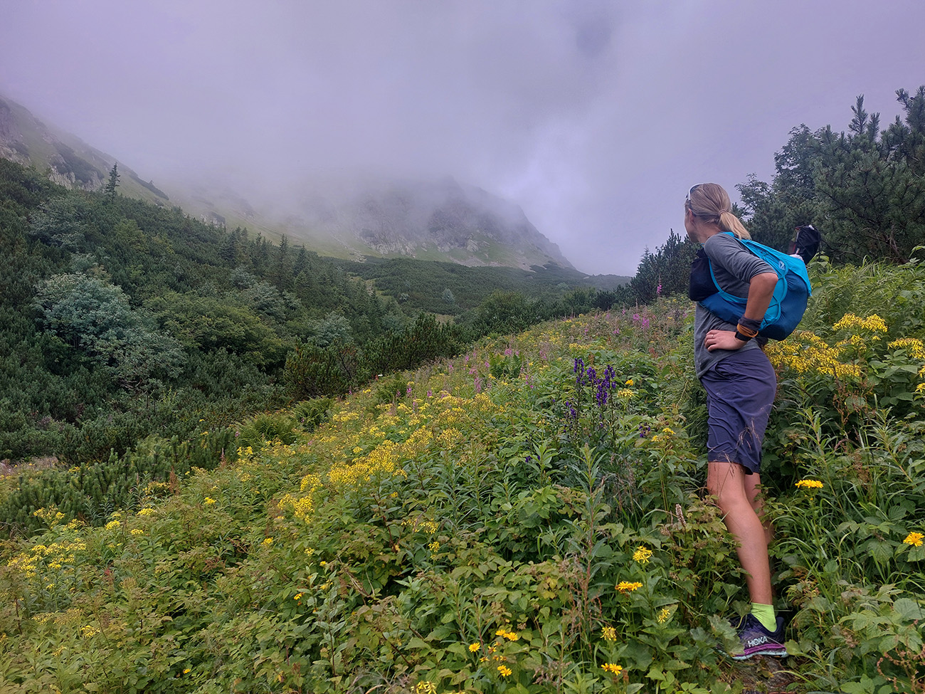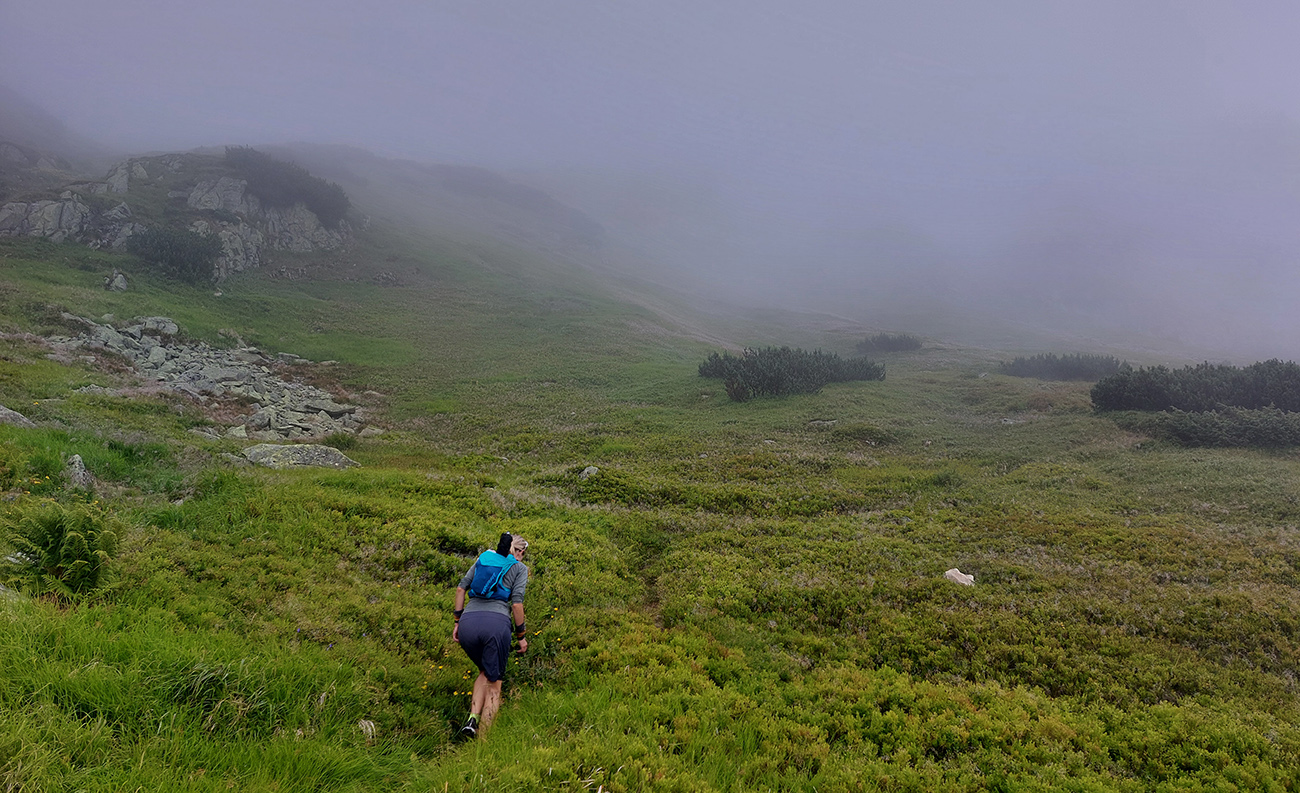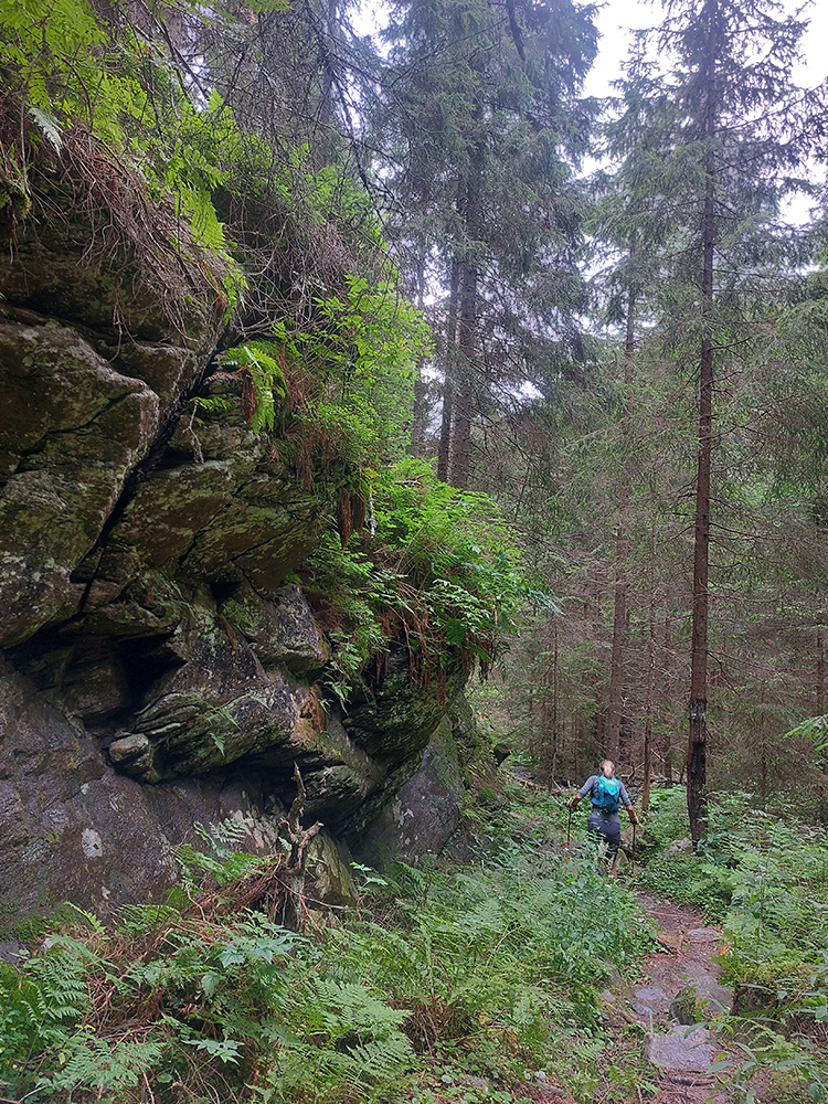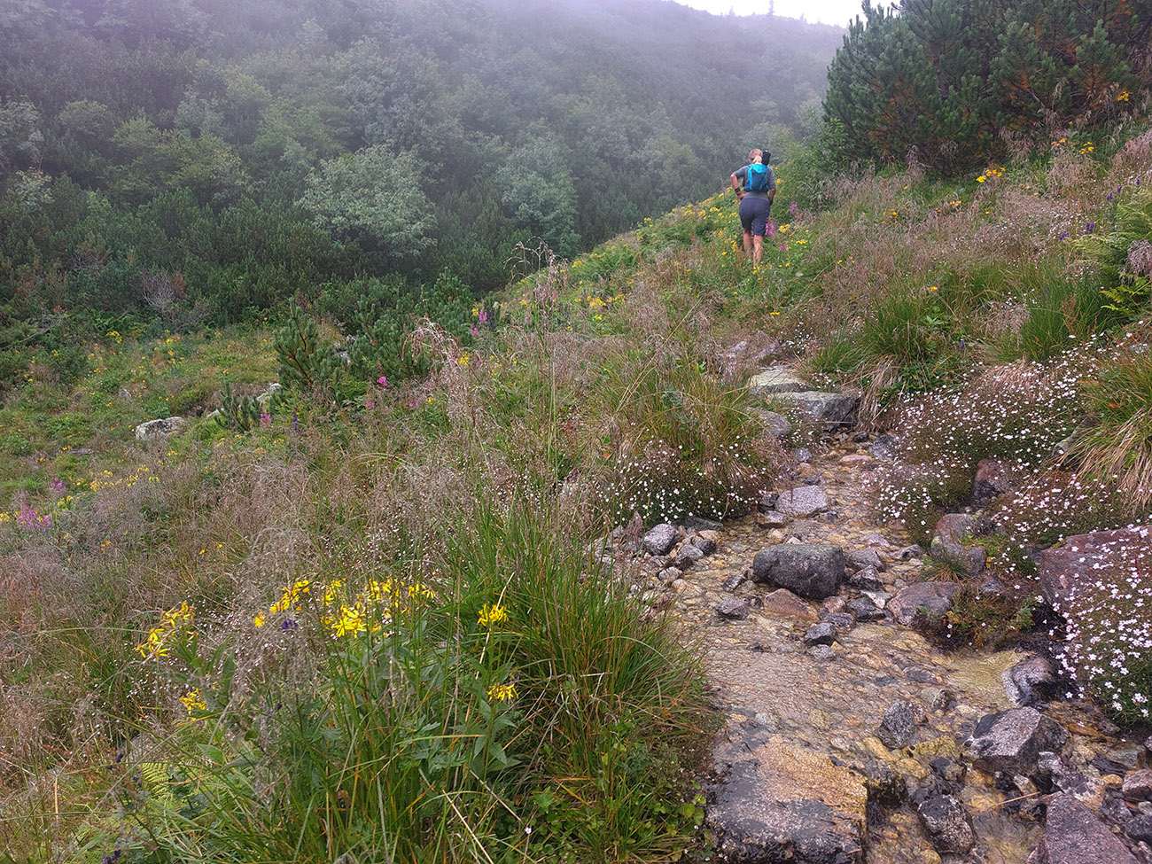Ako začína les rednúť, na chodníku sú častejšie strmé „schody“ a okolo viac tráv a malinčia. Nám hustla aj hmla, takže pri Čiernom a Bielom plese sme nedovideli ani na ich koniec. Mokrí na nohách od trávy a vyššie od kosovky sme to otočili pod serpentínou záverečného výšvihu do sedla Pálenica.