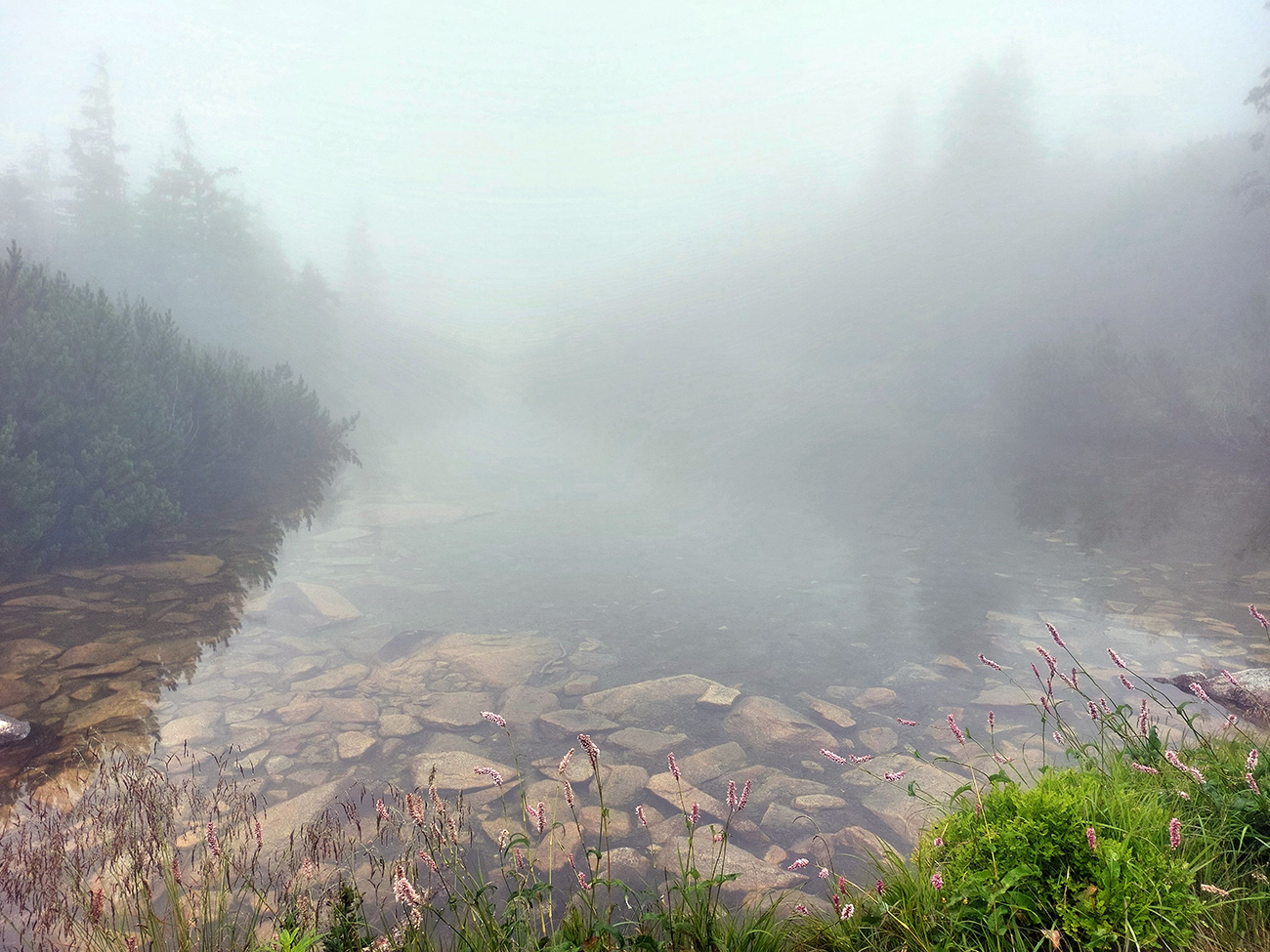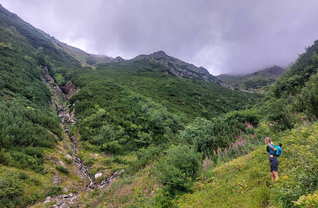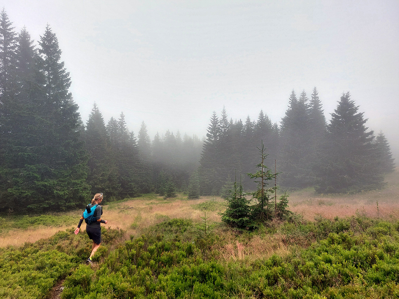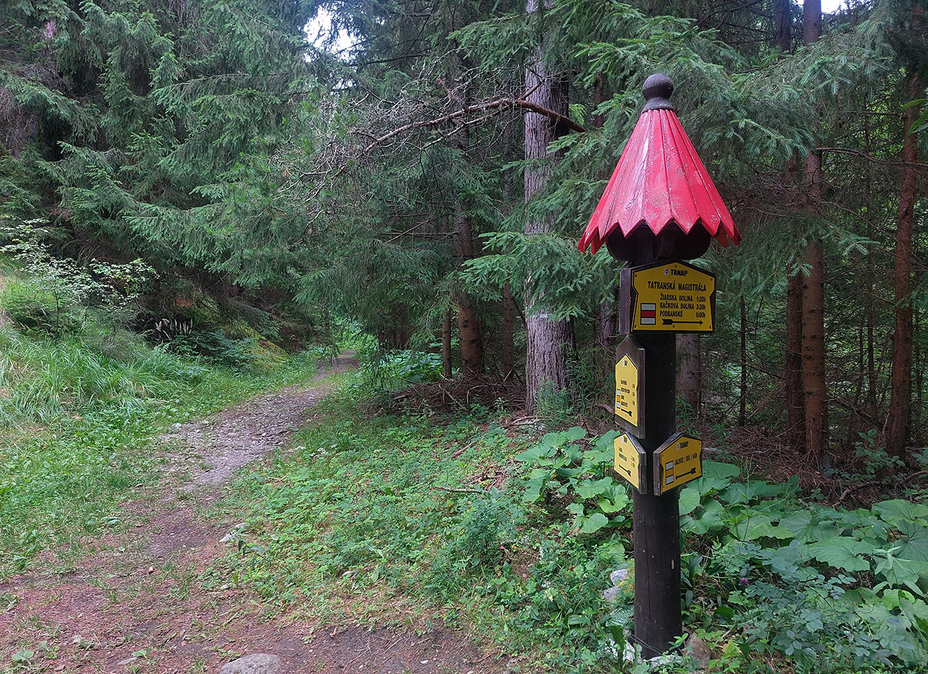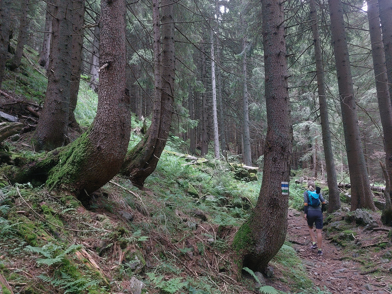 Ako začína les rednúť, na chodníku sú častejšie strmé „schody“ a okolo viac tráv a malinčia. Nám hustla aj hmla, takže pri Čiernom a Bielom plese sme nedovideli ani na ich koniec. Mokrí na nohách od trávy a vyššie od kosovky sme to otočili pod serpentínou záverečného výšvihu do sedla Pálenica.