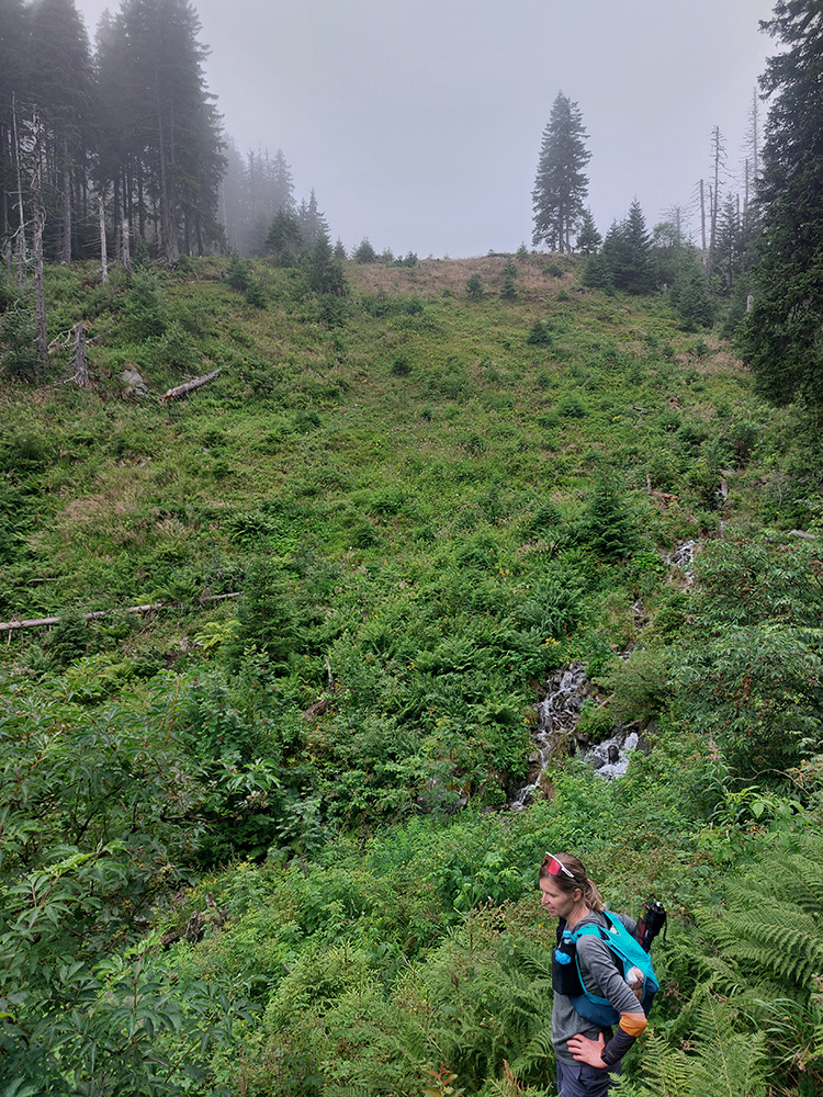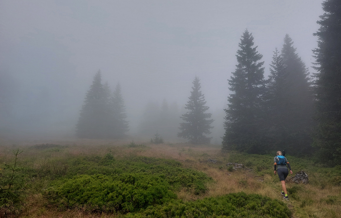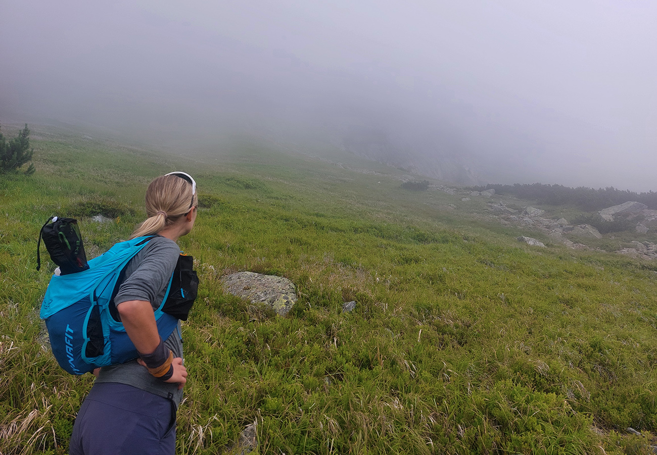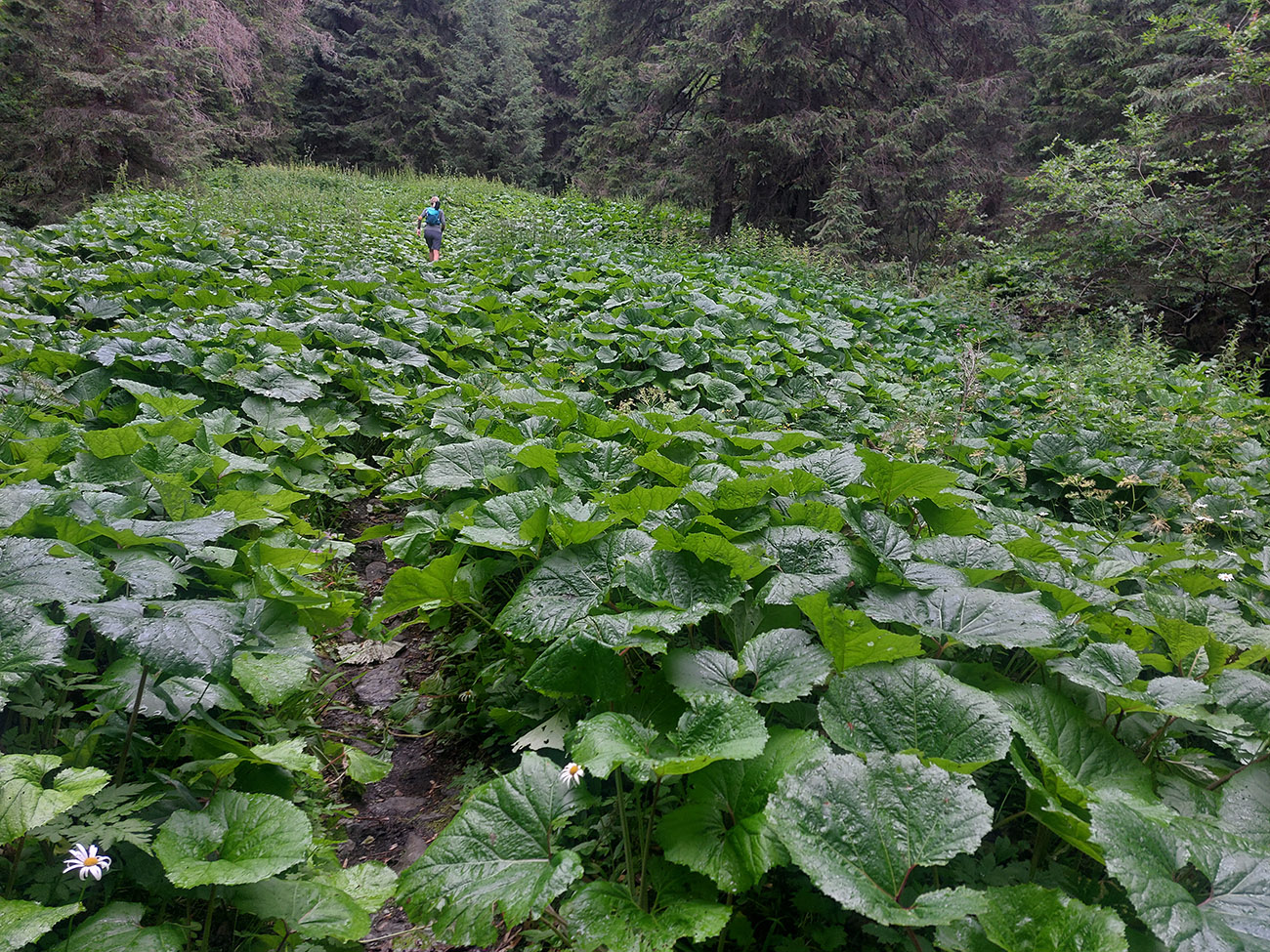 Ako začína les rednúť, na chodníku sú častejšie strmé „schody“ a okolo viac tráv a malinčia. Nám hustla aj hmla, takže pri Čiernom a Bielom plese sme nedovideli ani na ich koniec. Mokrí na nohách od trávy a vyššie od kosovky sme to otočili pod serpentínou záverečného výšvihu do sedla Pálenica.