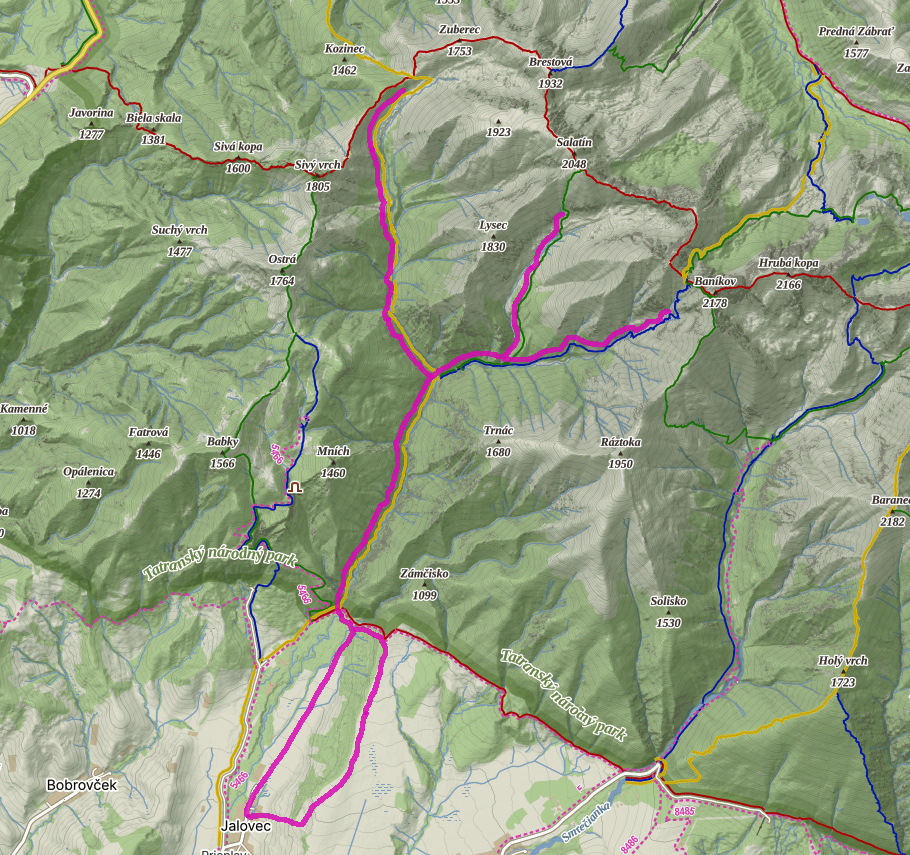 Teda len v tých, ktoré sú turistovi prístupné: Jaloveckej, Bobroveckej, Hlbokej a Parichvoste a ktoré sa pekne z jedného miesta rozvetvujú na západnom okraji TANAPu. Lebo od polovice 20. storočia tam nevedie žiadna cesta, po ktorej by sa do ich vnútra šírili lesohospodárske „výchovné zásahy“. O ich „účinnosti“ v porovnaní s tými prírodnými je viac v skvelej reportáži Andreja Baráta TU - aj v súvislosti s jarným požiarom v Jaloveckej doline. Zatiaľ však len turistické chodníky vedú tade hore na hrebeň. Väčšinou som niektorou z dolín iba prechádzal (odkazy sú dole). Tentokrát som si ich chcel prejsť všetky naraz, smerom hore aj dolu - s tým, že až na hrebeň sa štverať nebudem, že si vychutnám práve len tú dolinovú divočinu. A čakal som na ten správny deň, keď bude hrebeň v mrakoch a vetroch, aby nelákal. Navyše sa vyskytla „miestna sprievodkyňa“, studený front akurát odchádzal, slovo dalo slovo a išlo sa. Takáto (fialová) vidlička z toho vznikla: