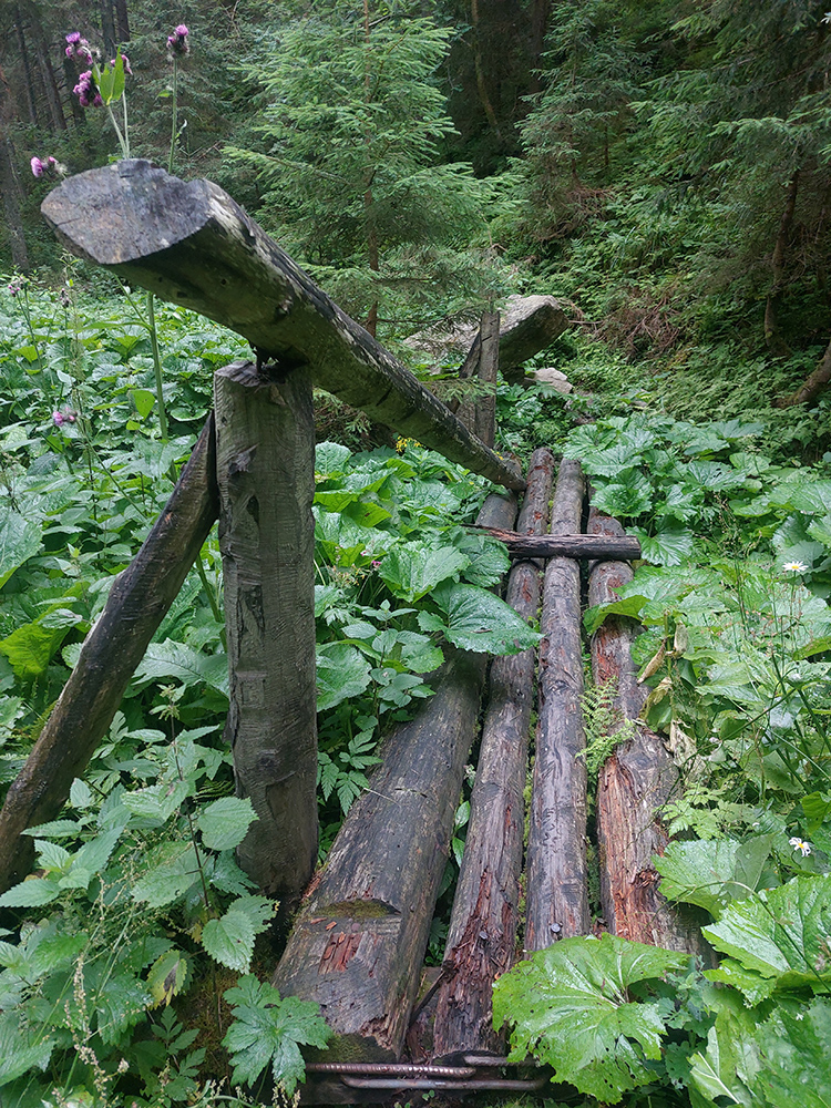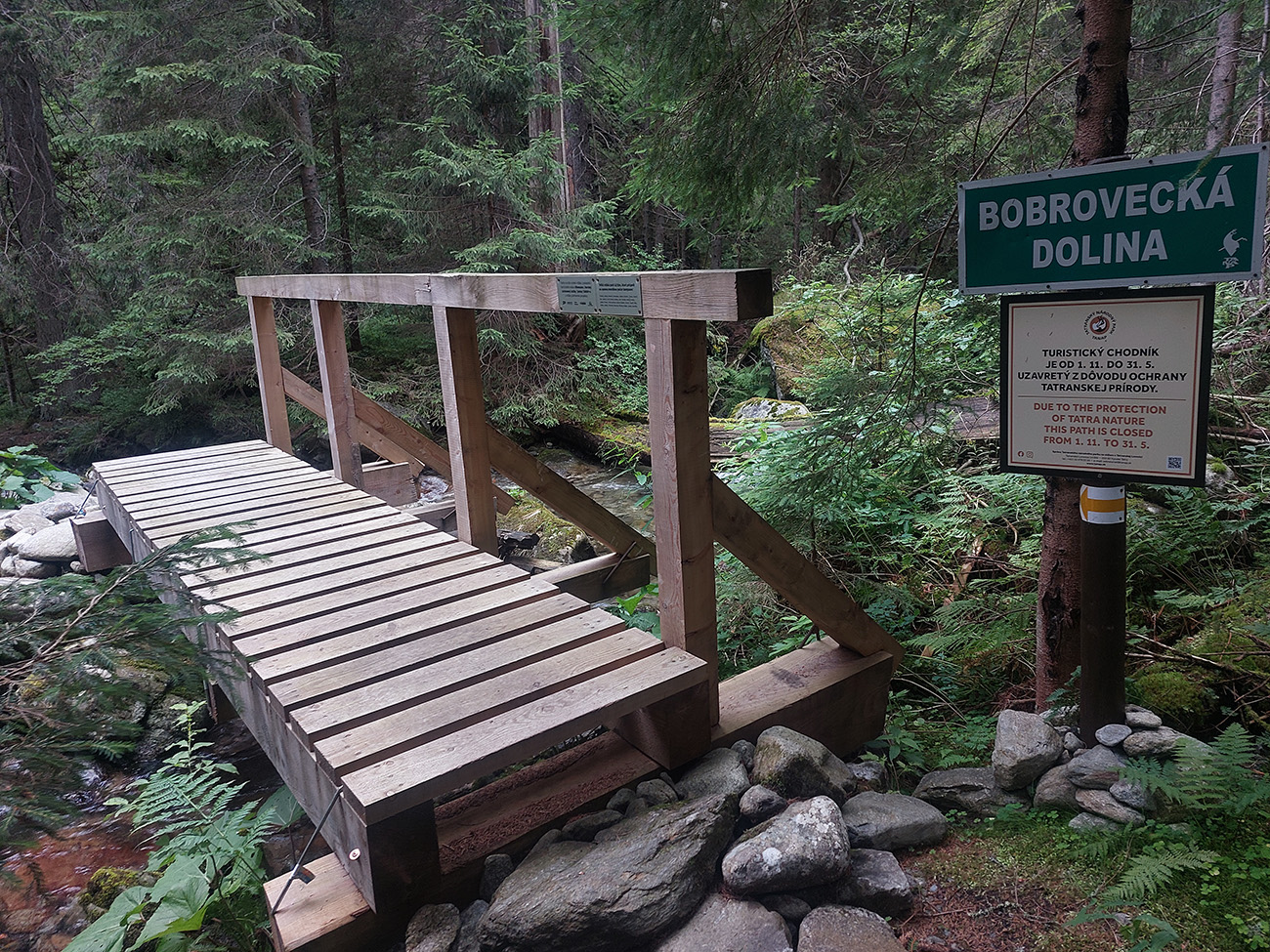 Tak najskôr doľava, stále po žltej, ale to už je Bobrovecká dolina. Začína dvoma novými mostíkmi, vyššie sú staré mostíky často pováľané, ale potok sa dá vždy nejako preskákať, už je malý. Chodník už je divokejší, užší, viac zarastený, aj voda z prameňov po ňom občas tečie. Vyššie na sútoku potokov si treba dať pozor – značka vedie vľavo takmer potokom, starý chodník (suchšou nohou) doprava do svahu, ale postupne sa stráca. Okolo už je viac „zožratého“ lesa. Ale tých čučoriedok čo bolo!